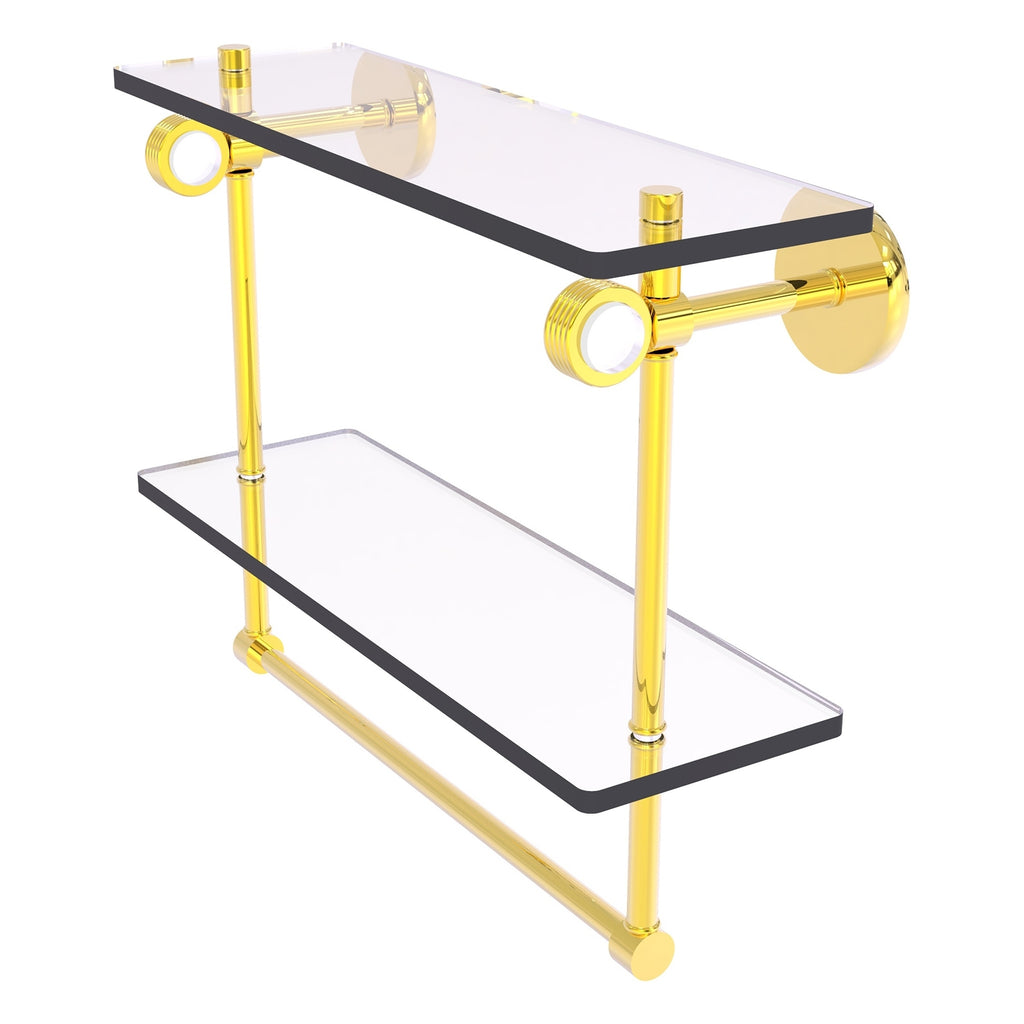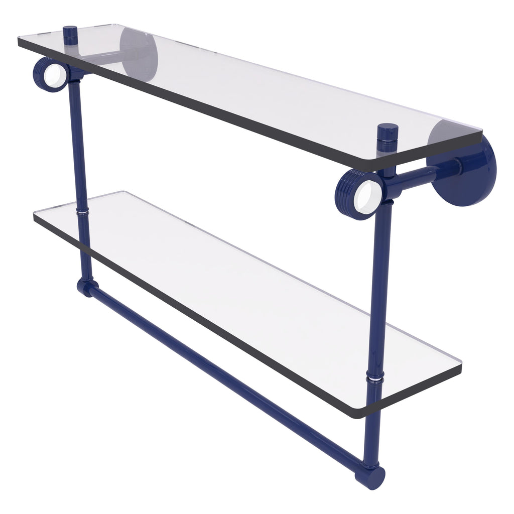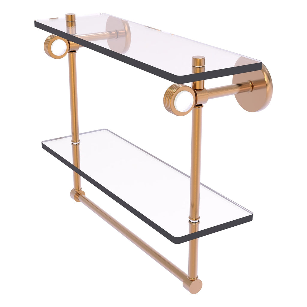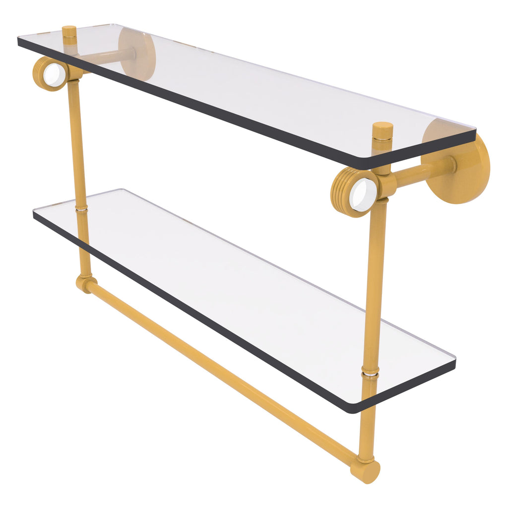 Add a beautiful focal point to your bathroom with this elegant and functional double glass shelf unit. It's clean contemporary design with acrylic accents will compliment your decor as it's integrated towel bar underneath is perfect for hanging hand towels. Having two shelves offers plenty of space for storing and displaying your items. Made from all solid brass this decorative shelf will provide a lifetime of use.