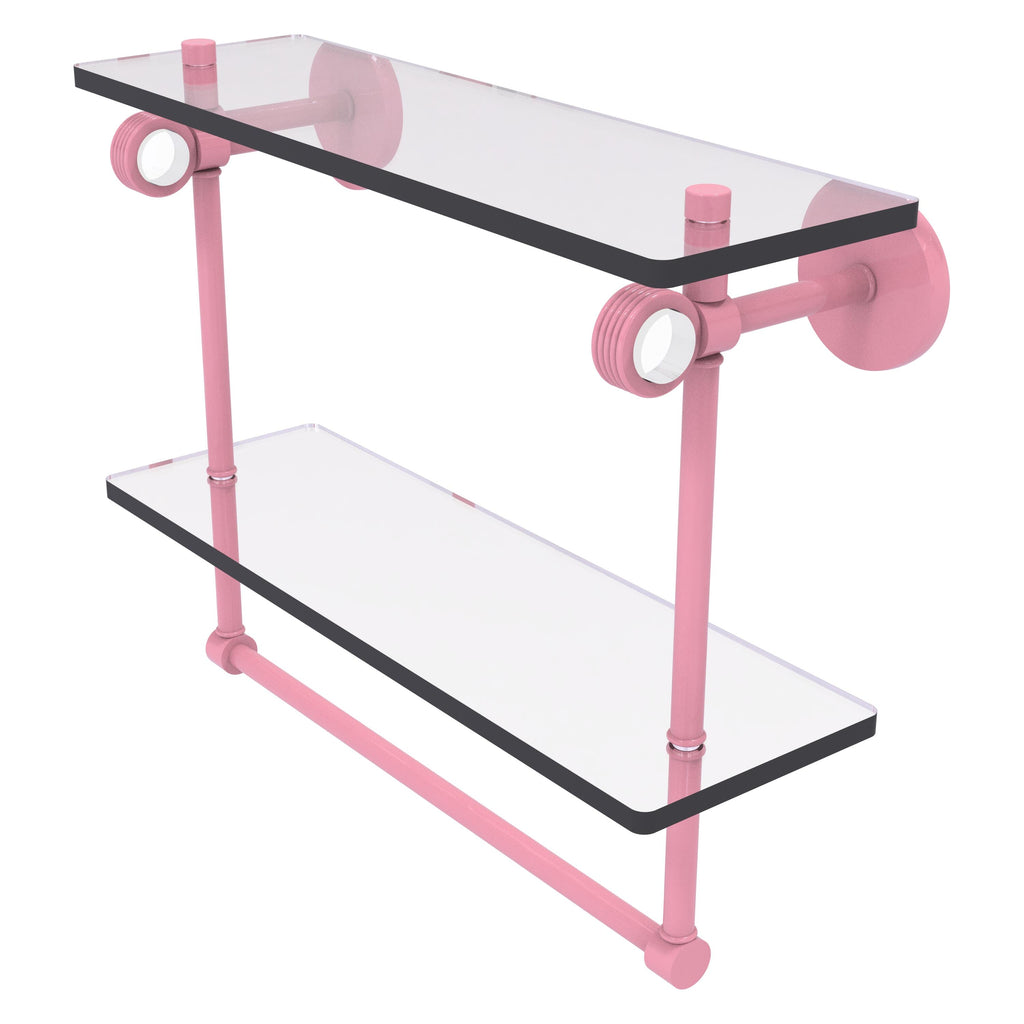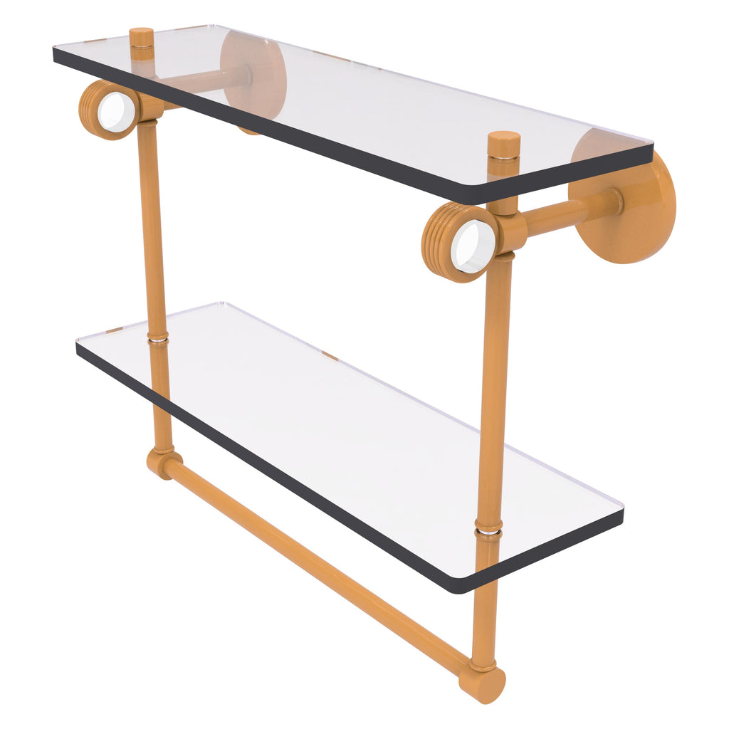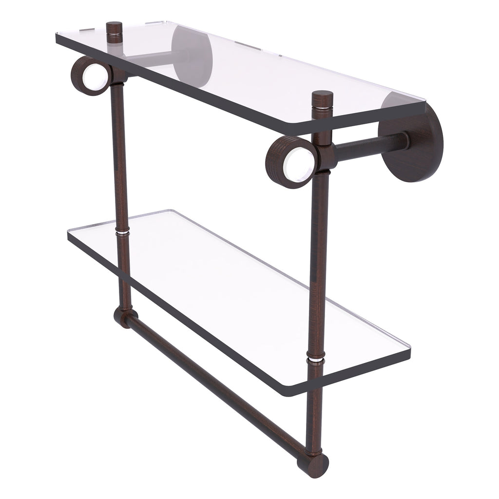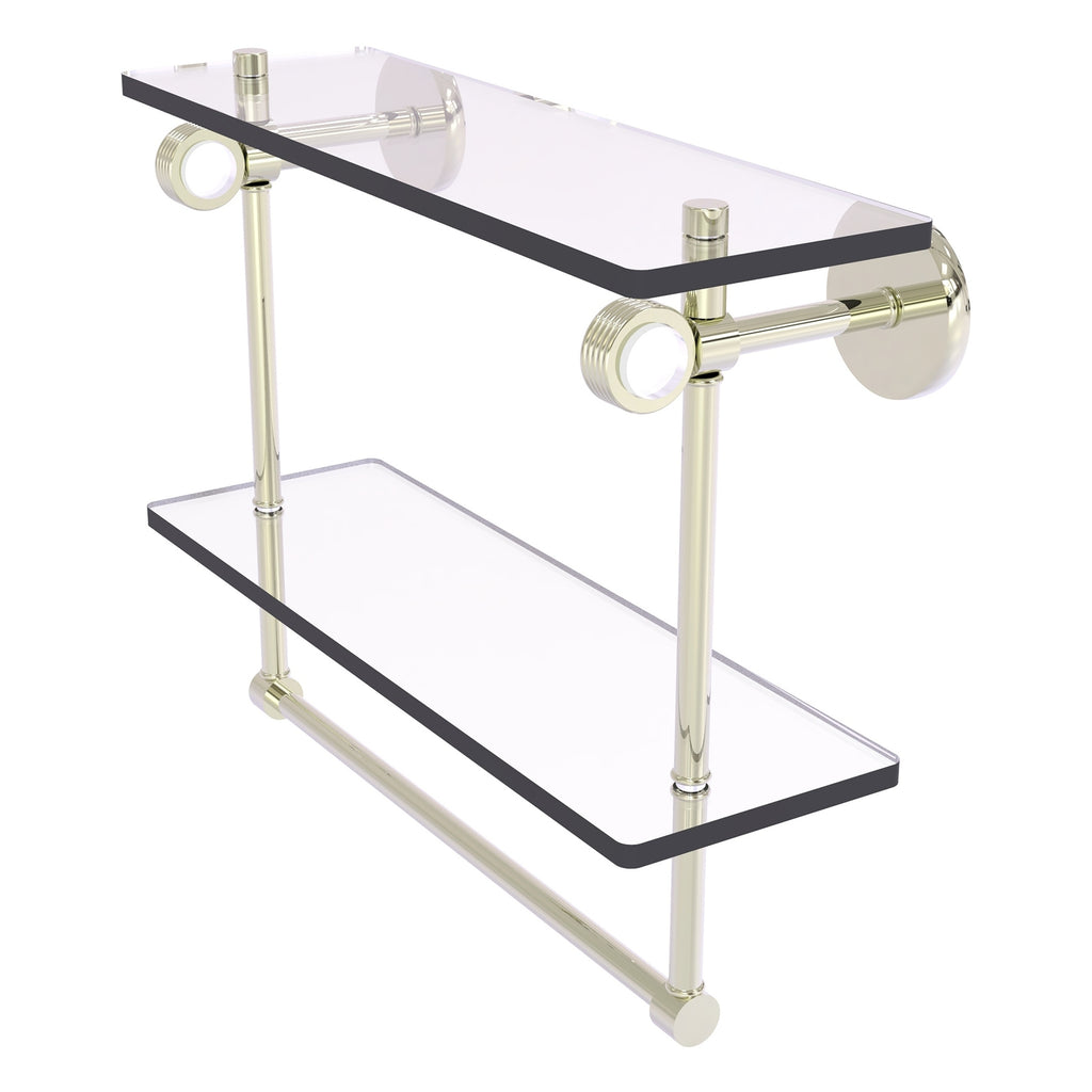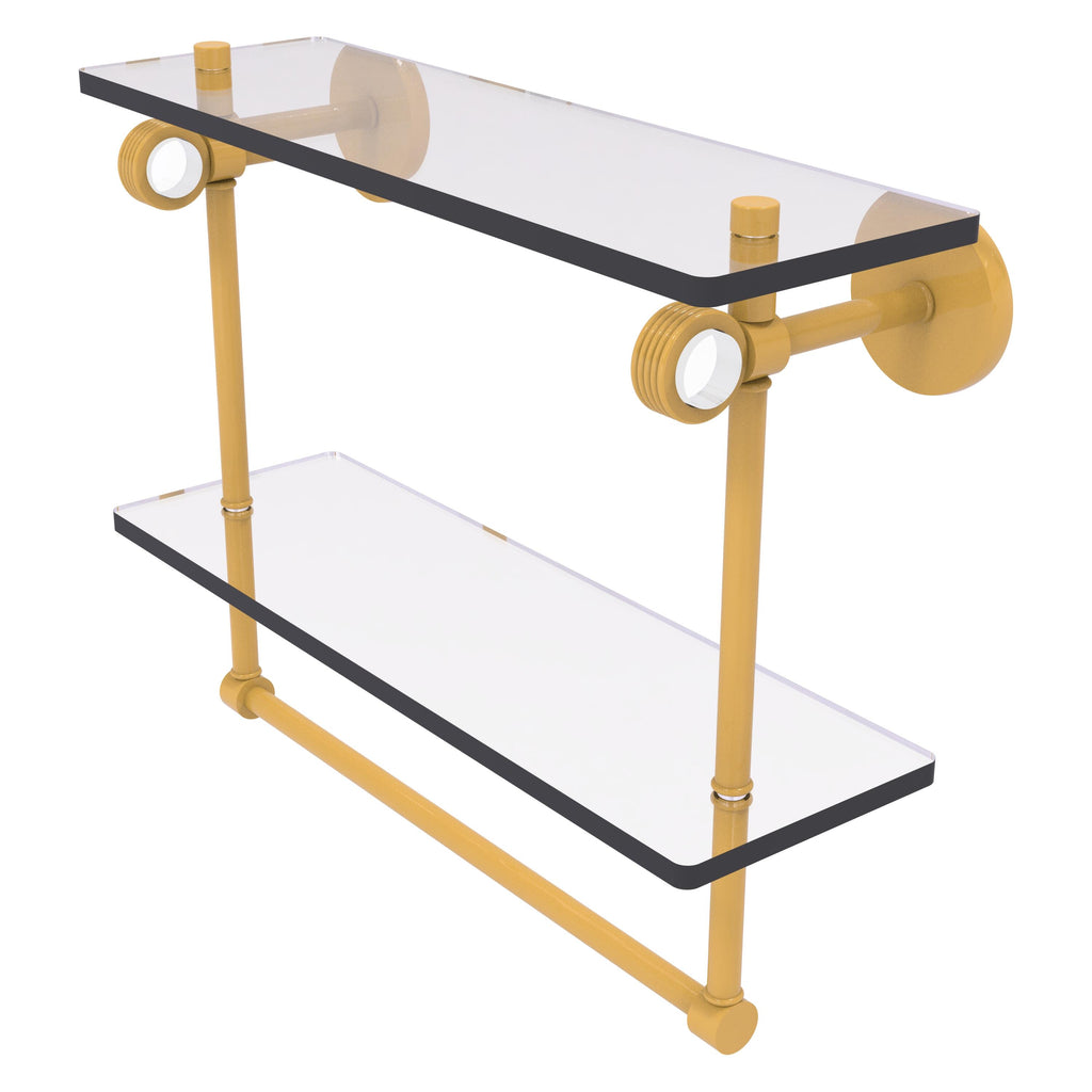 Add a beautiful focal point to your bathroom with this elegant and functional double glass shelf unit. It's clean contemporary design with acrylic accents will compliment your decor as it's integrated towel bar underneath is perfect for hanging hand towels. Having two shelves offers plenty of space for storing and displaying your items. Made from all solid brass this decorative shelf will provide a lifetime of use.