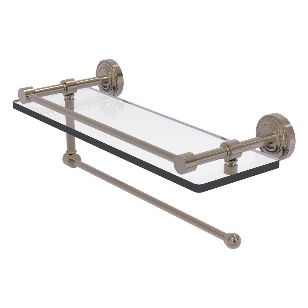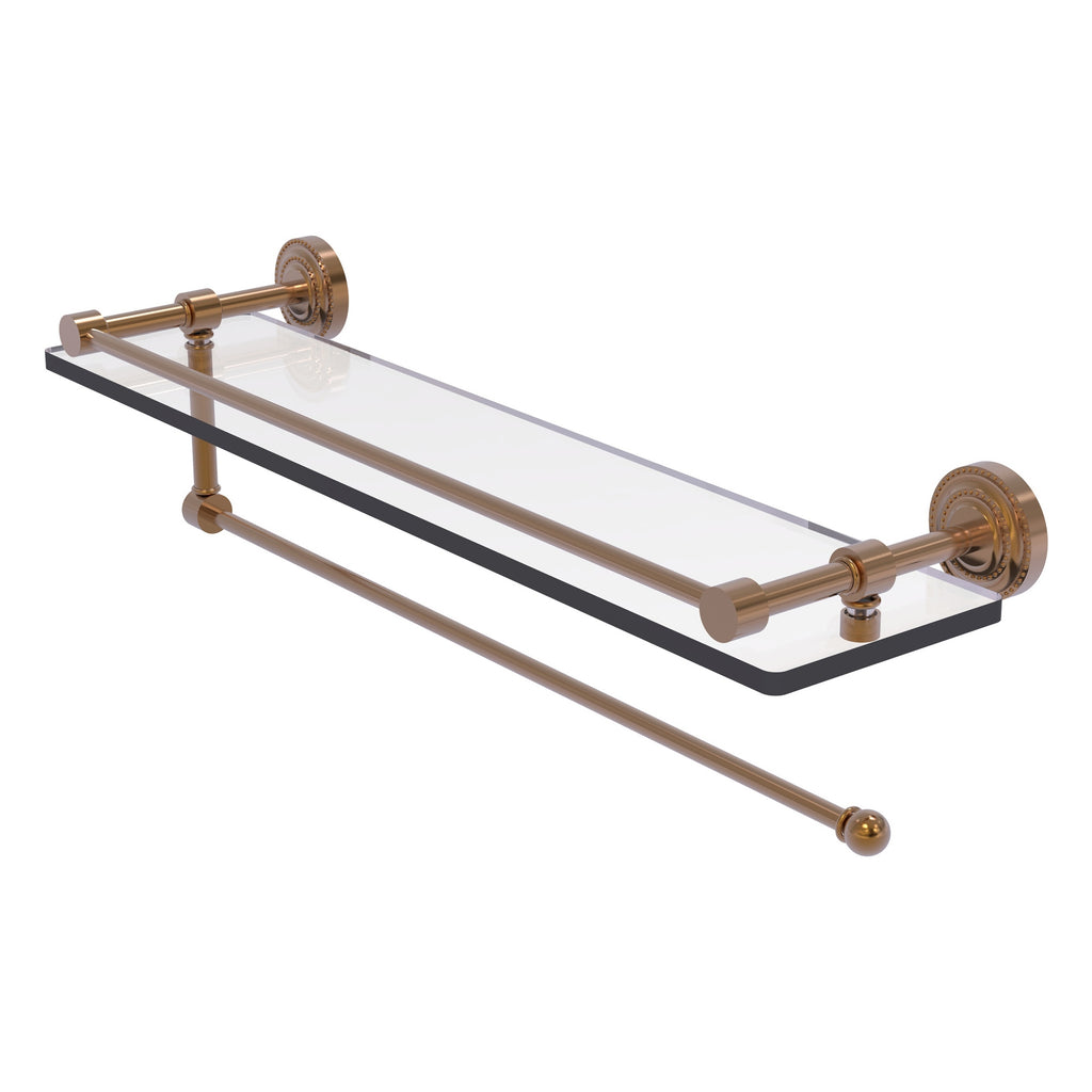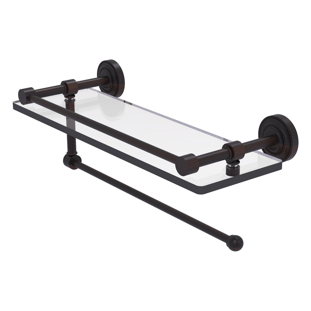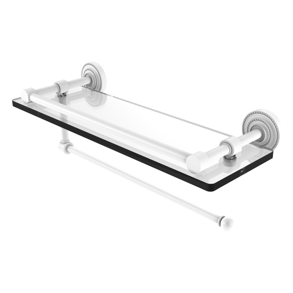 Maximize space and efficiency with this beautiful glass shelf and paper towel holder combination. Gallery rail will keep your items secure while the integrated paper towel holder provides a creative space for your roll. Made of solid brass and tempered