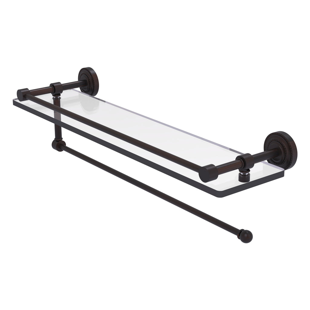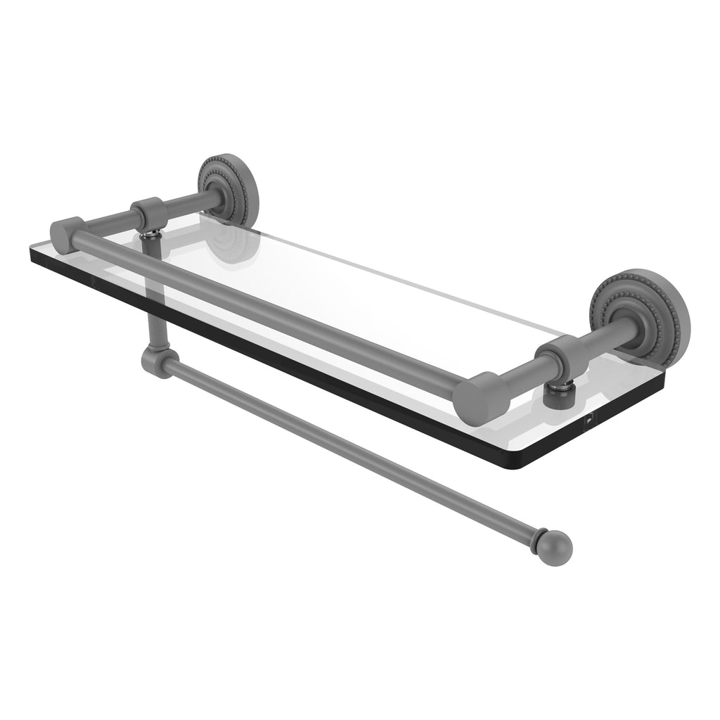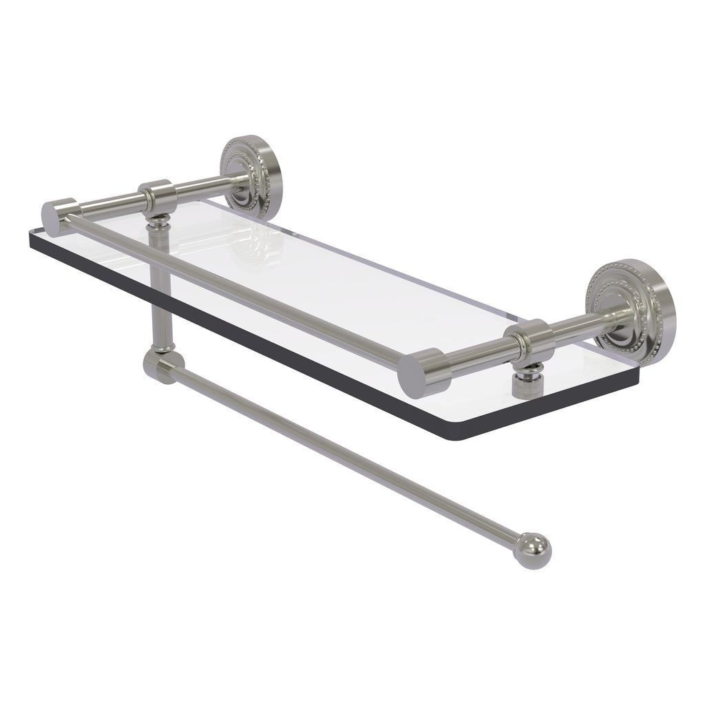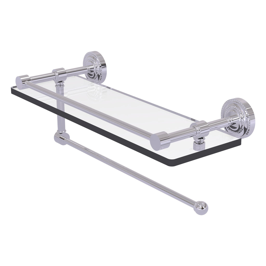 Maximize space and efficiency with this beautiful glass shelf and paper towel holder combination. Gallery rail will keep your items secure while the integrated paper towel holder provides a creative space for your roll. Made of solid brass and tempered