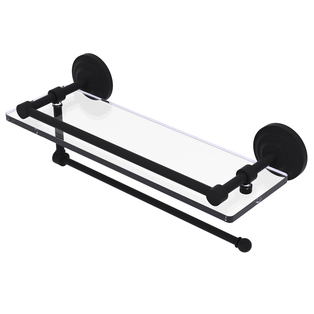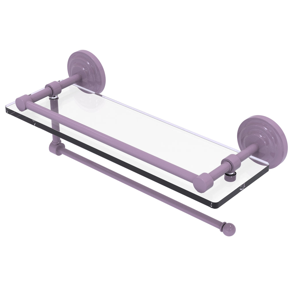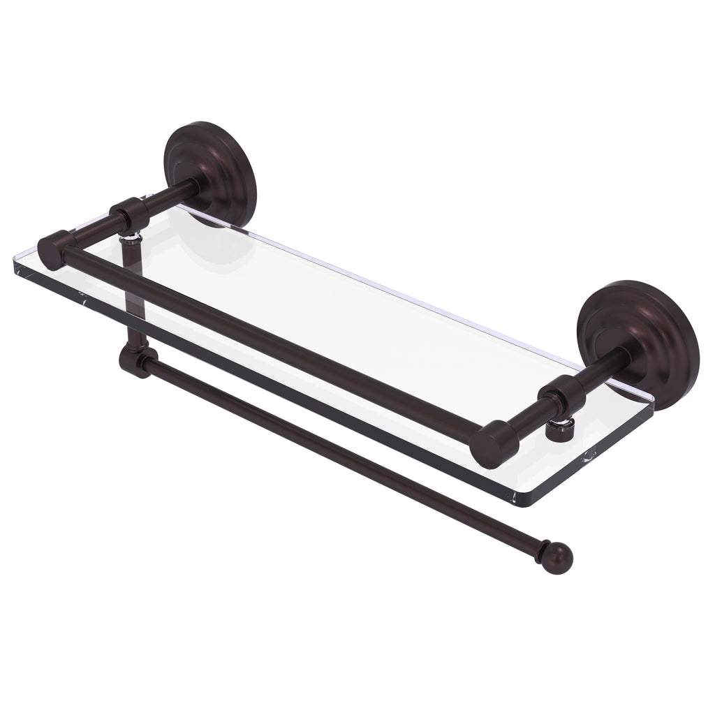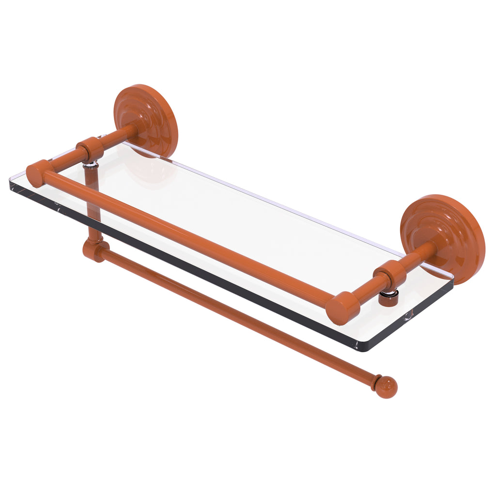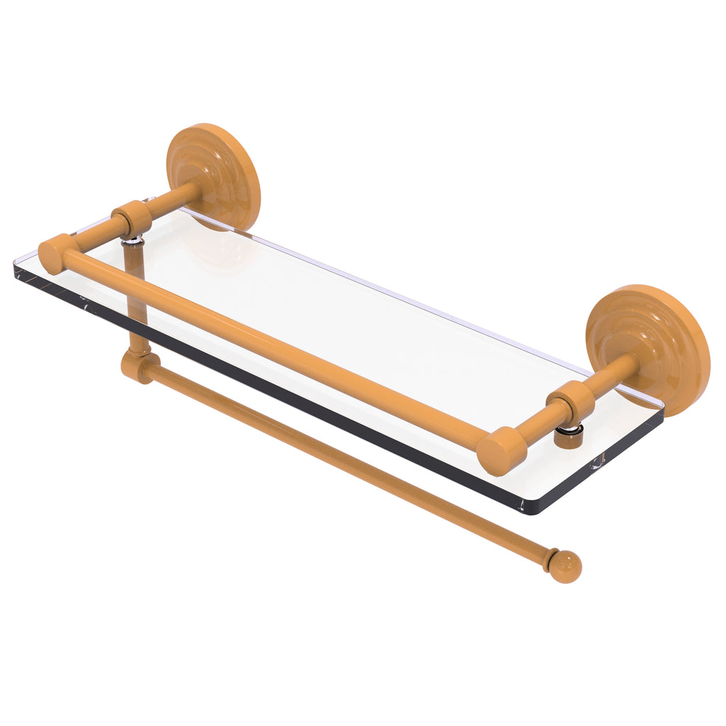 Maximize space and efficiency with this beautiful glass shelf and paper towel holder combination. Gallery rail will keep your items secure while the integrated paper towel holder provides a creative space for your roll. Made of solid brass and tempered