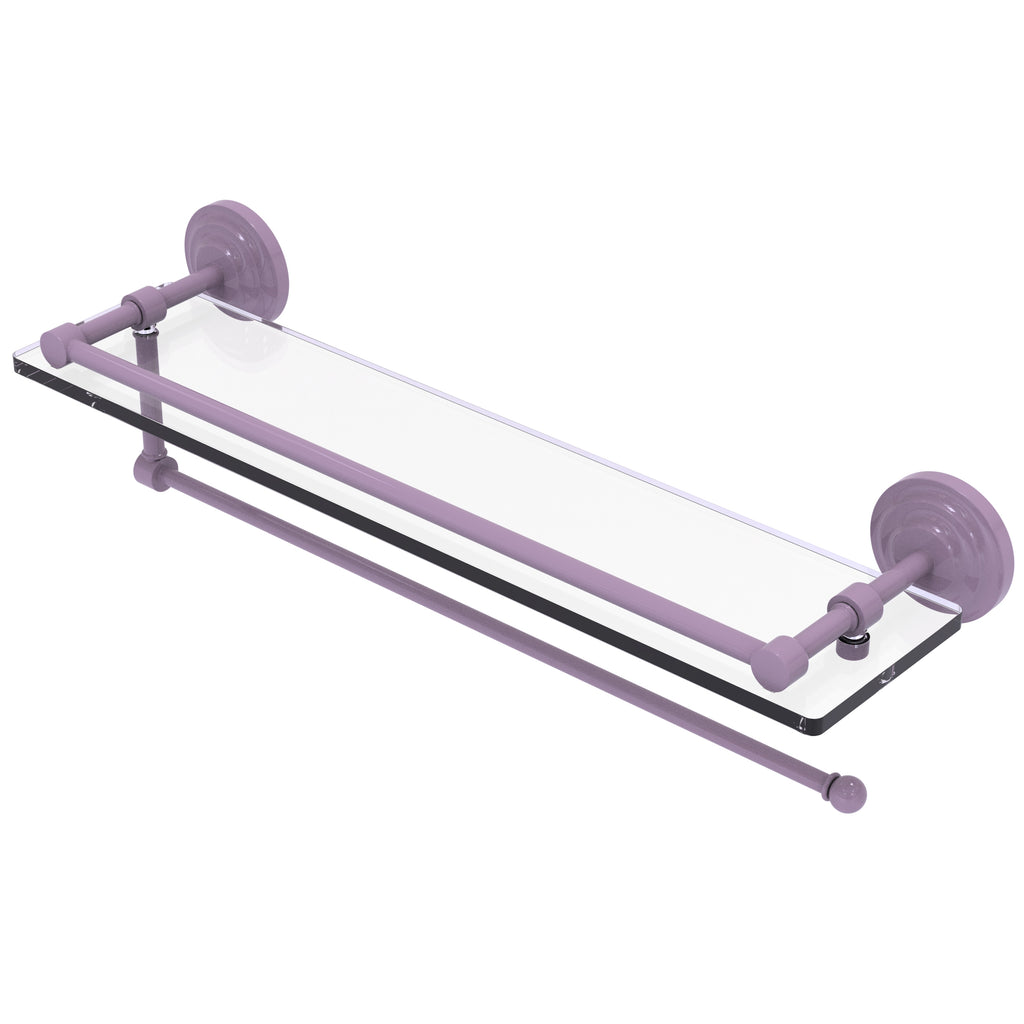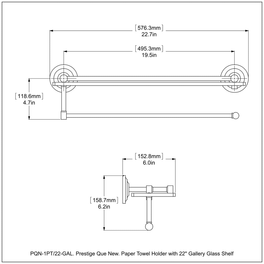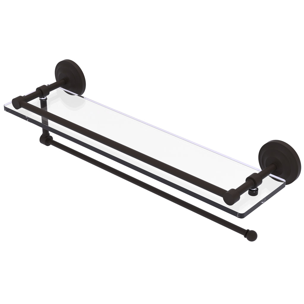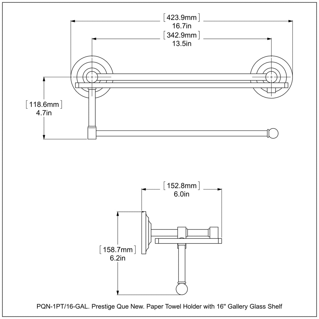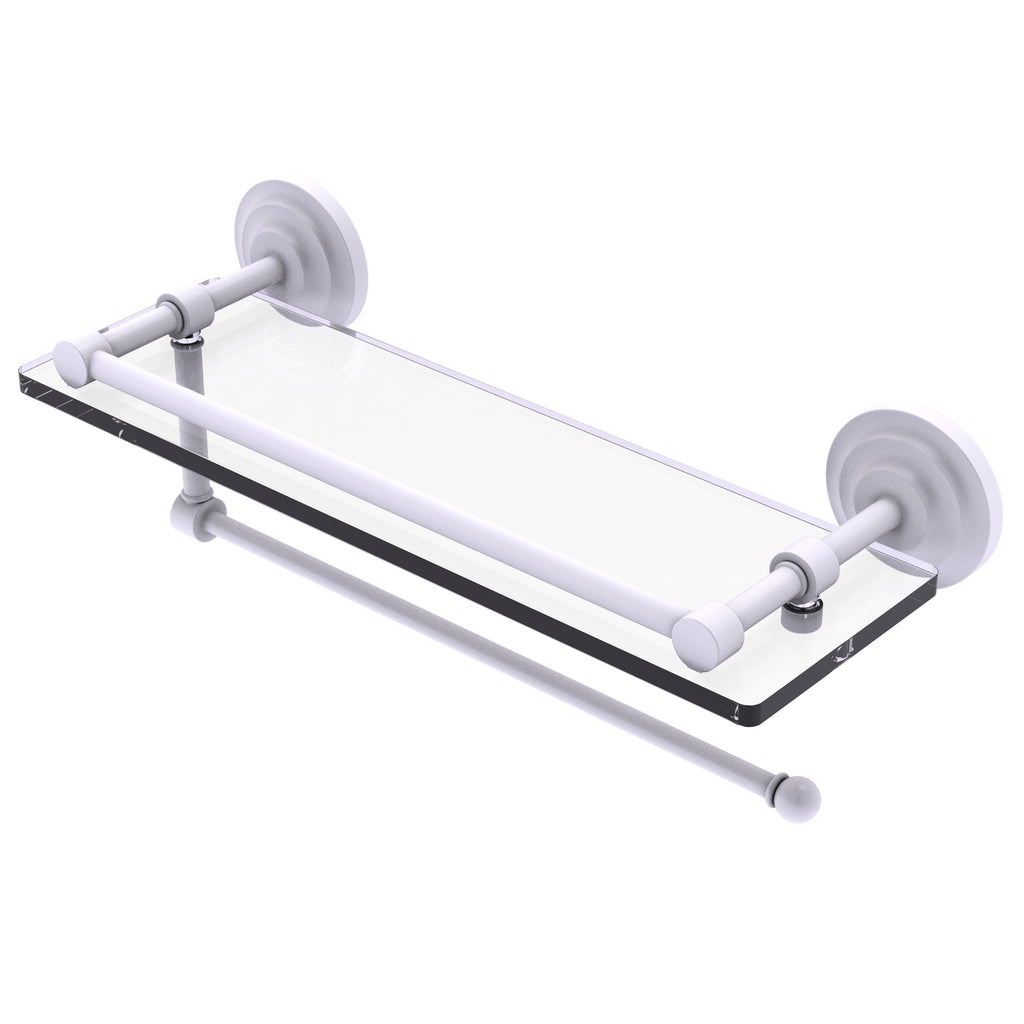Maximize space and efficiency with this beautiful glass shelf and paper towel holder combination. Gallery rail will keep your items secure while the integrated paper towel holder provides a creative space for your roll. Made of solid brass and tempered