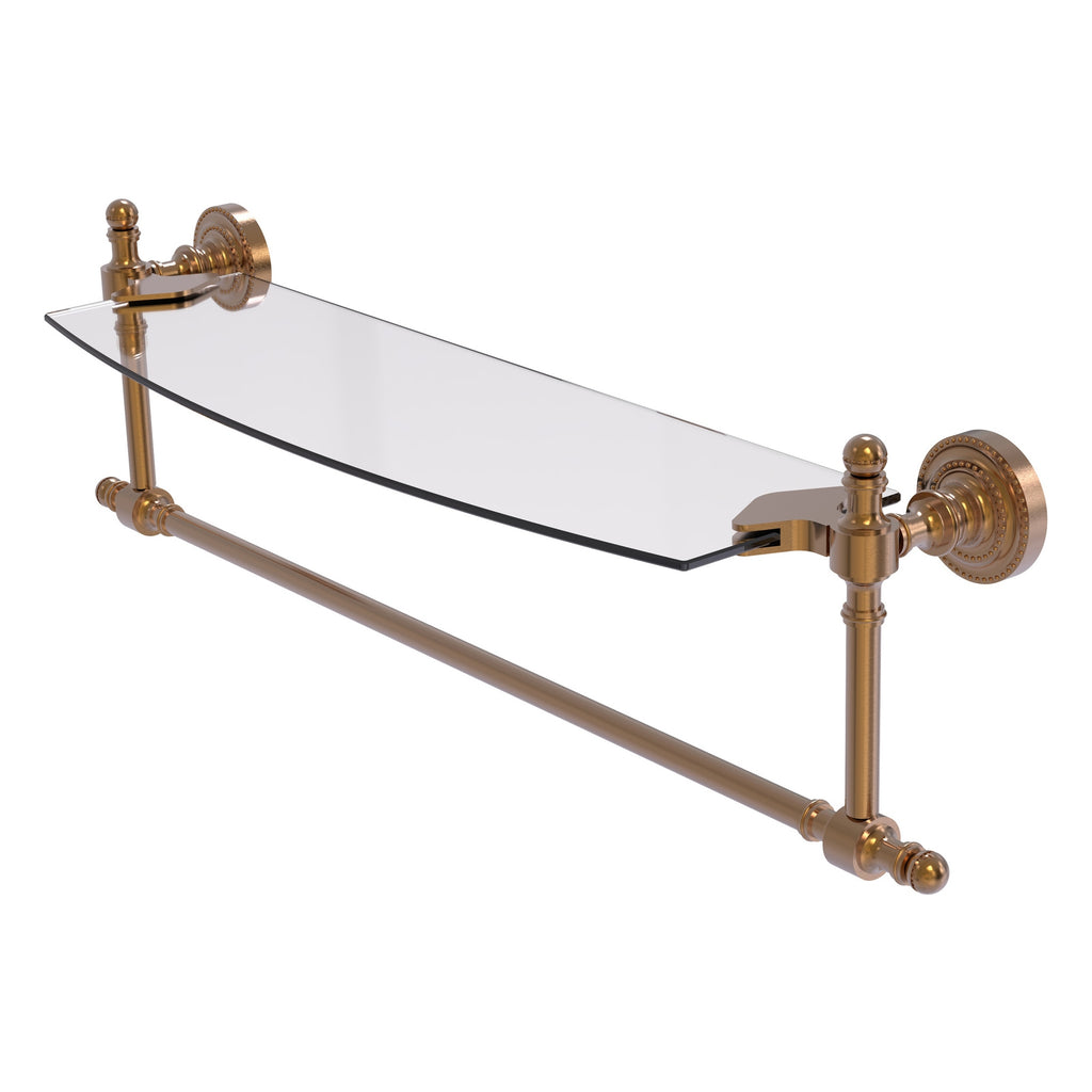 Add space and organization to your bathroom with this simple, contemporary style glass shelf. Featuring tempered, beveled-edged glass and solid brass hardware this shelf is crafted for durability, strength and style. Integrated towel bar provides space for your favorite decorative towels or for your everyday use. One of the many coordinating accessories in the Allied Brass Collection of products, this subtle glass shelf is the perfect complement to your bathroom decor.
