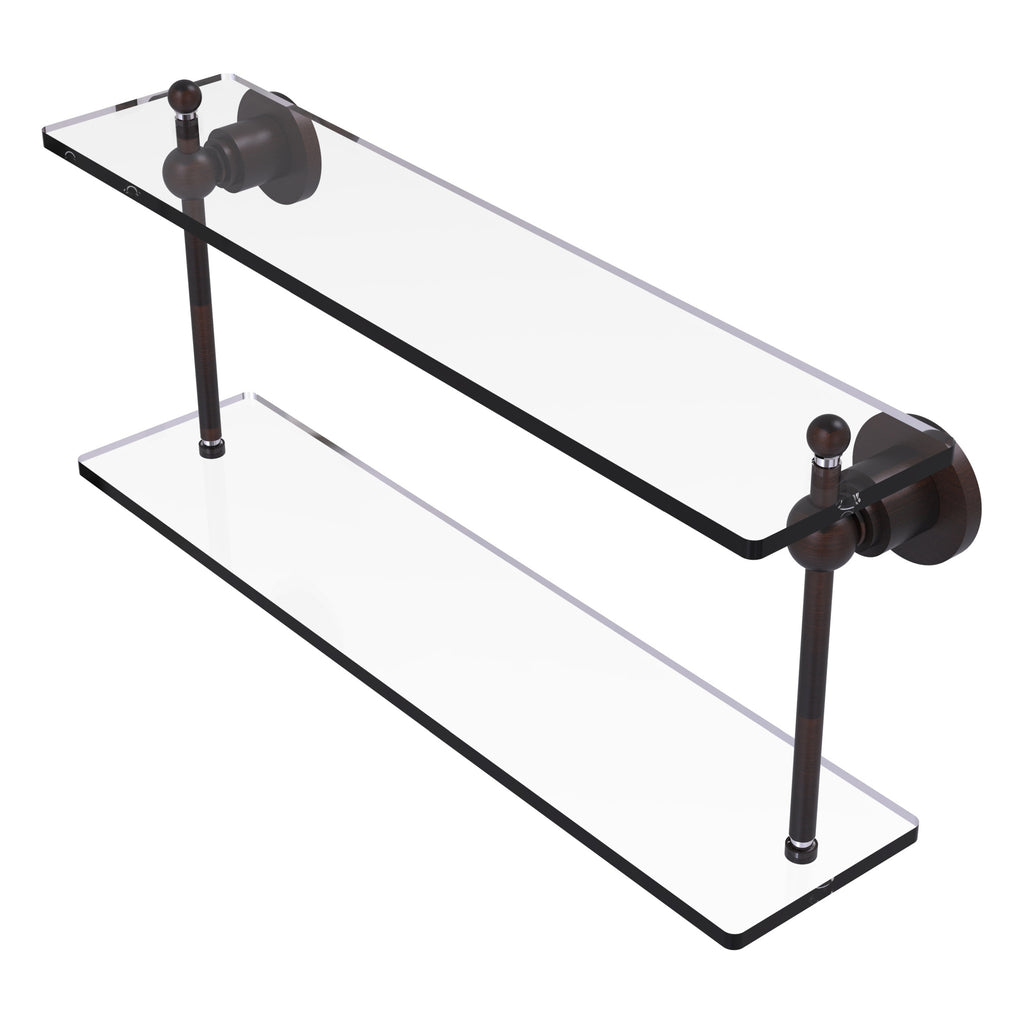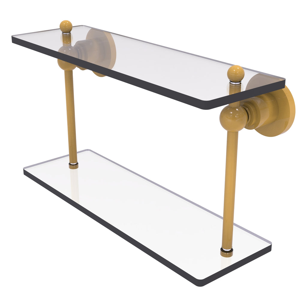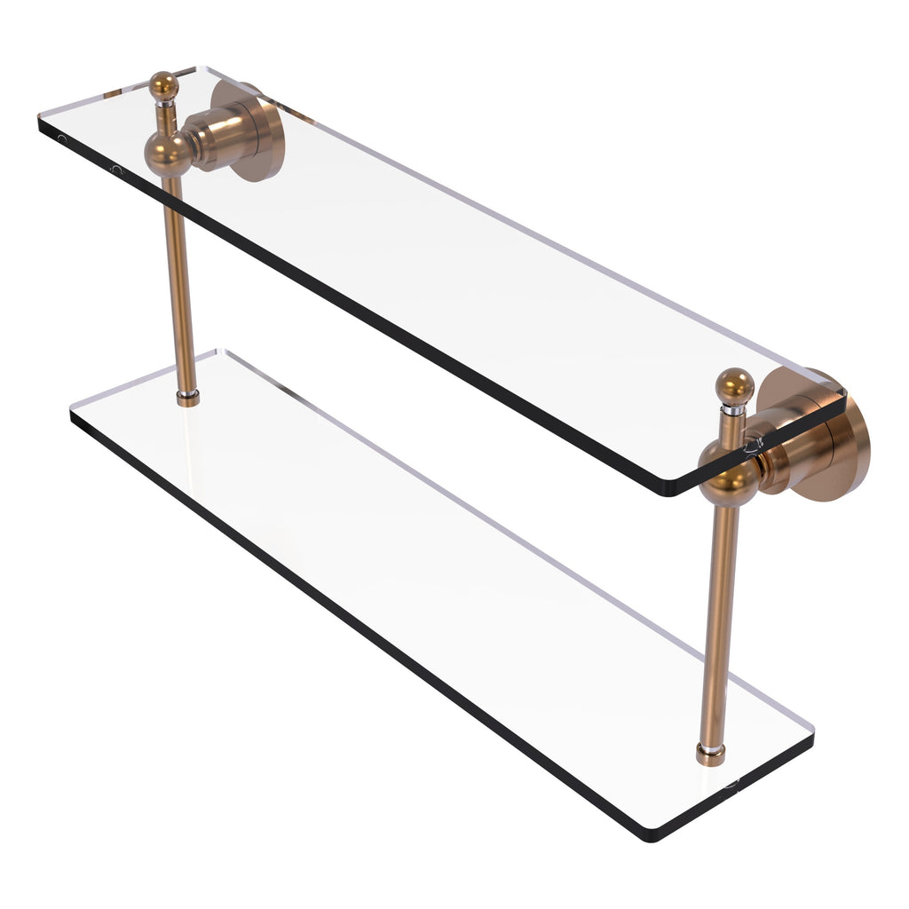Add space and organization to your bathroom with this simple, contemporary design 2-tier glass vanity shelf. Featuring tempered, beveled-edged glass and solid brass hardware this shelving unit is crafted for durability, strength and style. One of the many coordinating accessories in the Allied Brass collection of products, this subtle glass shelf unit is the perfect complement to your bathroom decor.