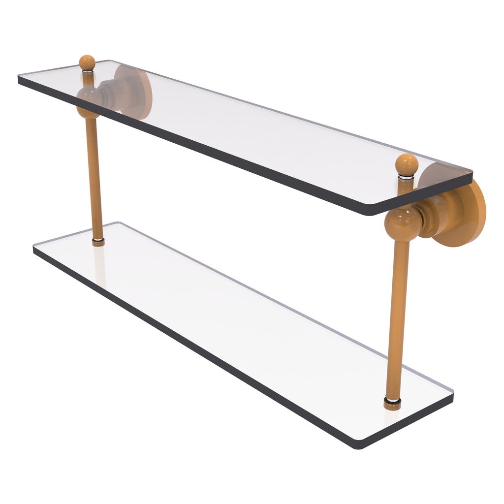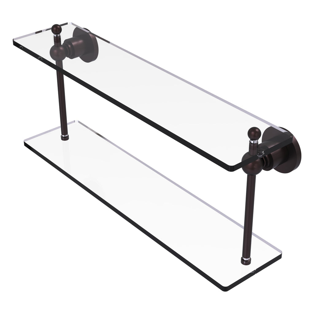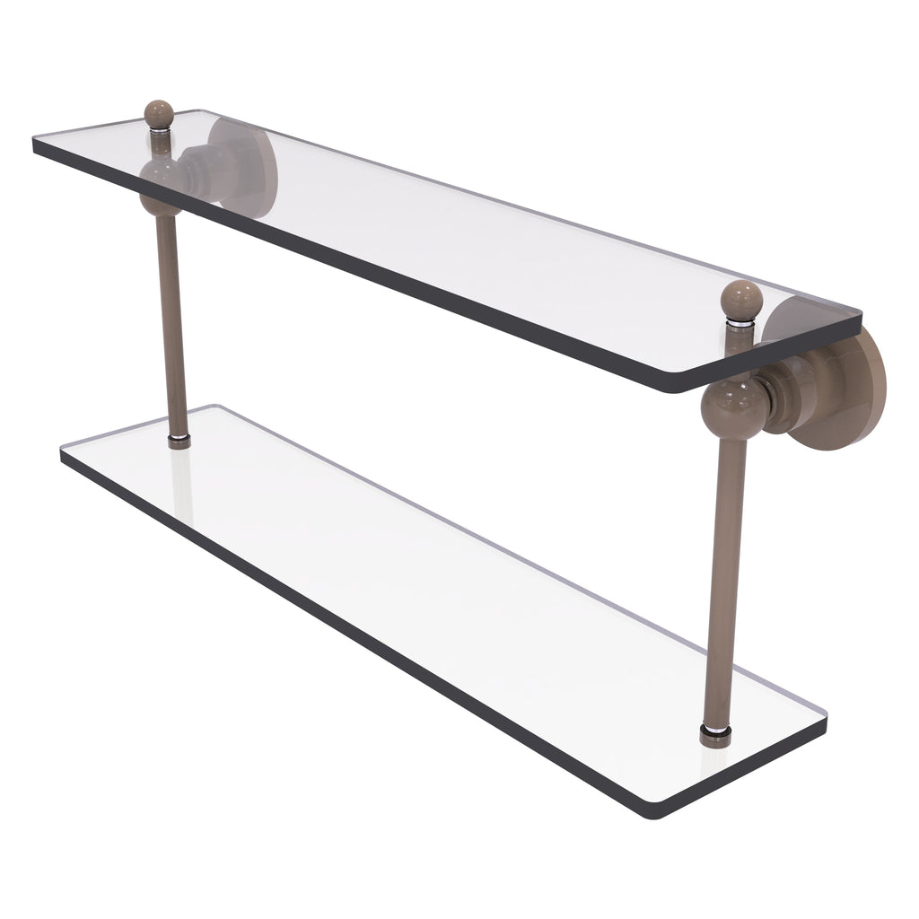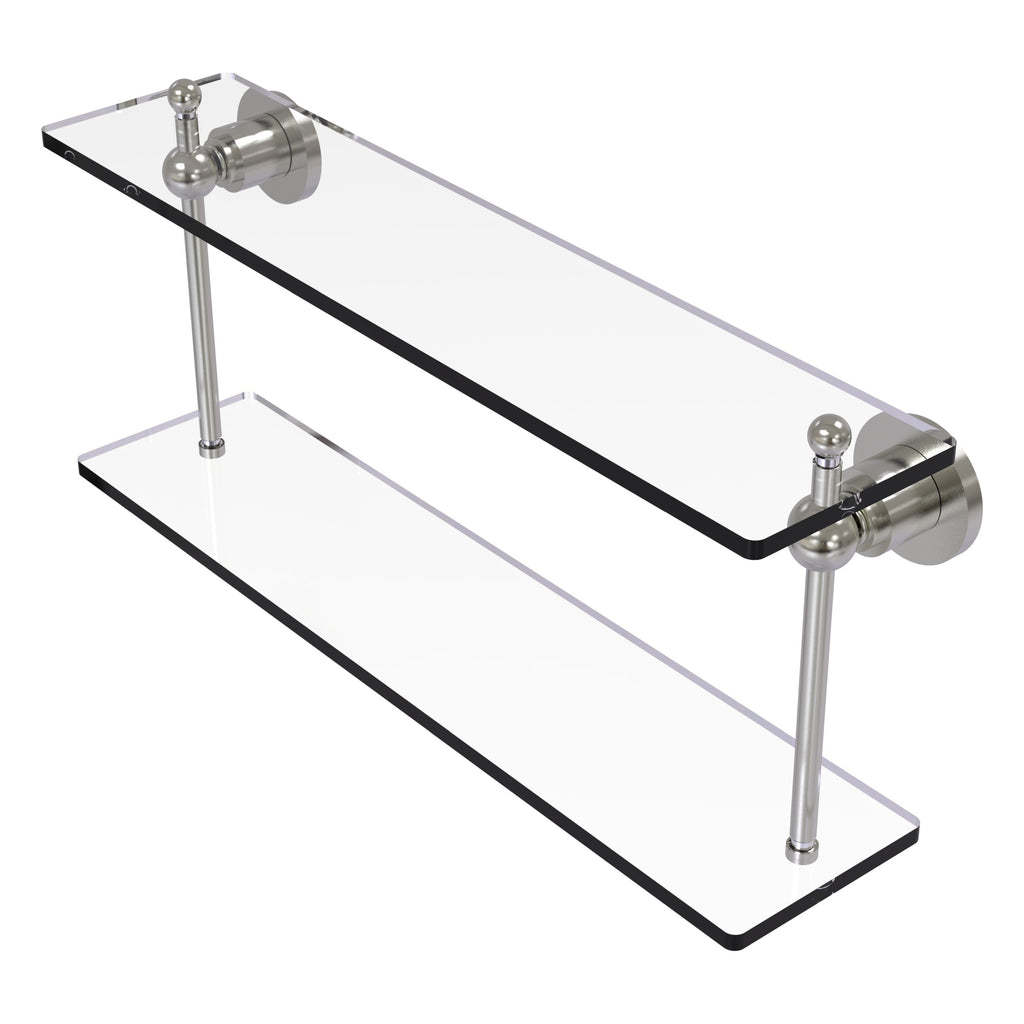 Add space and organization to your bathroom with this simple, contemporary design 2-tier glass vanity shelf. Featuring tempered, beveled-edged glass and solid brass hardware this shelving unit is crafted for durability, strength and style. One of the many coordinating accessories in the Allied Brass collection of products, this subtle glass shelf unit is the perfect complement to your bathroom decor.