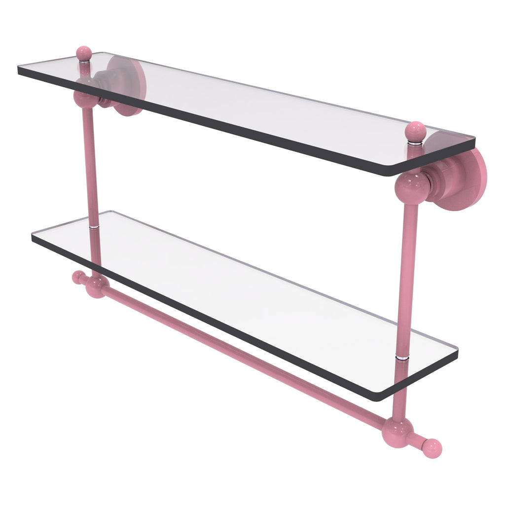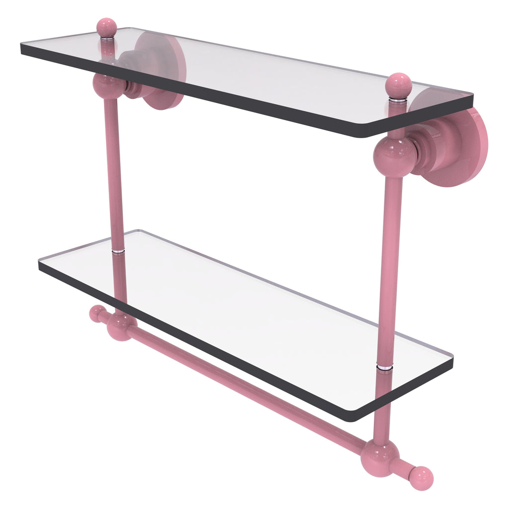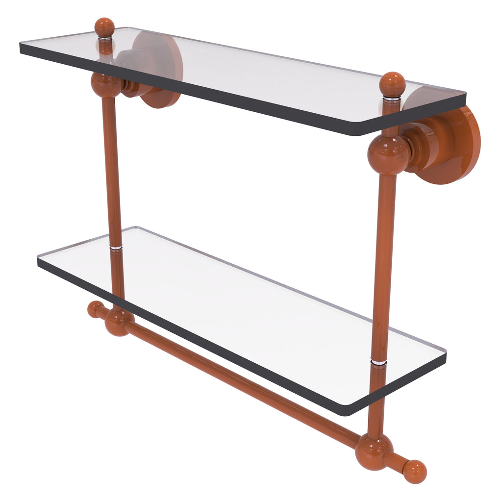 Add space and organization to your bathroom with this simple, contemporary style glass shelf. Featuring tempered, beveled-edged glass and solid brass hardware this shelf is crafted for durability, strength and style. Integrated towel bar provides space for your favorite decorative towels or for your everyday use. One of the many coordinating accessories in the Allied Brass Collection of products, this subtle glass shelf is the perfect complement to your bathroom decor.