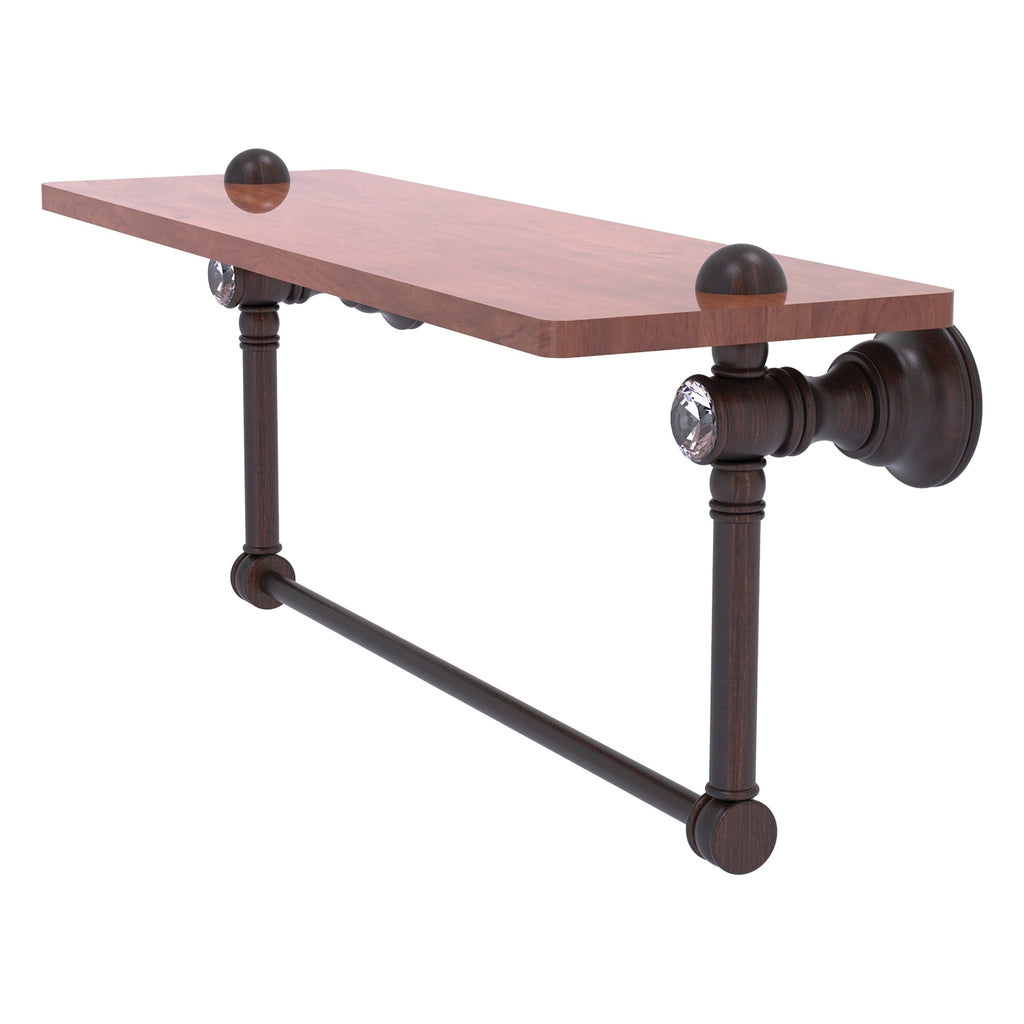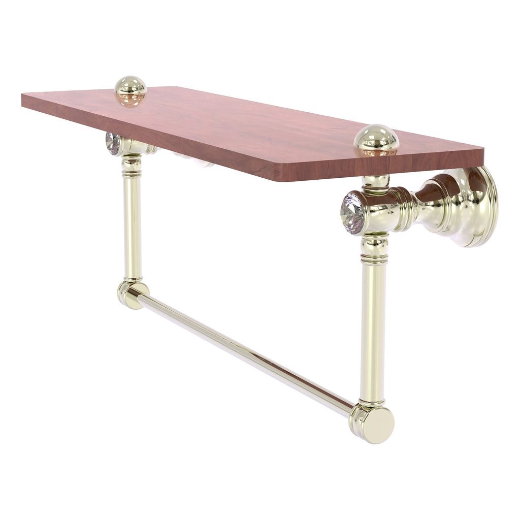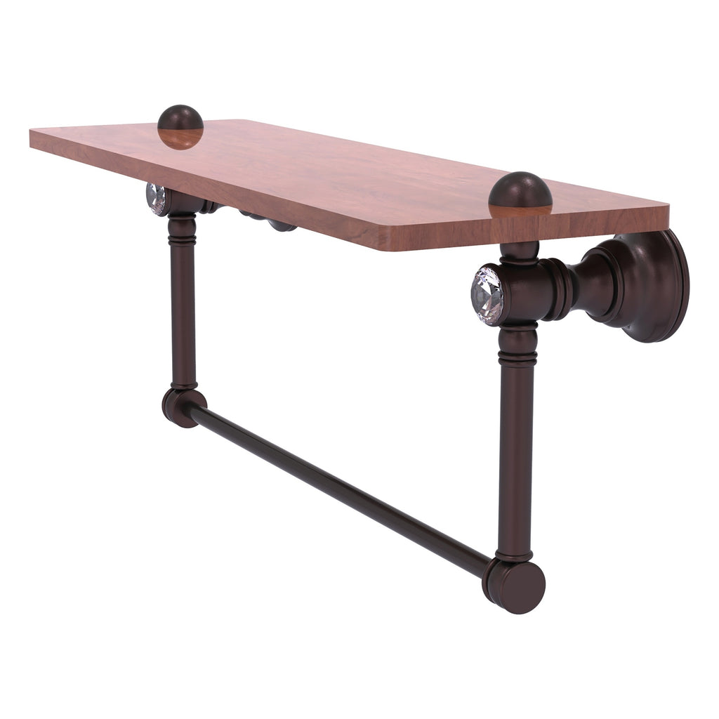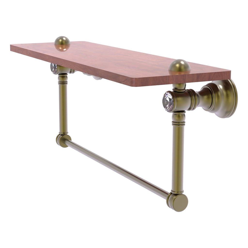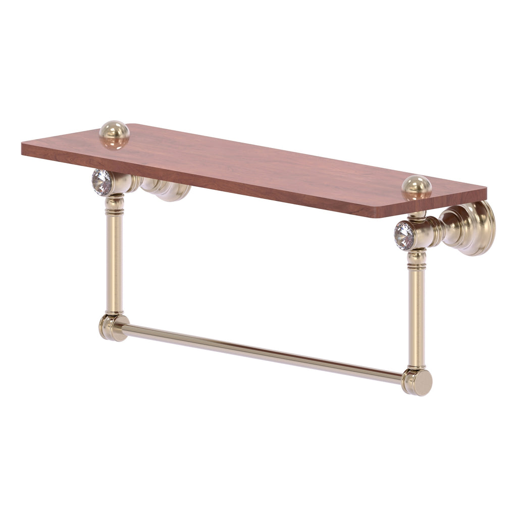 Reimagine your bathroom with this finely crafted hardwood shelf with integrated towel bar and crystal accents. Solid brass integrated towel bar provides a creative space for your towels. Traditional style and superior quality resonate from this hand crafted accessory. Featuring the finest hardwood and solid brass hardware this shelf is crafted for durability strength and style. One of the many coordinating accessories in the Allied Brass Collection of accessories; this decorative hardwood shelf and integrated towel bar with the added sparkle of crystal is the perfect complement to your bathroom decor.