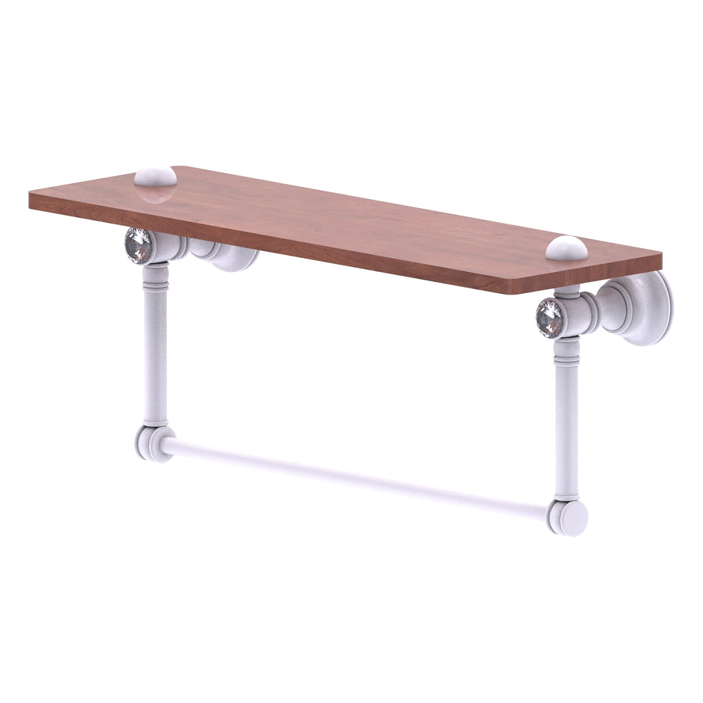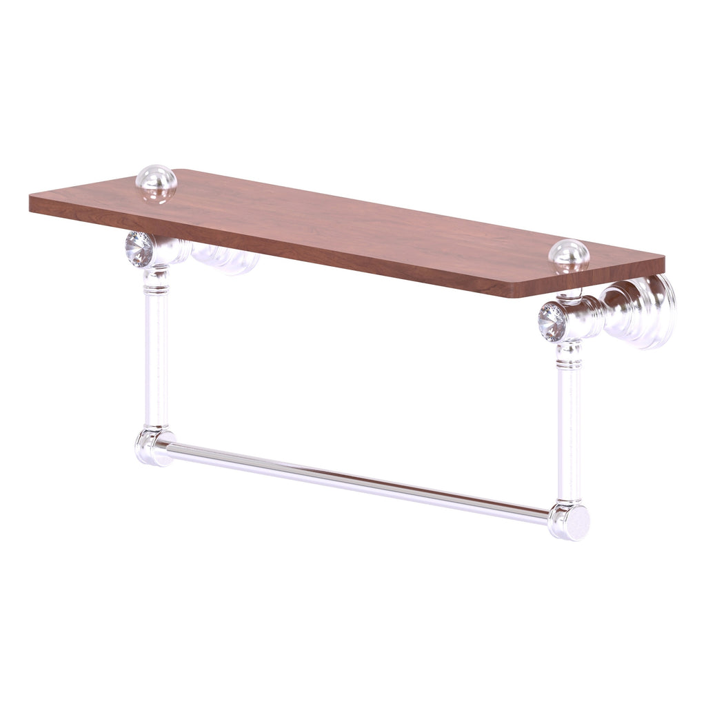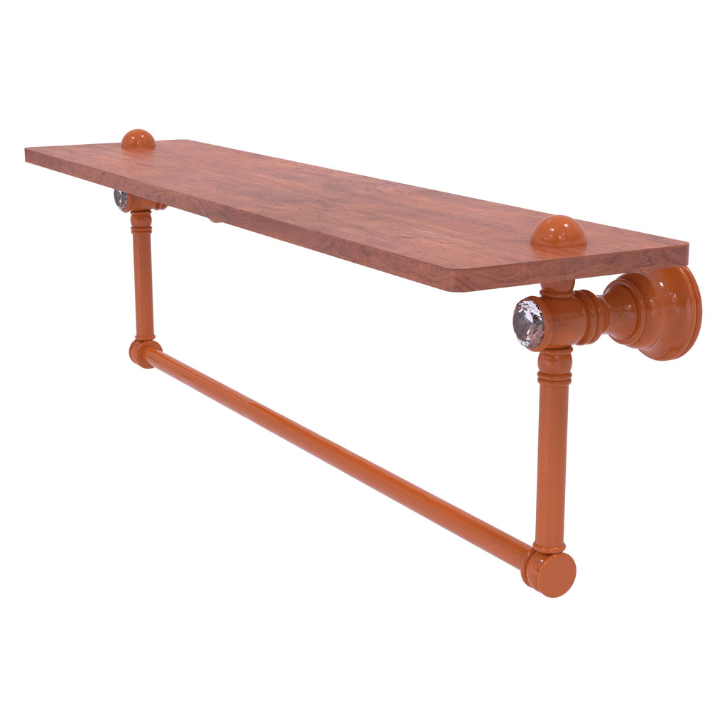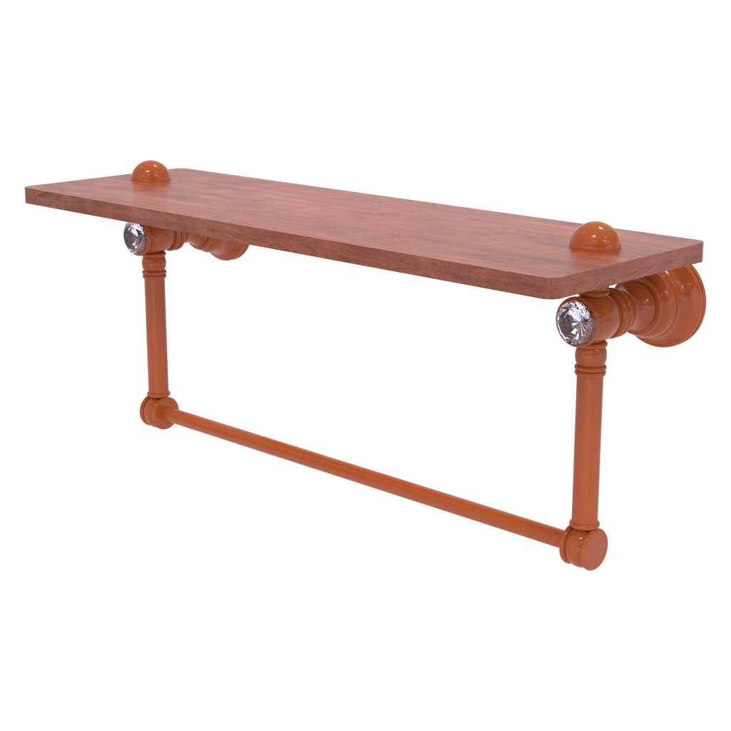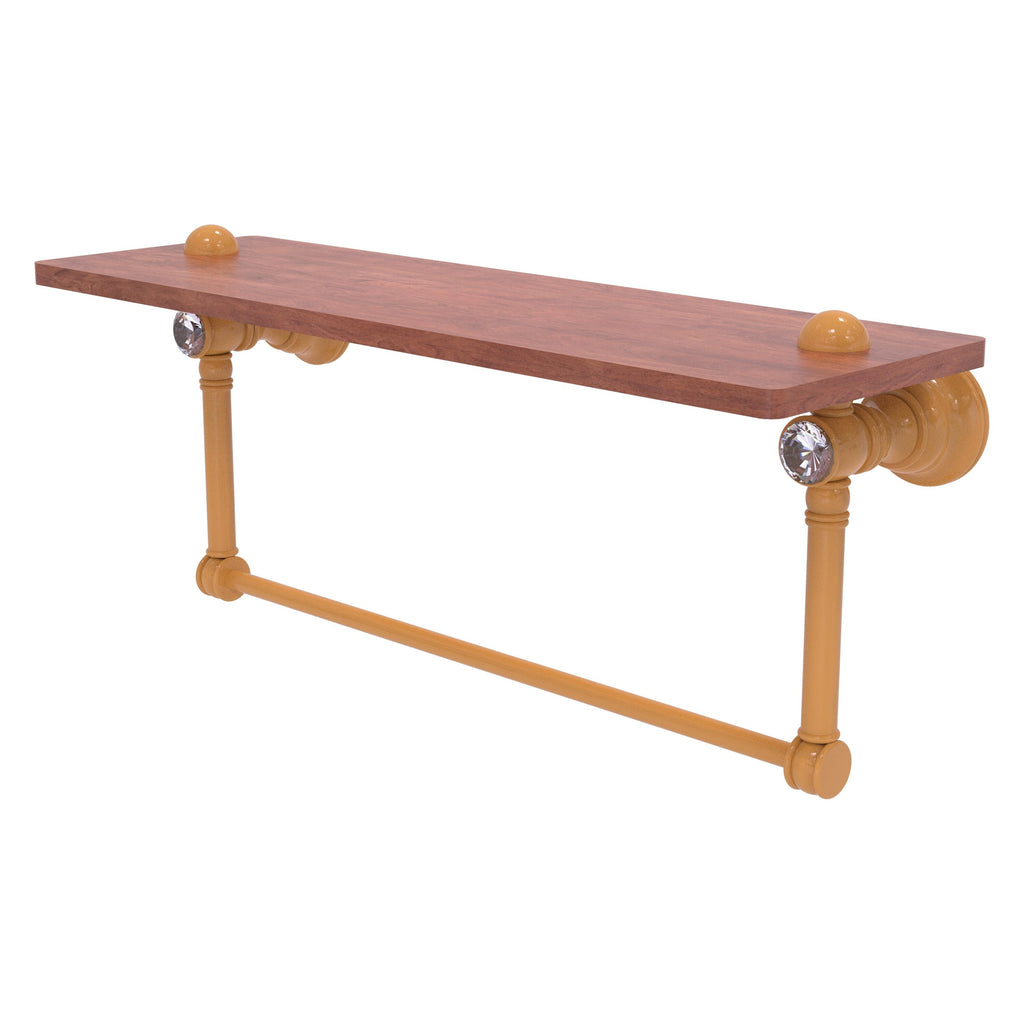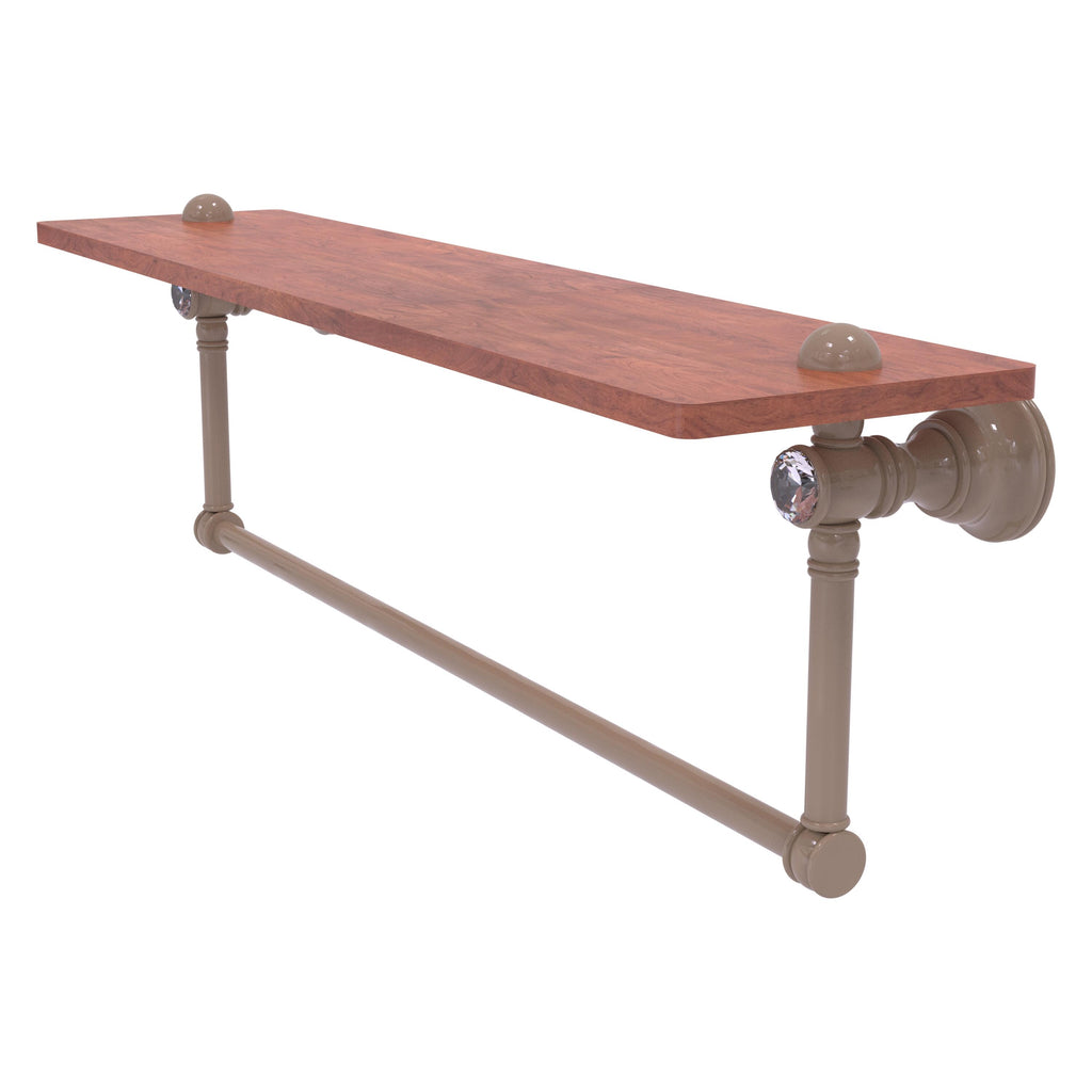 Reimagine your bathroom with this finely crafted hardwood shelf with integrated towel bar and crystal accents. Solid brass integrated towel bar provides a creative space for your towels. Traditional style and superior quality resonate from this hand crafted accessory. Featuring the finest hardwood and solid brass hardware this shelf is crafted for durability strength and style. One of the many coordinating accessories in the Allied Brass Collection of accessories; this decorative hardwood shelf and integrated towel bar with the added sparkle of crystal is the perfect complement to your bathroom decor.