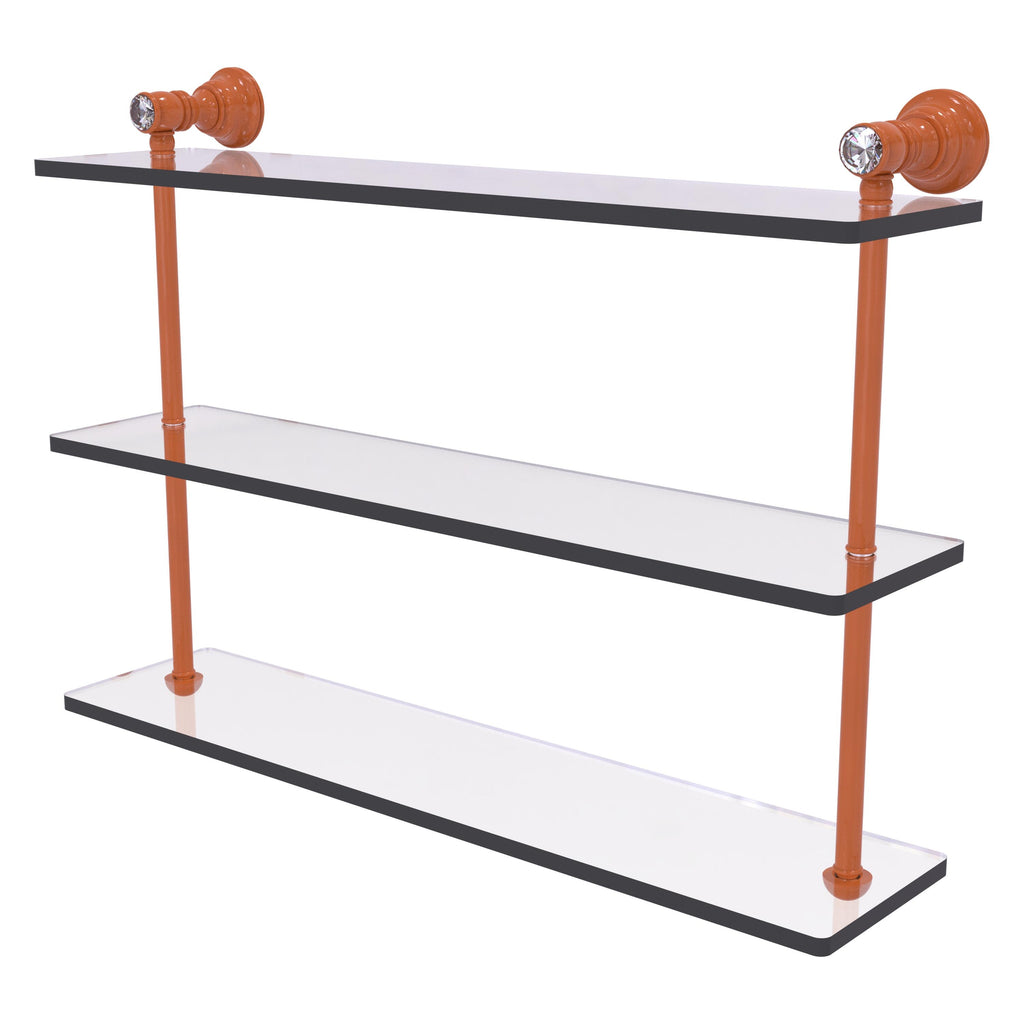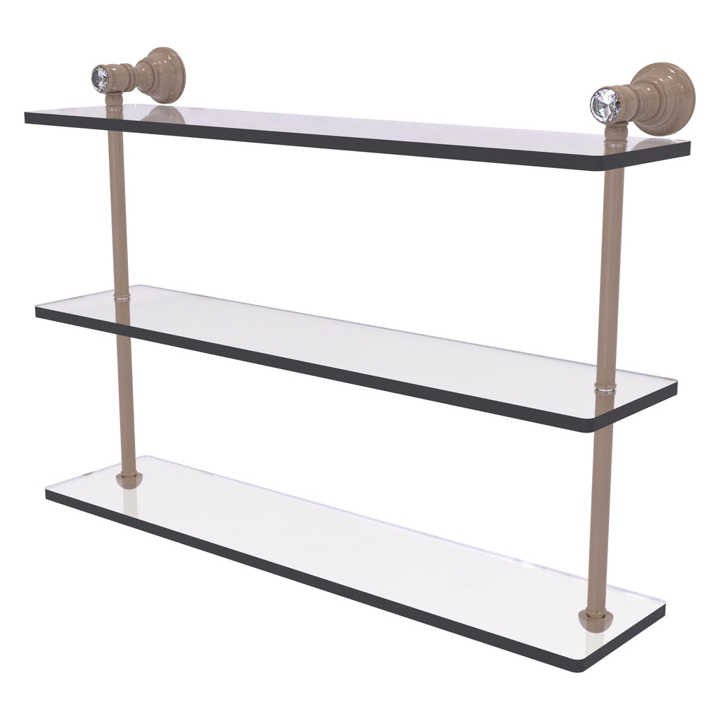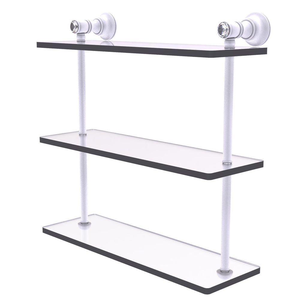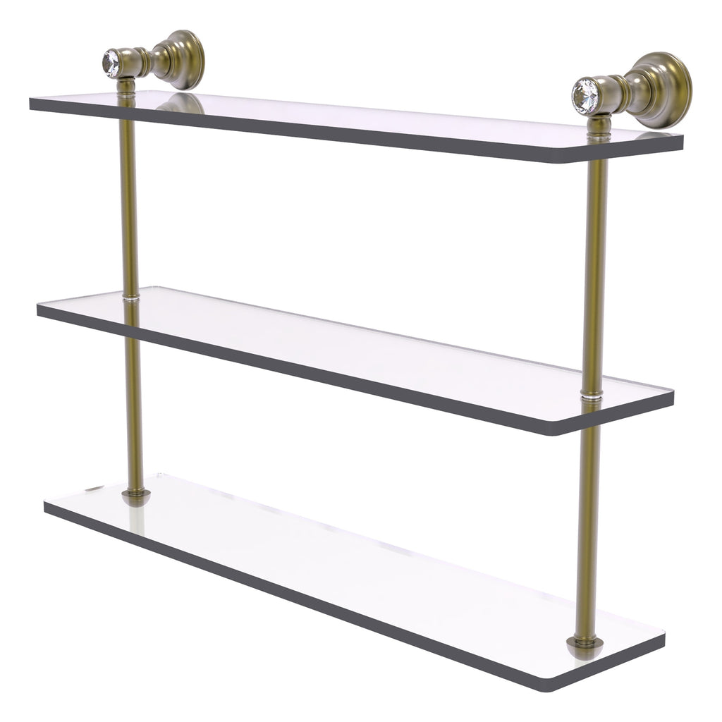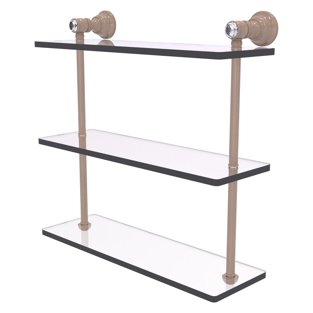 Reimagine your bathroom with this finely crafted triple glass shelf with crystal accents. Traditional styling and superior quality resonate from this hand crafted glass shelf. The 3 tiers of this shelf make great use of your wall space while providing plenty of room for storage. Featuring thick, beveled-edge glass and solid brass hardware this shelf with the dazzle of crystal is crafted for durability, strength and style.