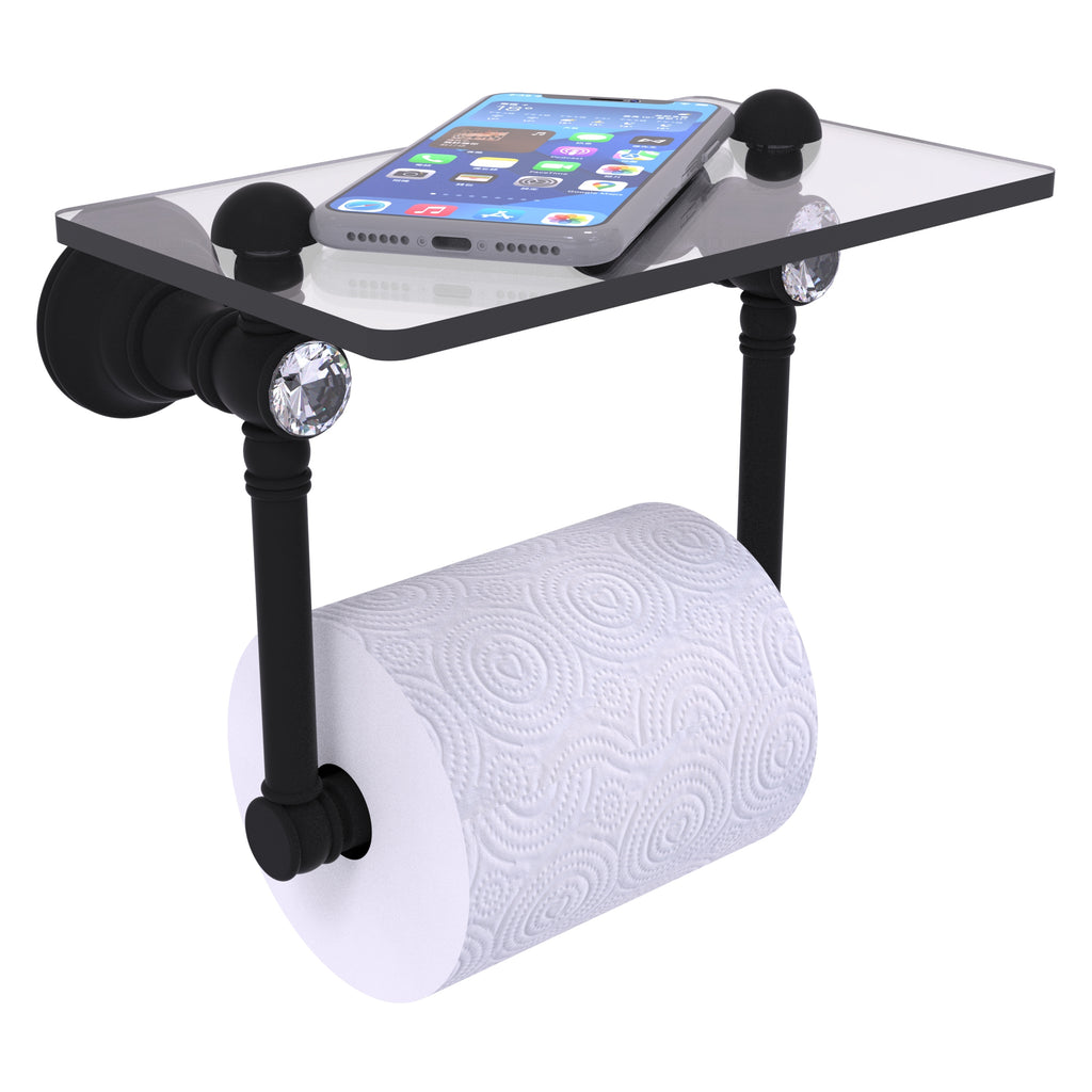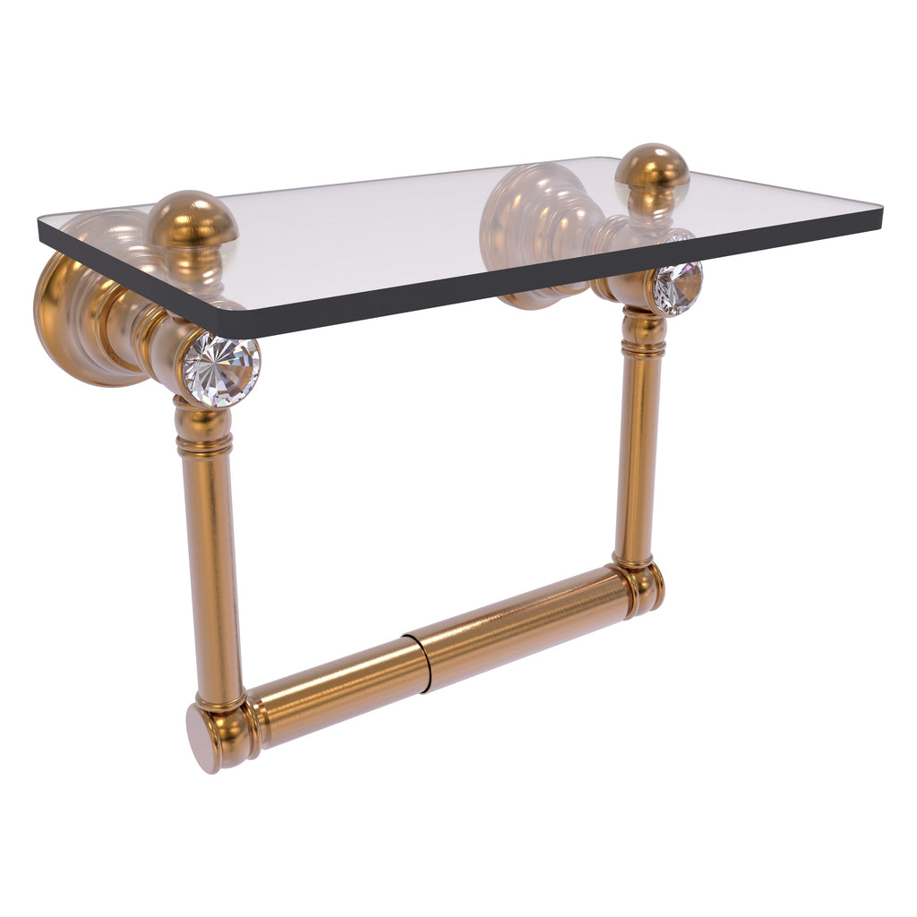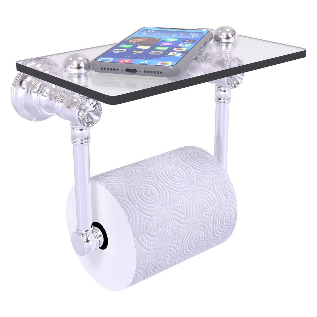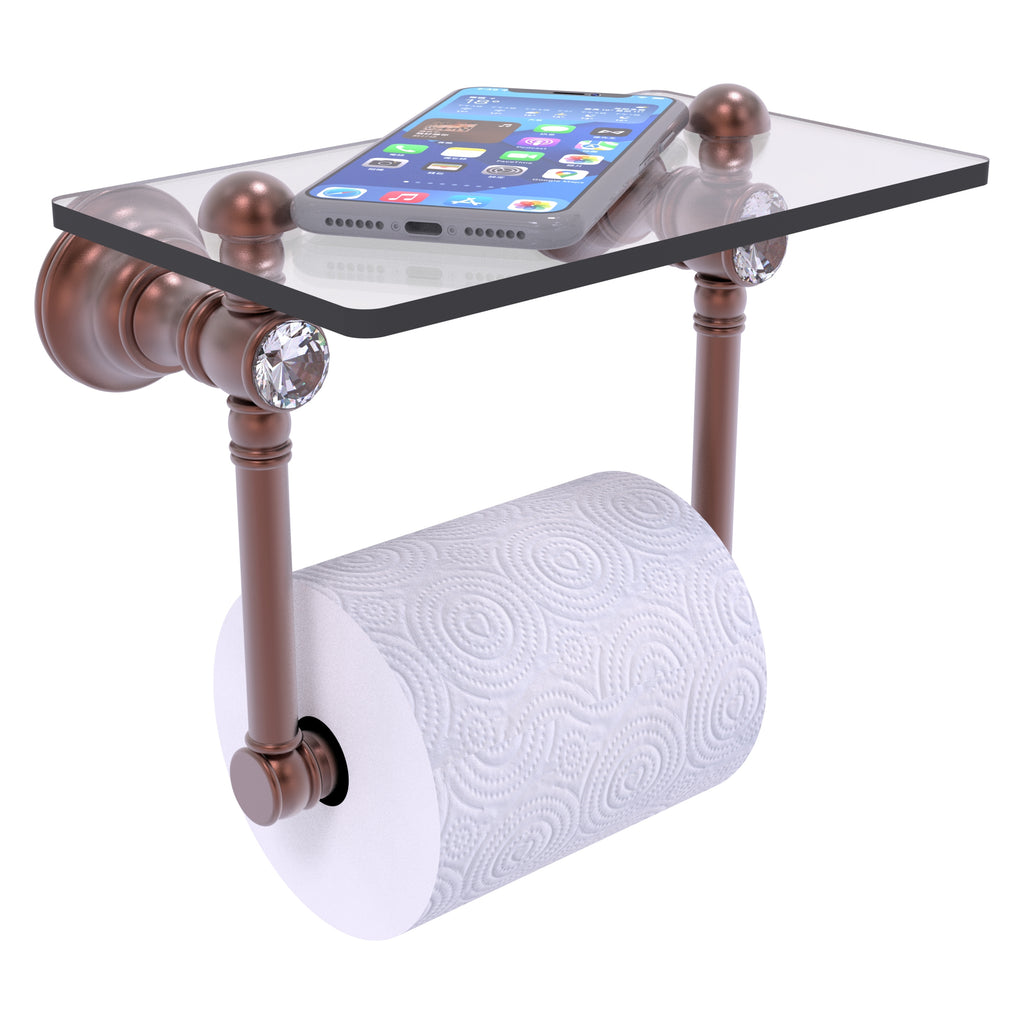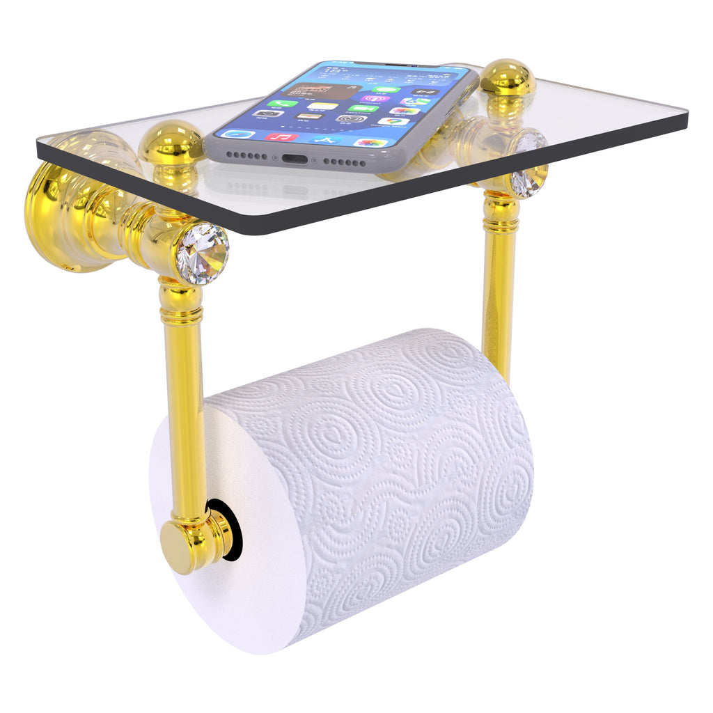 Add convenience to your toilet area with this traditional design toilet paper holder with a glass shelf above the roll holder. It's perfect for placing your cell phone or other personal items down on. The 5'' x 8'' wide glass shelf is compact and just the right size for the commode area. Faceted crystal caps on the paper holder brackets add an elegant look to this accessory. Available in a wide variety of designer finishes, the paper holder is made of solid brass and built to last a lifetime.