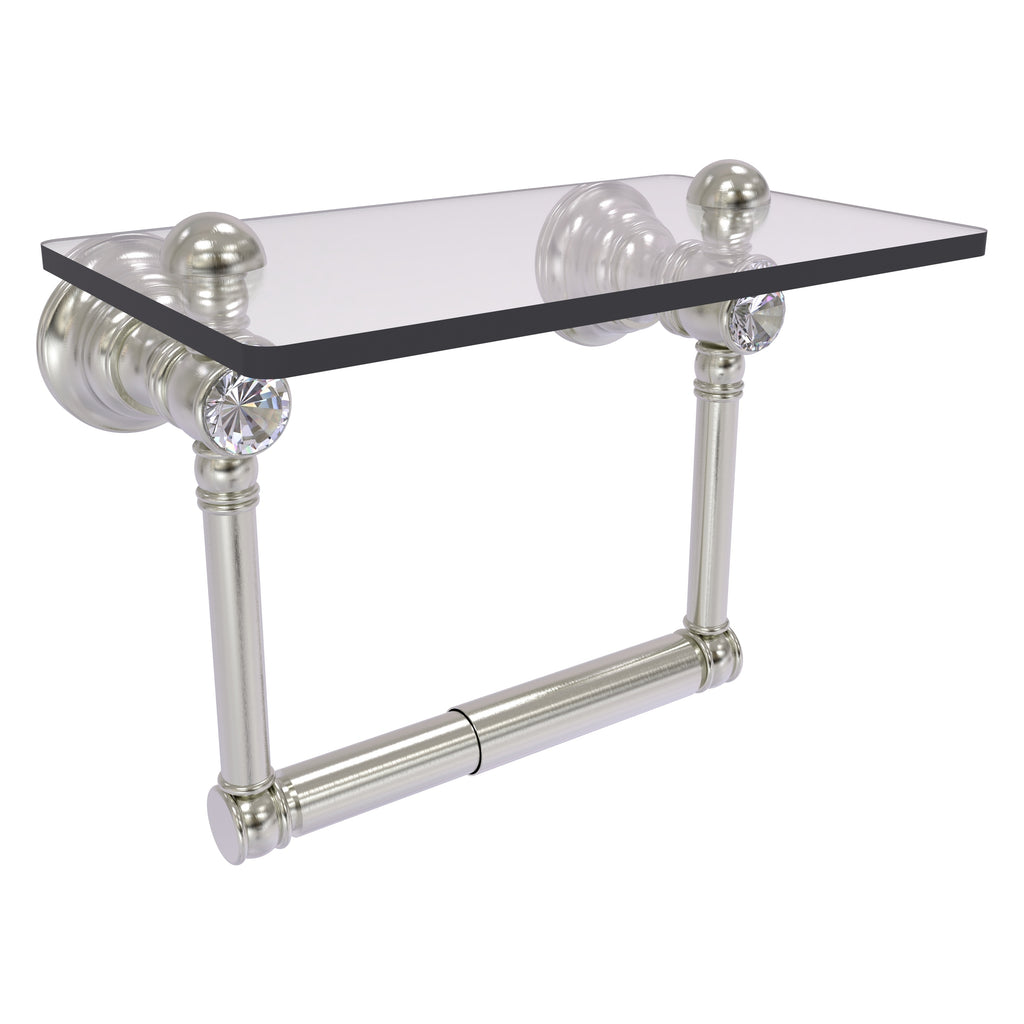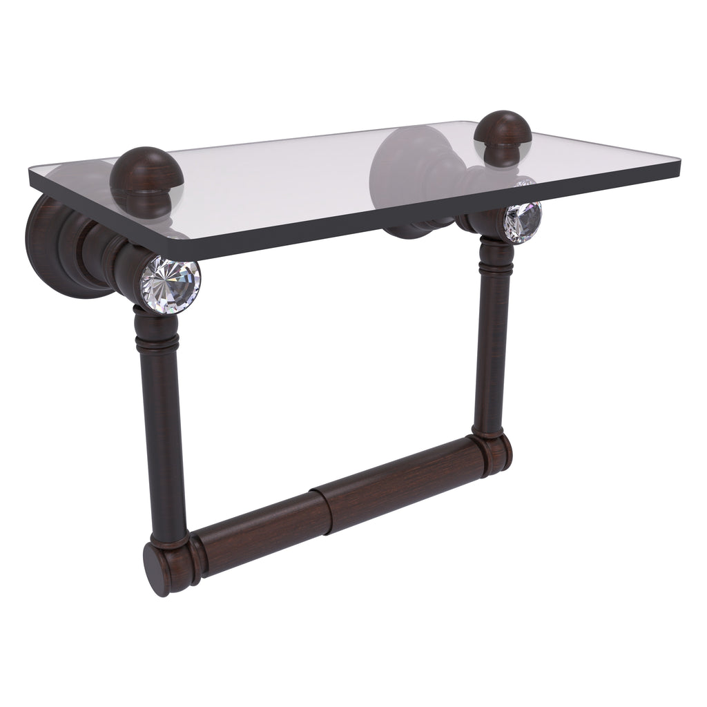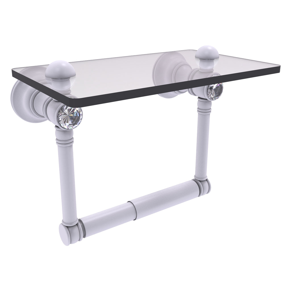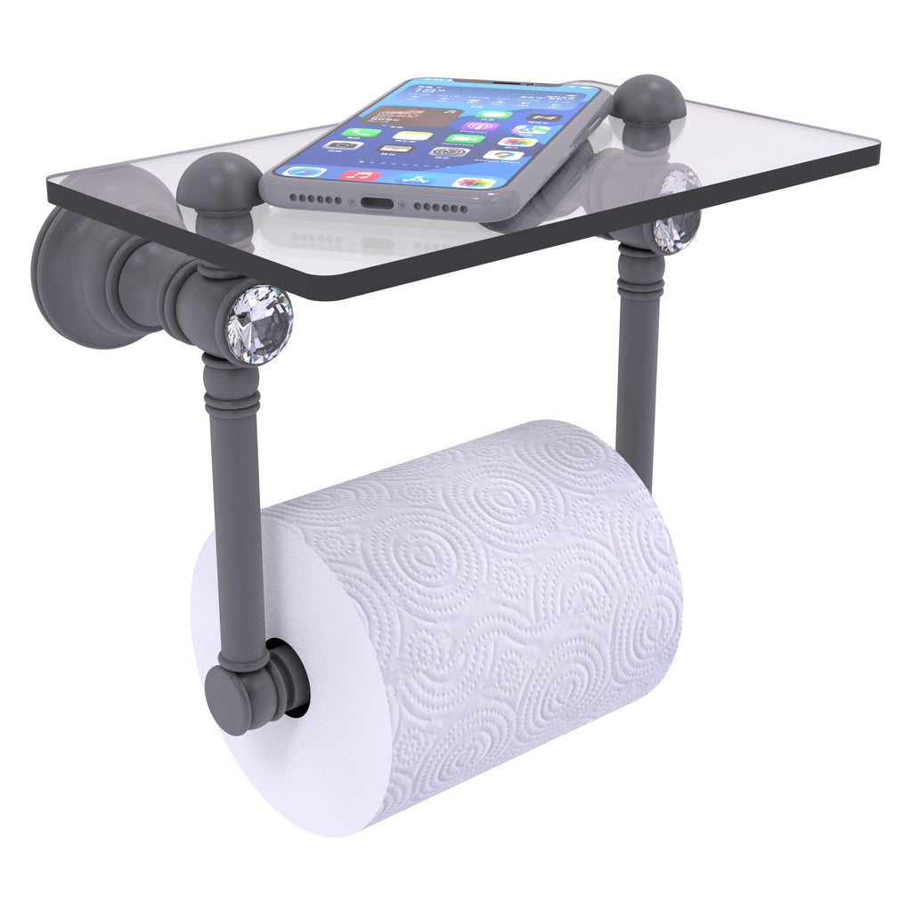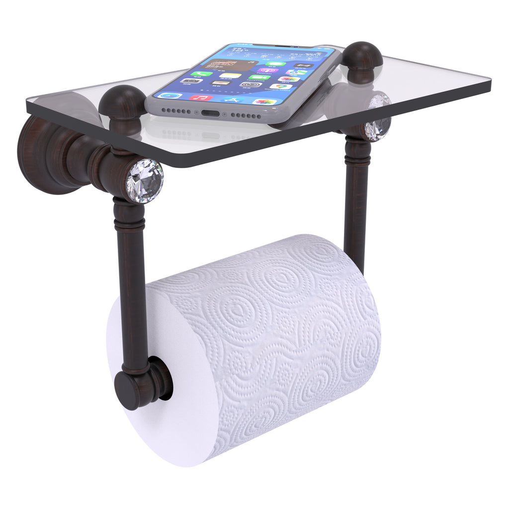 Add convenience to your toilet area with this traditional design toilet paper holder with a glass shelf above the roll holder. It's perfect for placing your cell phone or other personal items down on. The 5'' x 8'' wide glass shelf is compact and just the right size for the commode area. Faceted crystal caps on the paper holder brackets add an elegant look to this accessory. Available in a wide variety of designer finishes, the paper holder is made of solid brass and built to last a lifetime.
