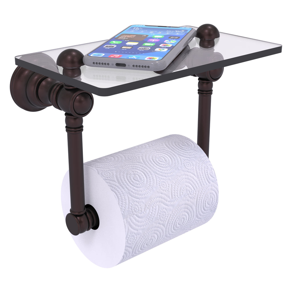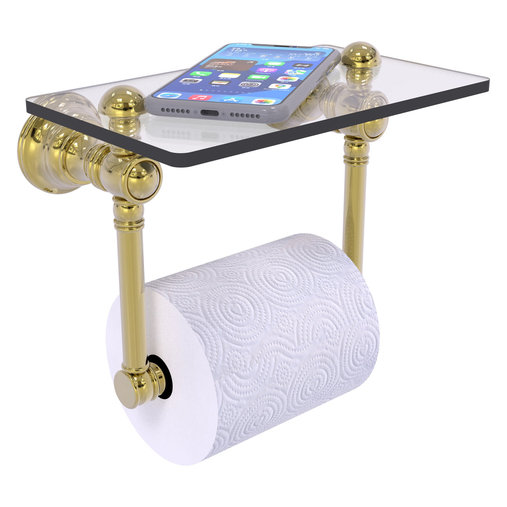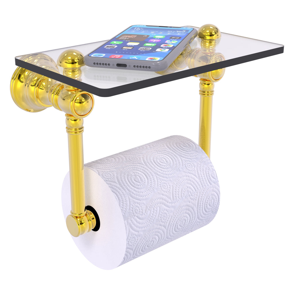 Add a touch of elegance and convenience to your toilet area with this traditional design toilet paper holder with a glass shelf above the roll holder. It's perfect for placing your cell phone or other personal items down on. The 5'' x 8'' wide glass shelf is compact and just the right size for the commode area. Available in a wide variety of designer finishes, the paper holder is made of solid brass and built to last a lifetime.