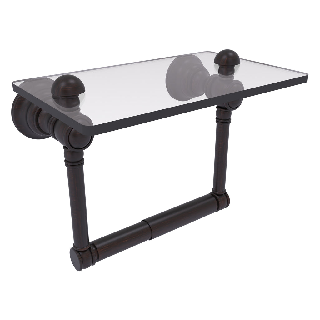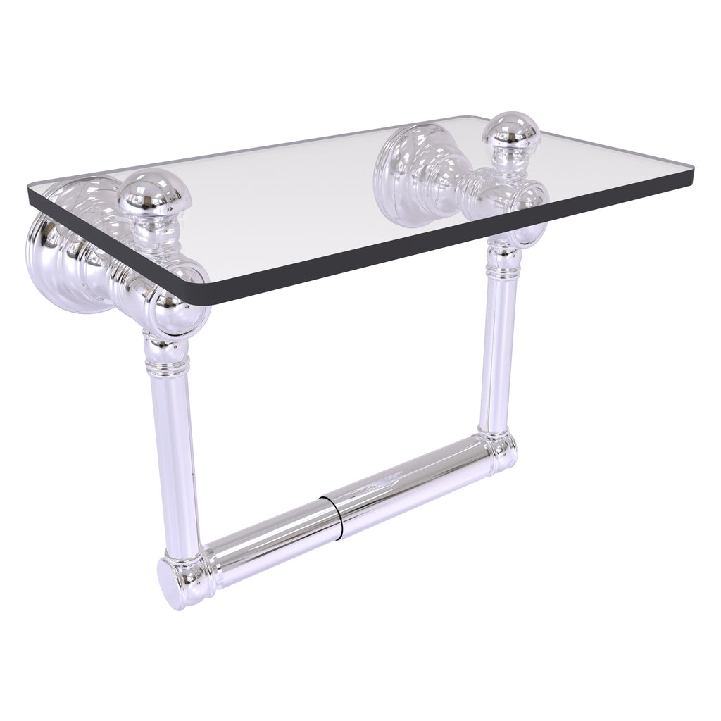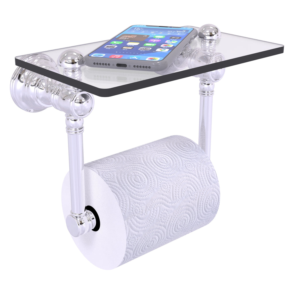 Add a touch of elegance and convenience to your toilet area with this traditional design toilet paper holder with a glass shelf above the roll holder. It's perfect for placing your cell phone or other personal items down on. The 5'' x 8'' wide glass shelf is compact and just the right size for the commode area. Available in a wide variety of designer finishes, the paper holder is made of solid brass and built to last a lifetime.