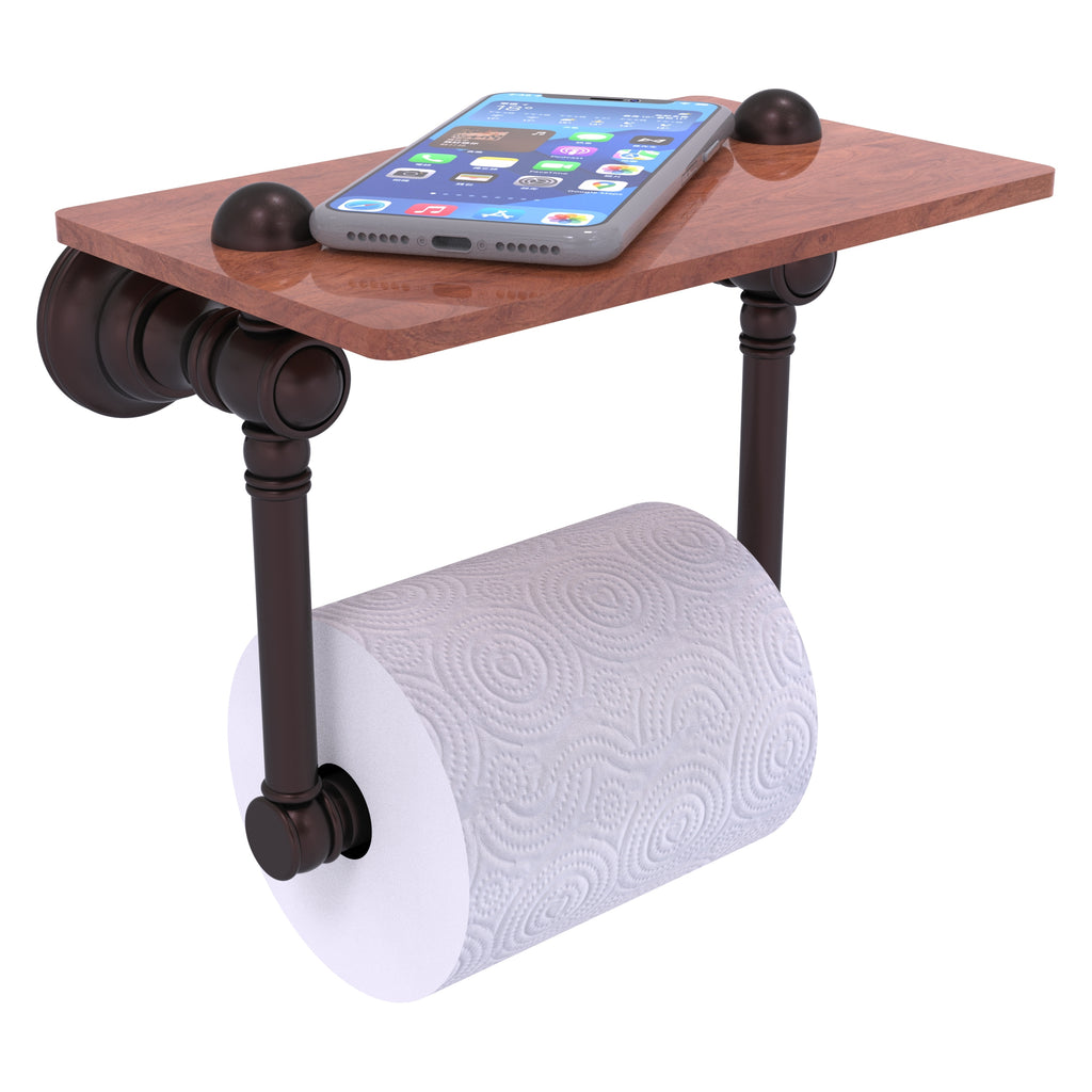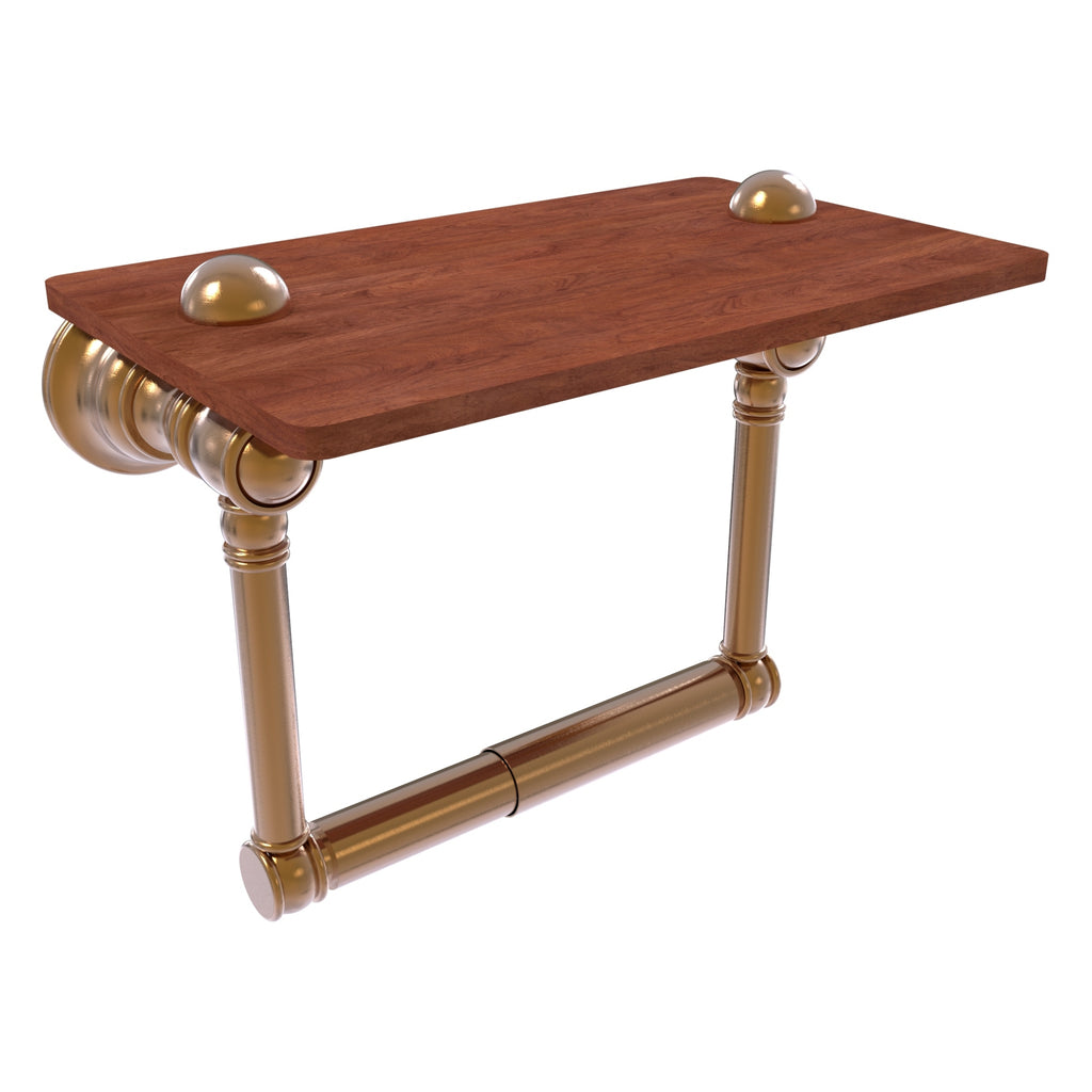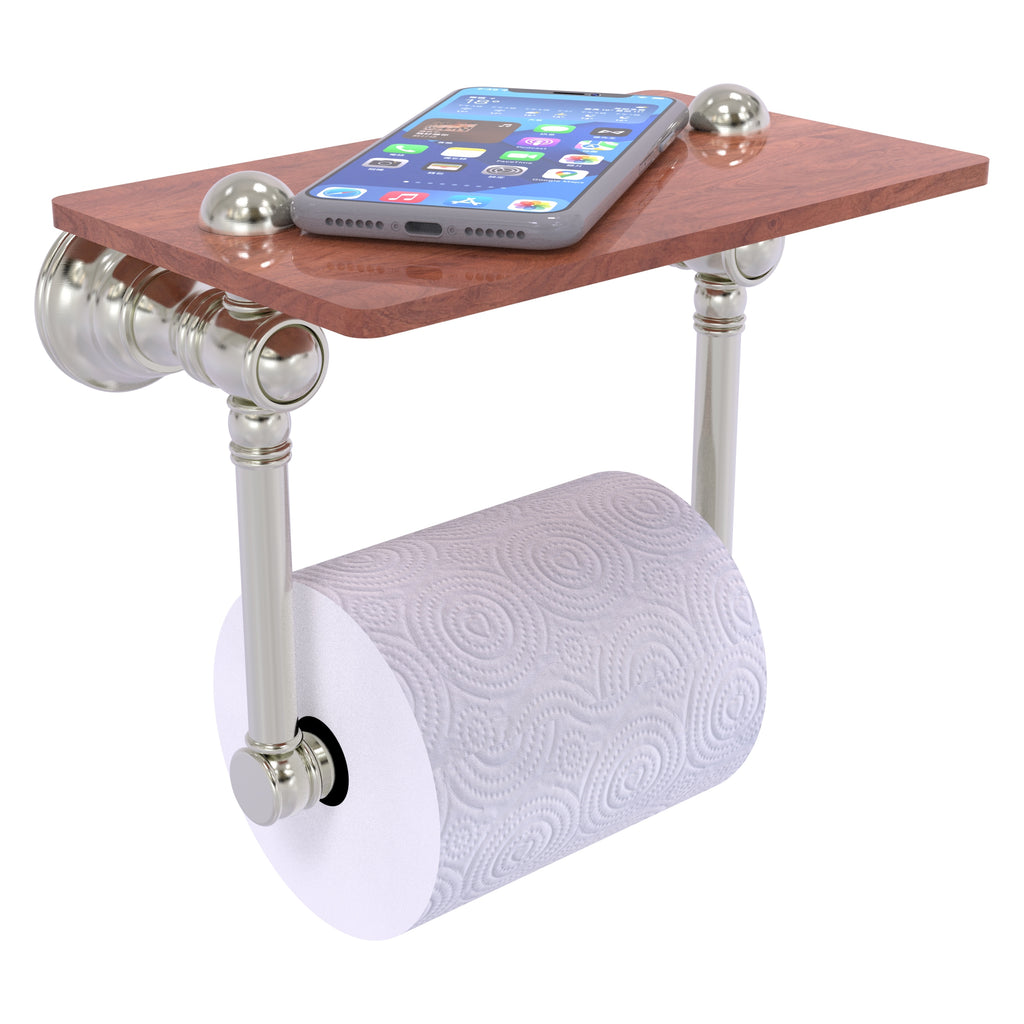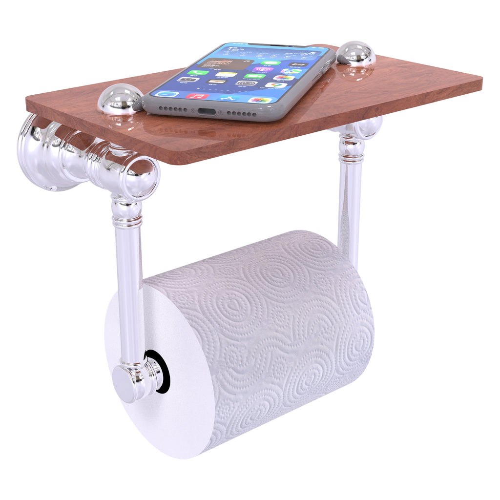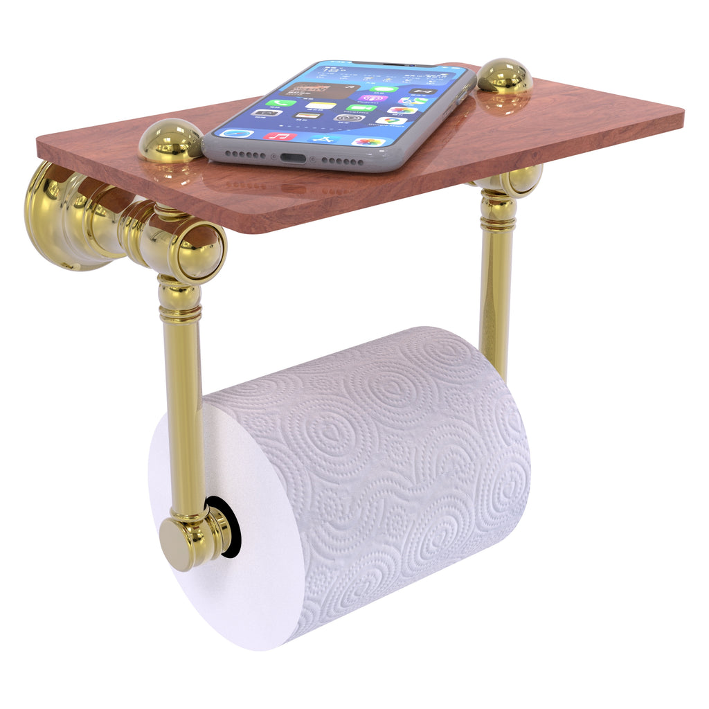 Add convenience to your toilet area with this traditional design toilet paper holder with a hardwood shelf above the roll holder. It's perfect for placing your cell phone or other personal items down on. The 5'' x 8'' wide wood shelf is compact and just the right size for the commode area. Available in a wide variety of designer finishes, the paper holder is made of solid brass and built to last a lifetime.