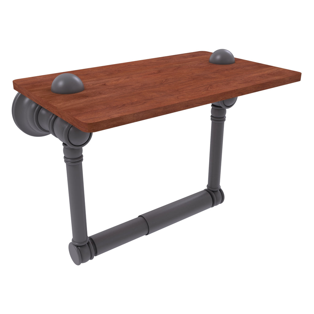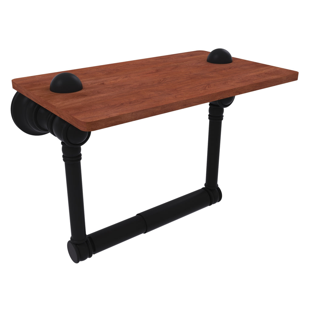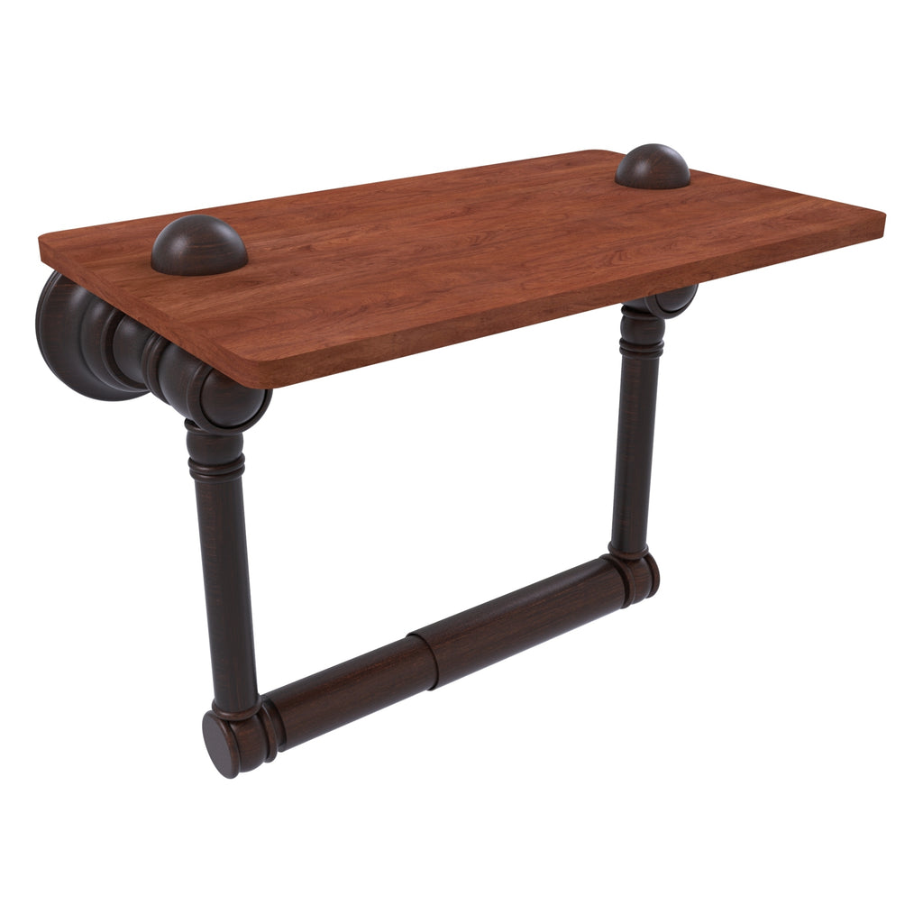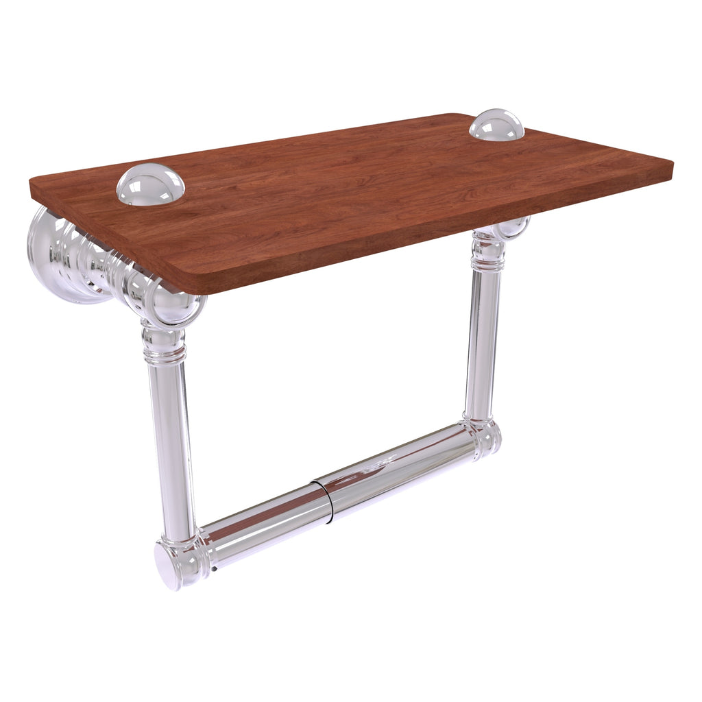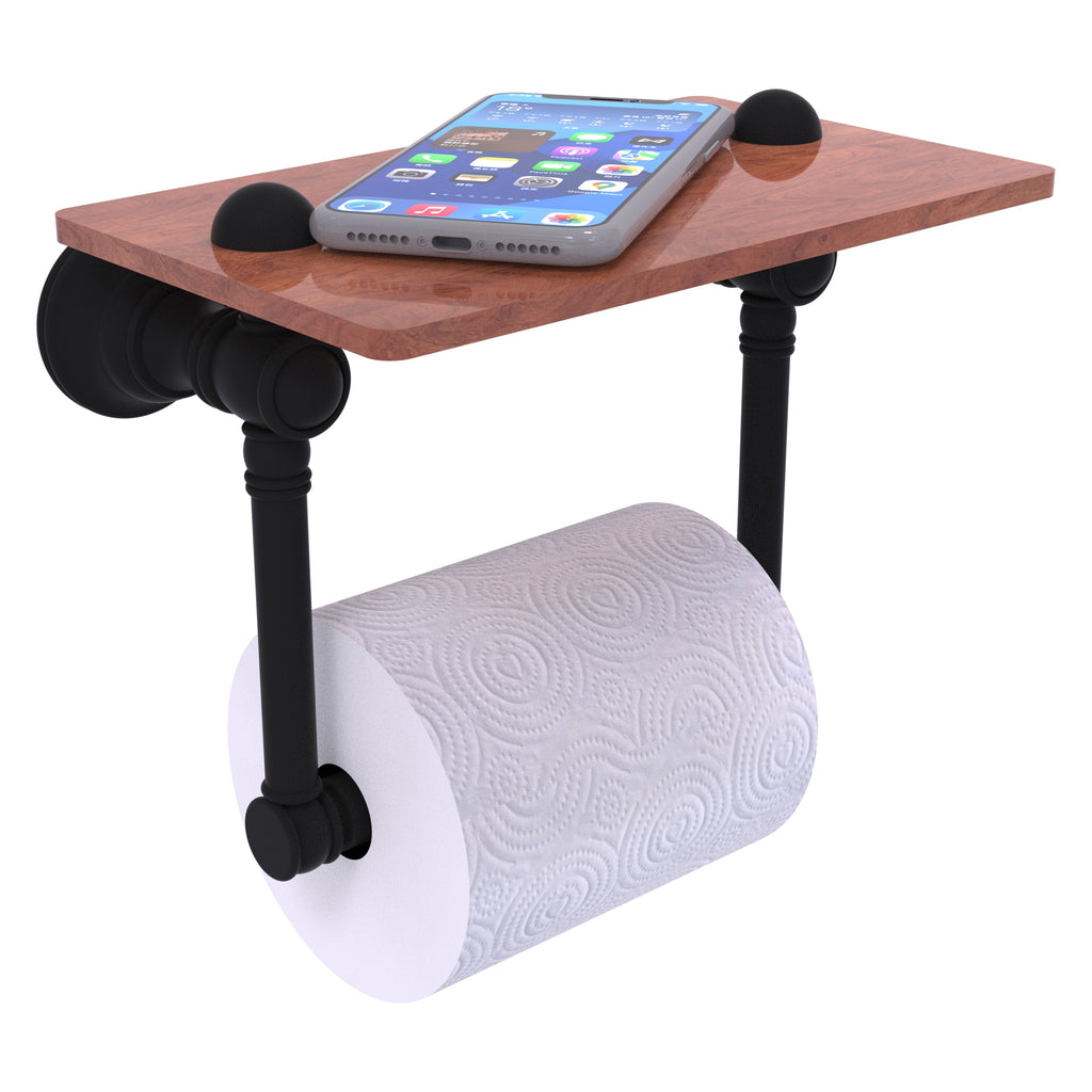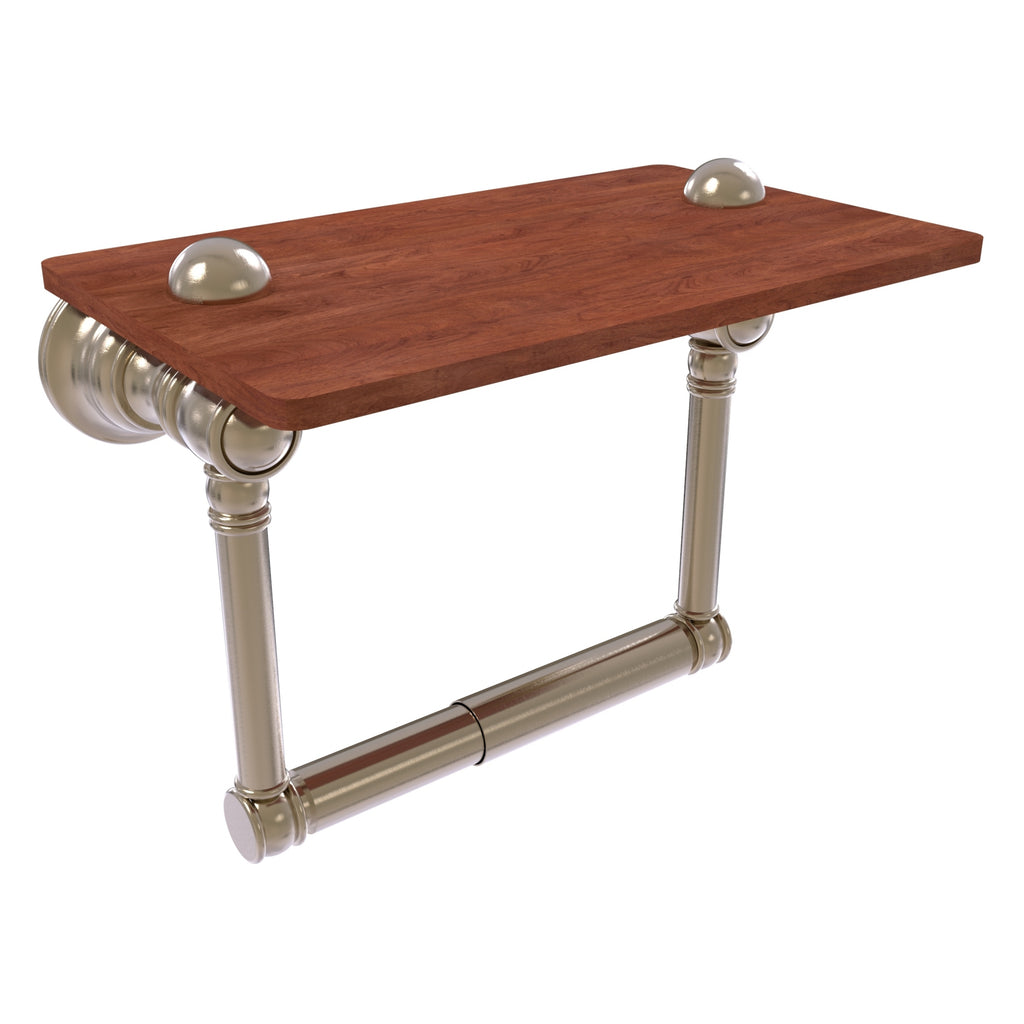 Add convenience to your toilet area with this traditional design toilet paper holder with a hardwood shelf above the roll holder. It's perfect for placing your cell phone or other personal items down on. The 5'' x 8'' wide wood shelf is compact and just the right size for the commode area. Available in a wide variety of designer finishes, the paper holder is made of solid brass and built to last a lifetime.