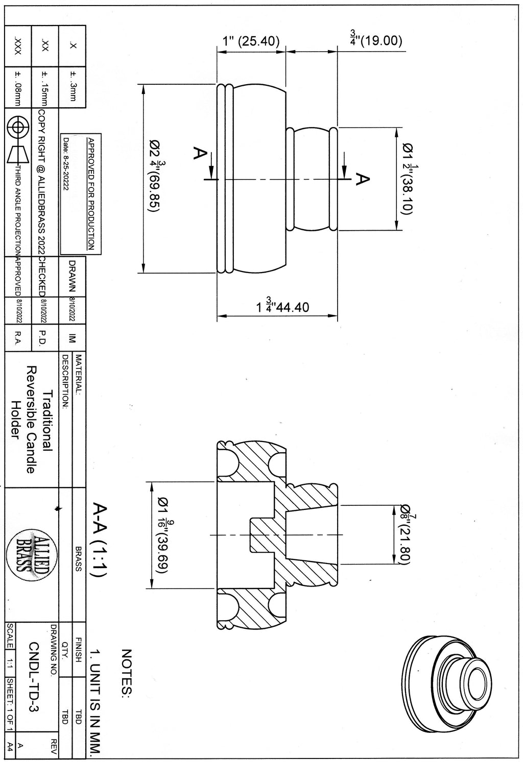 The Traditional Reversible Candle Holder from Allied Brass is sculptured out of solid brass to bring a classic elegance to your table, mantle or kitchen. Placed larger side down, this versatile base will securely hold a tapered candle. Turn it over and display a votive or tea light candle. Each side contains a circular channel to catch wax drippings. Multiple bases can also be stacked to create a bolder look or for convenient storage