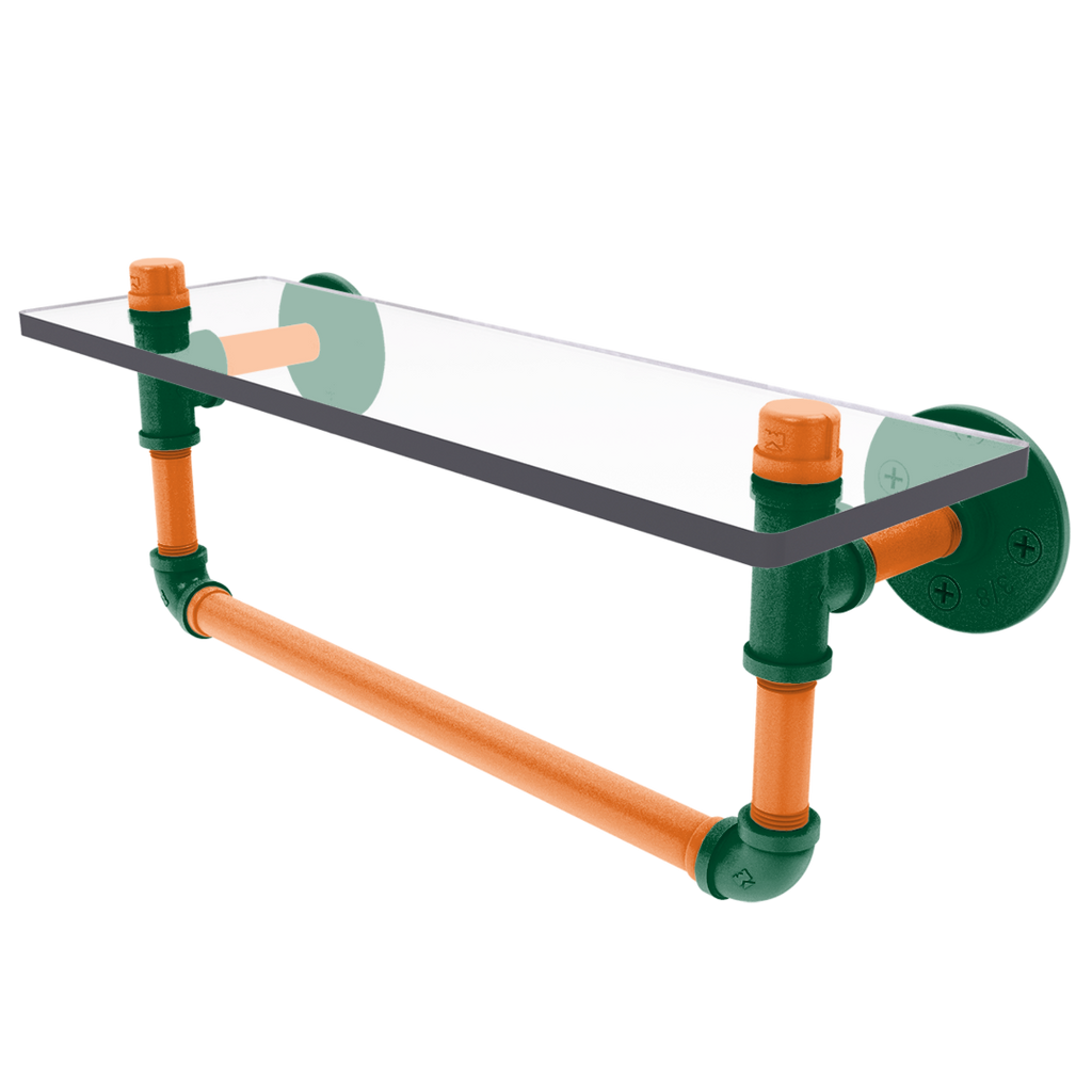 Enhance your bathroom while showing off your Coral Gables pride with our exclusive Collegiate Collection Glass Shelf with Towel Bar. Sporting the vibrant primary color and secondary color, this piece not only serves as a functional addition to your home but also as a bold statement of your love for College Sports. Crafted with high-quality powder-coated industrial pipe and durable glass, this shelf and towel bar combination brings both style and practicality to your bathroom space.