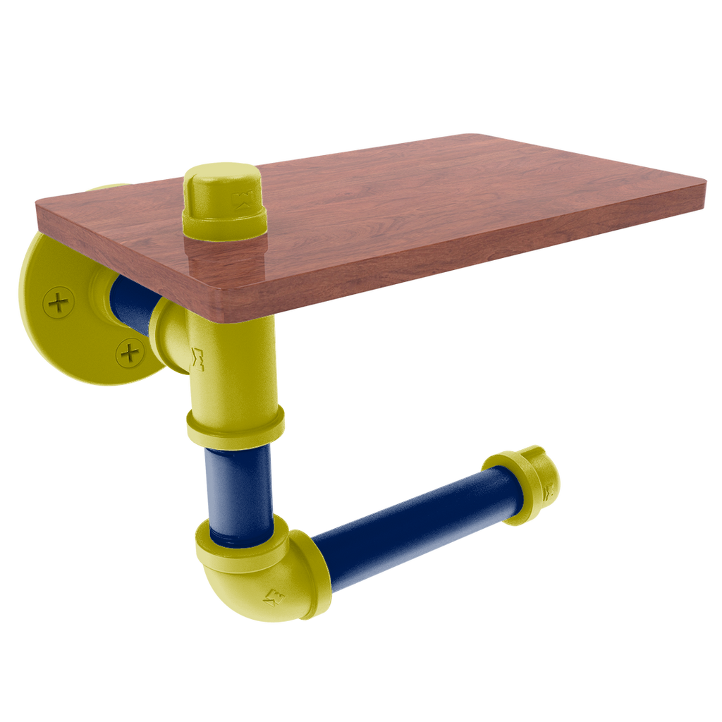 The innovative design includes a wooden shelf situated above the roll, providing a convenient space for personal items or extra toilet paper storage. This added functionality makes it an indispensable fixture for fans who value efficiency and flair. The wood's rich texture compliments the industrial aesthetic of the powder-coated pipe, blending modern and traditional elements seamlessly.