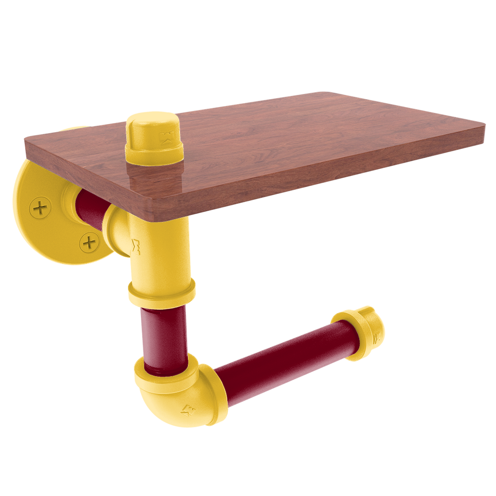 The innovative design includes a wooden shelf situated above the roll, providing a convenient space for personal items or extra toilet paper storage. This added functionality makes it an indispensable fixture for fans who value efficiency and flair. The wood's rich texture compliments the industrial aesthetic of the powder-coated pipe, blending modern and traditional elements seamlessly.