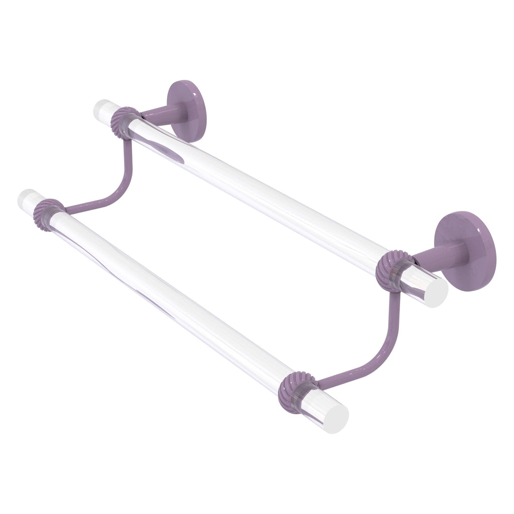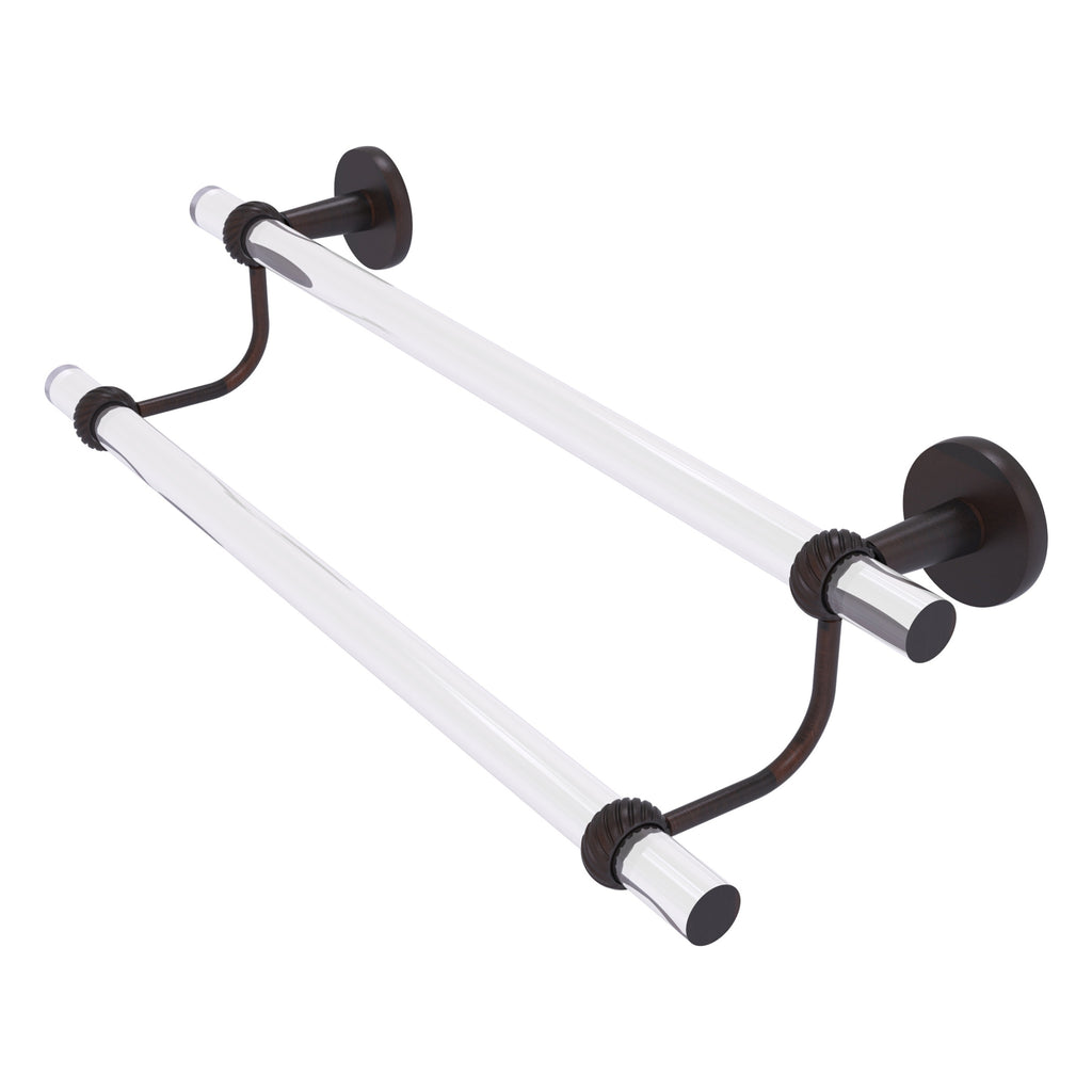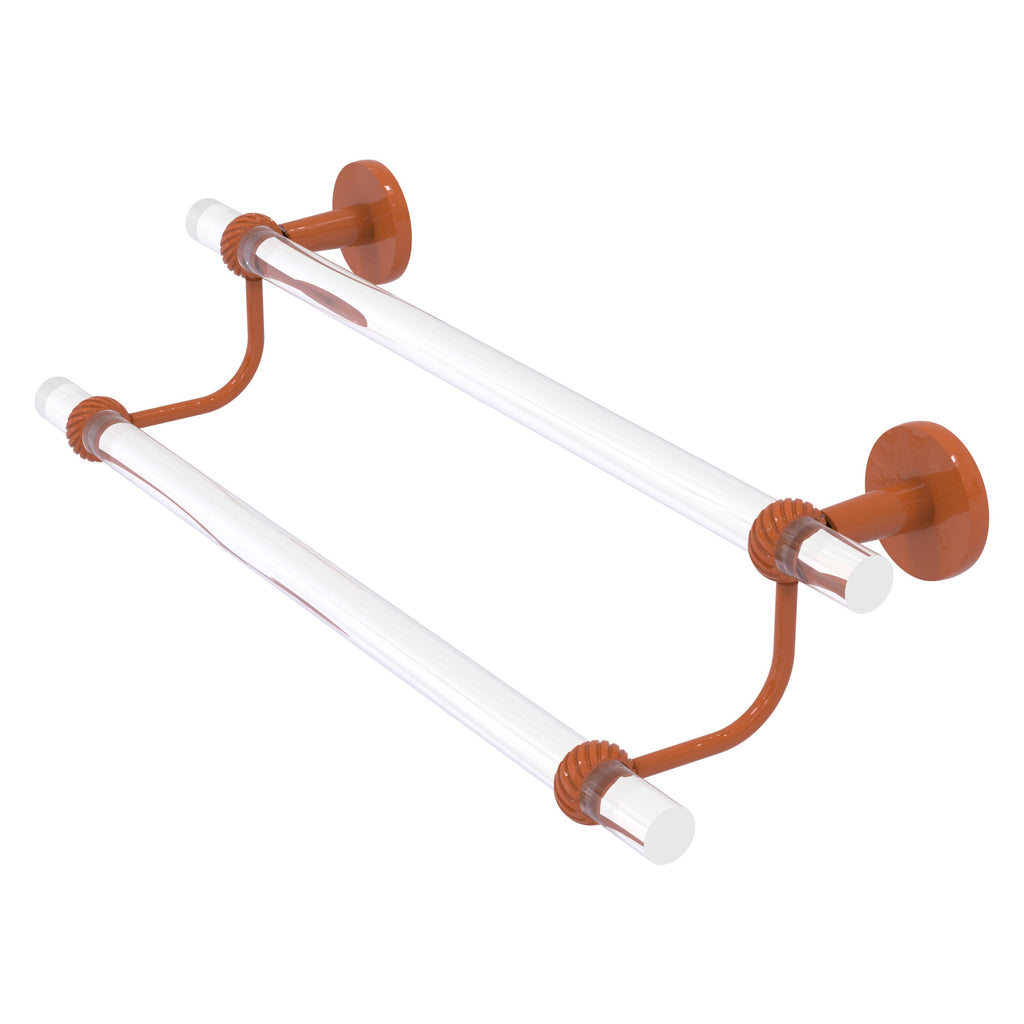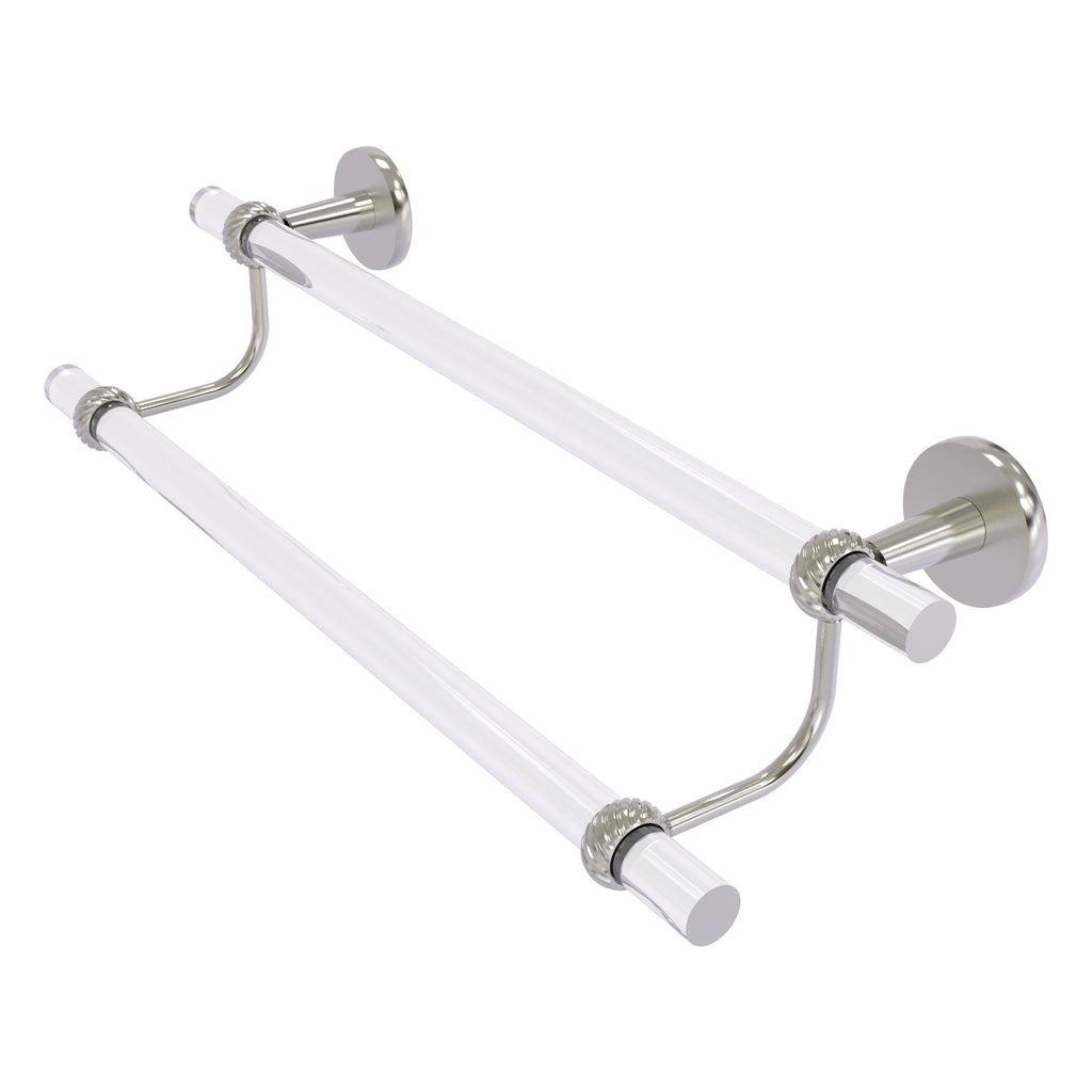 Brass and acrylic meet in this design that subtly shows off the strength of each material. This very elegant double towel bar will complement--and show off--virtually any towel hung upon it. Finely crafted of solid brass with accents of clear acrylic create the unique design to add the finishing touch to your project. Double towel bar is finished with our designer lifetime finishes to provide unparalleled performance.