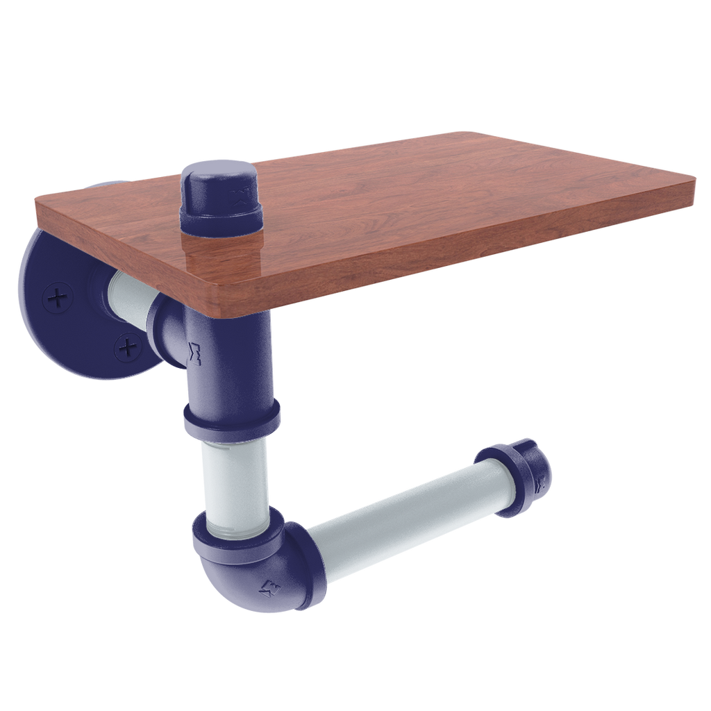 The innovative design includes a wooden shelf situated above the roll, providing a convenient space for personal items or extra toilet paper storage. This added functionality makes it an indispensable fixture for fans who value efficiency and flair. The wood's rich texture compliments the industrial aesthetic of the powder-coated pipe, blending modern and traditional elements seamlessly.