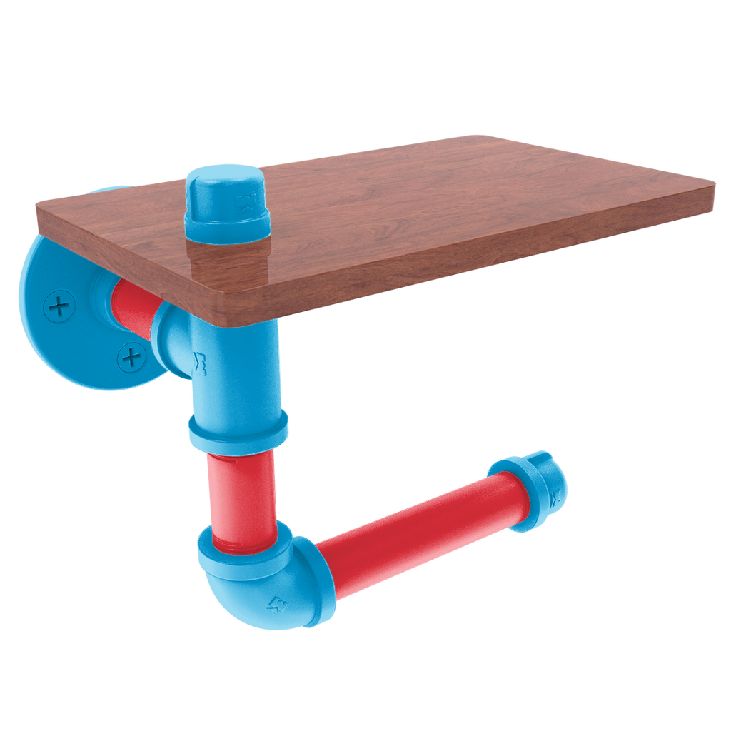 The innovative design includes a wooden shelf situated above the roll, providing a convenient space for personal items or extra toilet paper storage. This added functionality makes it an indispensable fixture for fans who value efficiency and flair. The wood's rich texture compliments the industrial aesthetic of the powder-coated pipe, blending modern and traditional elements seamlessly.