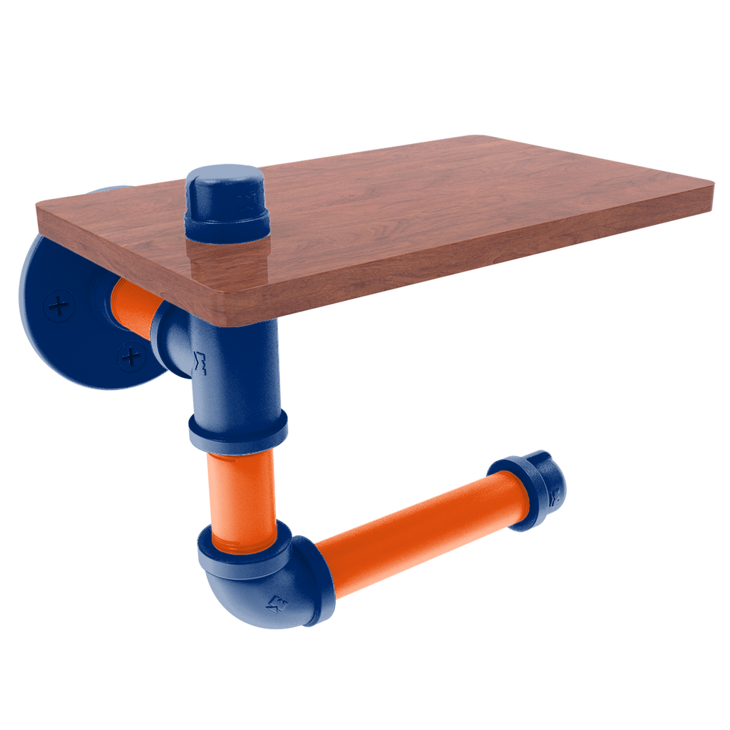 The innovative design includes a wooden shelf situated above the roll, providing a convenient space for personal items or extra toilet paper storage. This added functionality makes it an indispensable fixture for fans who value efficiency and flair. The wood's rich texture compliments the industrial aesthetic of the powder-coated pipe, blending modern and traditional elements seamlessly.