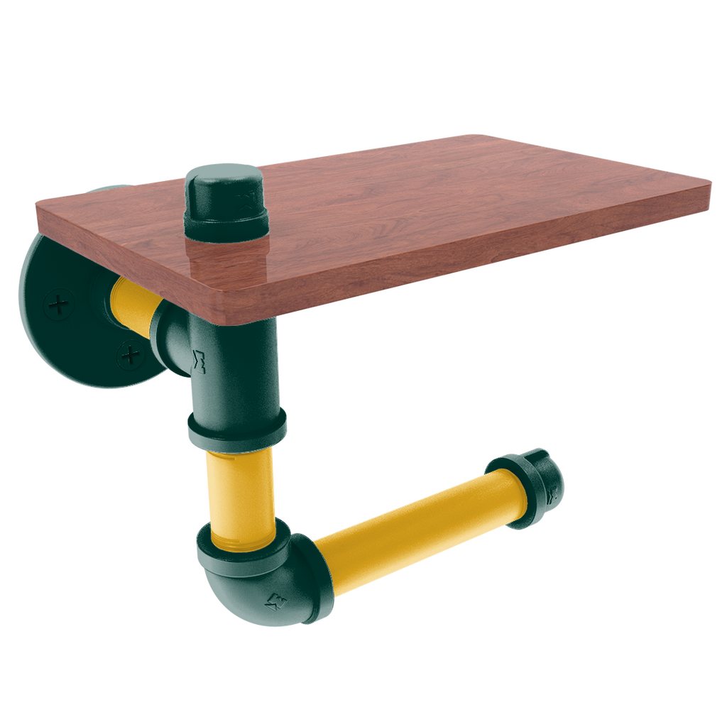 The innovative design includes a wooden shelf situated above the roll, providing a convenient space for personal items or extra toilet paper storage. This added functionality makes it an indispensable fixture for fans who value efficiency and flair. The wood's rich texture compliments the industrial aesthetic of the powder-coated pipe, blending modern and traditional elements seamlessly.