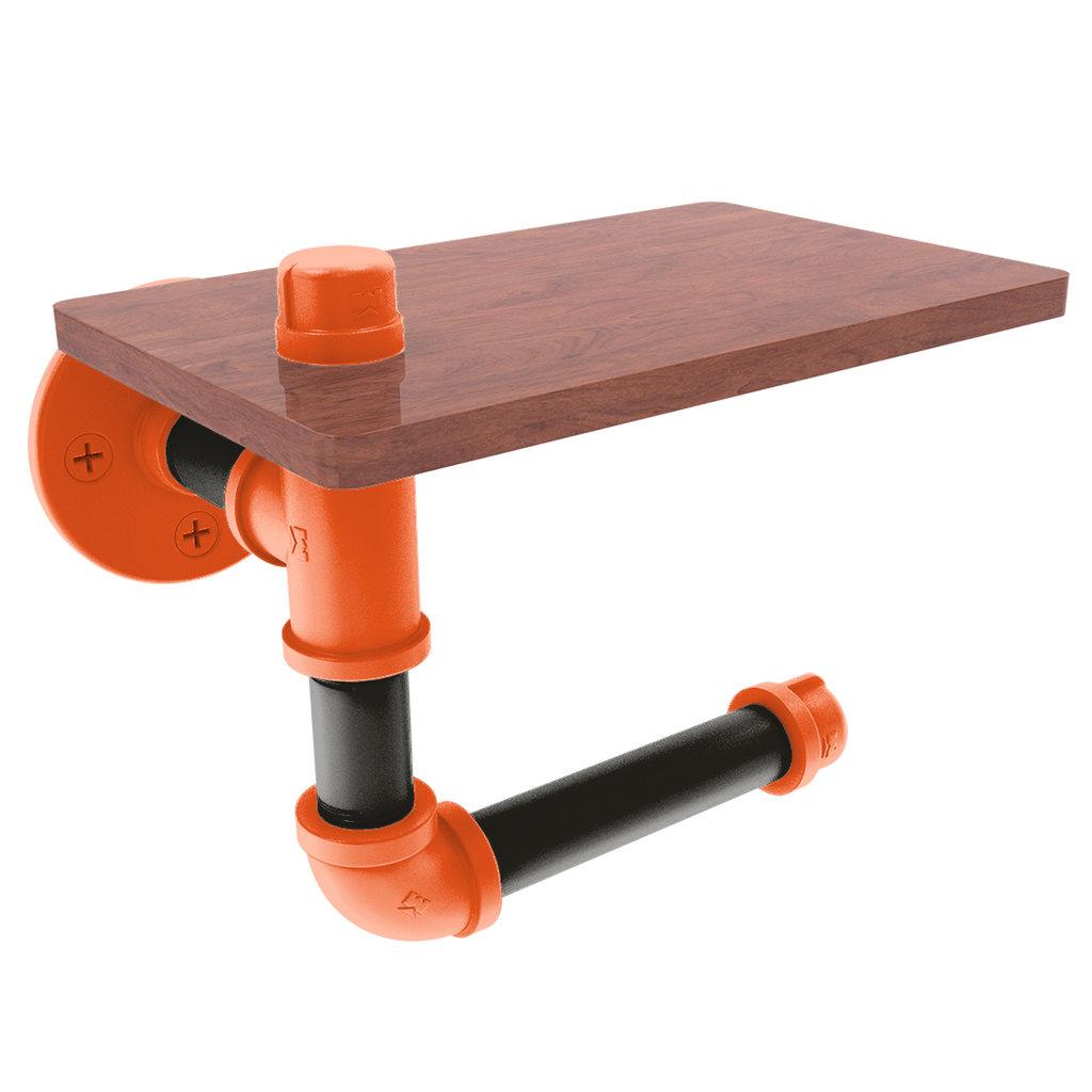 The innovative design includes a wooden shelf situated above the roll, providing a convenient space for personal items or extra toilet paper storage. This added functionality makes it an indispensable fixture for fans who value efficiency and flair. The wood's rich texture compliments the industrial aesthetic of the powder-coated pipe, blending modern and traditional elements seamlessly.