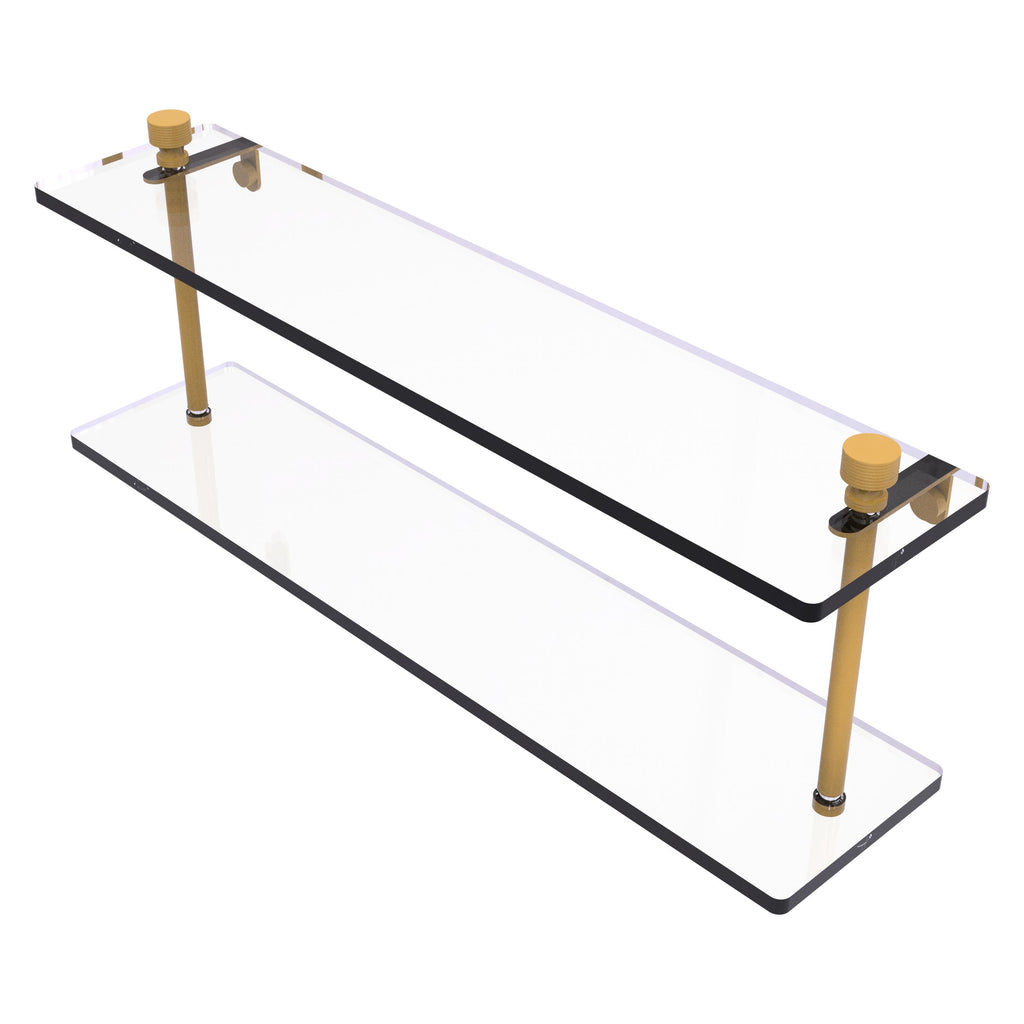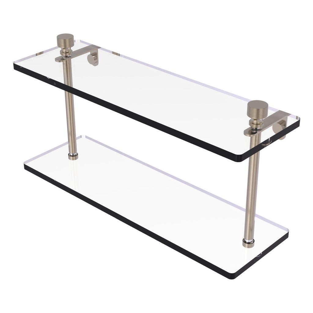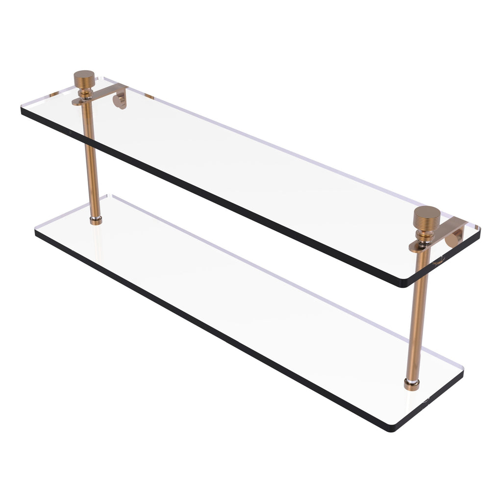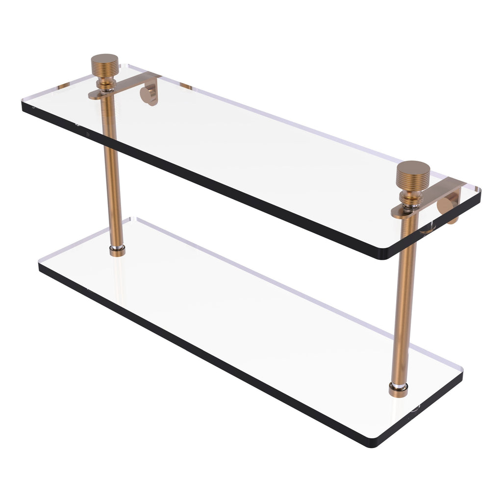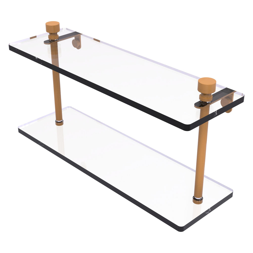 Add space and organization to your bathroom with this simple, contemporary design 2-tier glass vanity shelf. Featuring tempered, beveled-edged glass and solid brass hardware this shelving unit is crafted for durability, strength and style. One of the many coordinating accessories in the Allied Brass collection of products, this subtle glass shelf unit is the perfect complement to your bathroom decor.