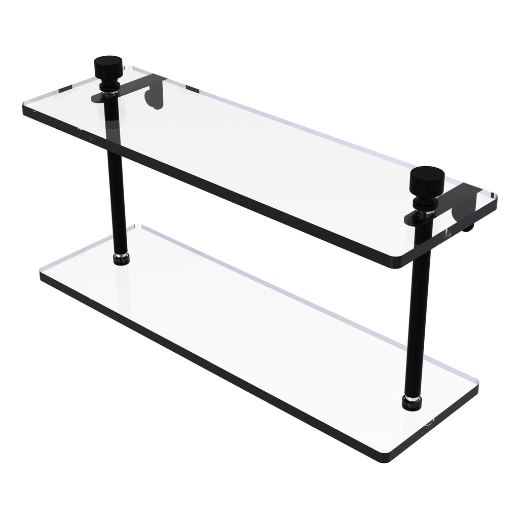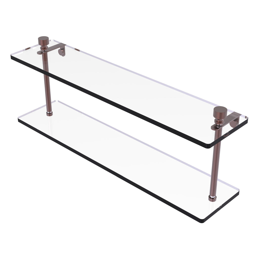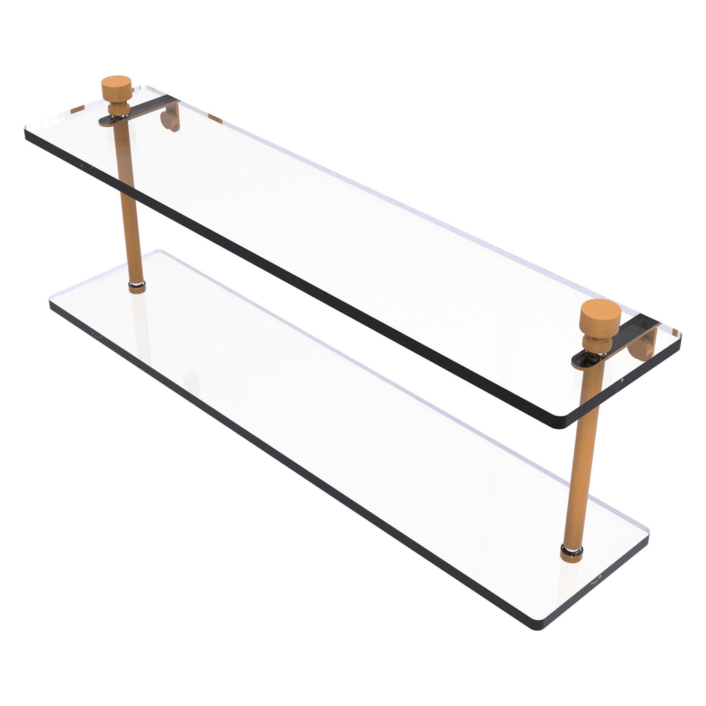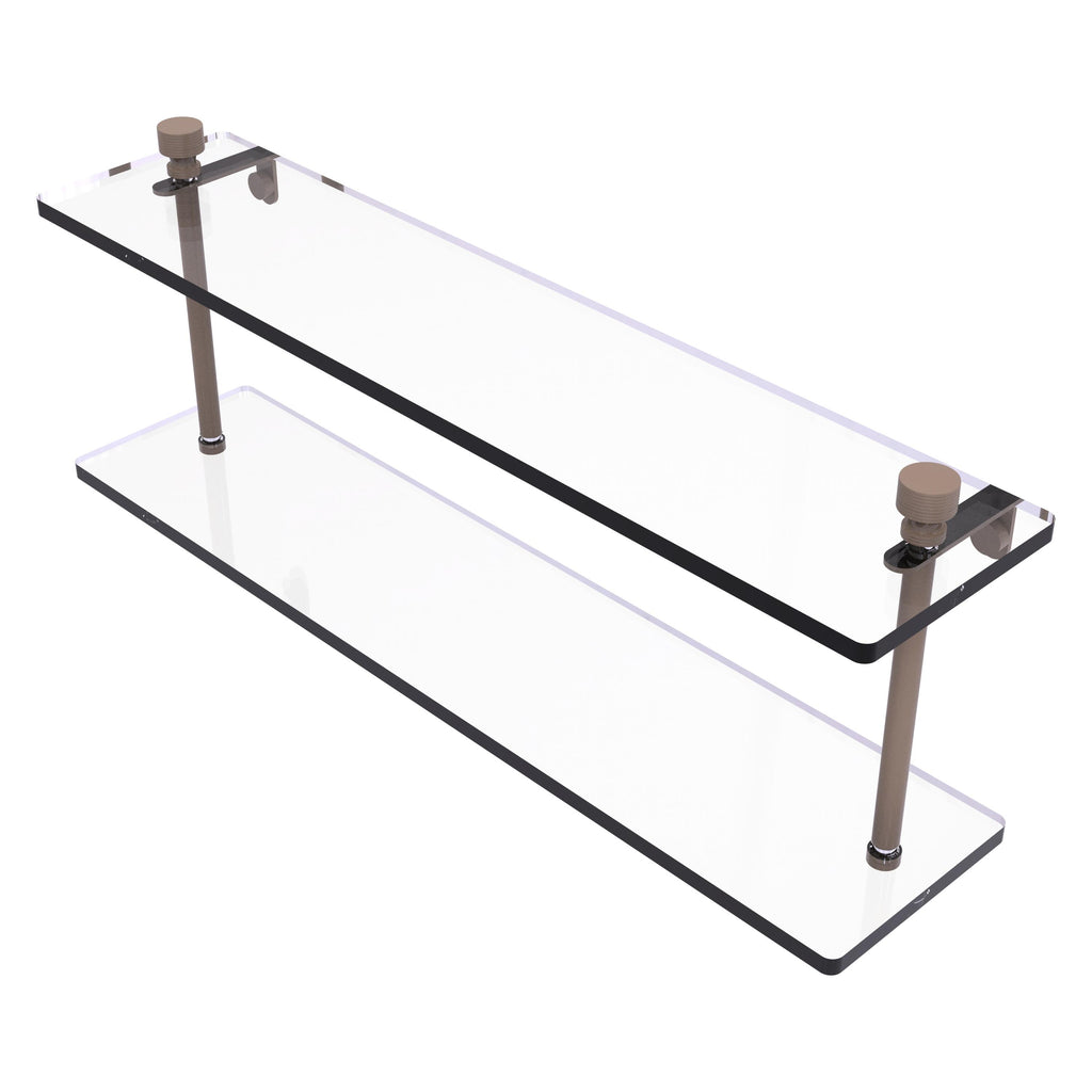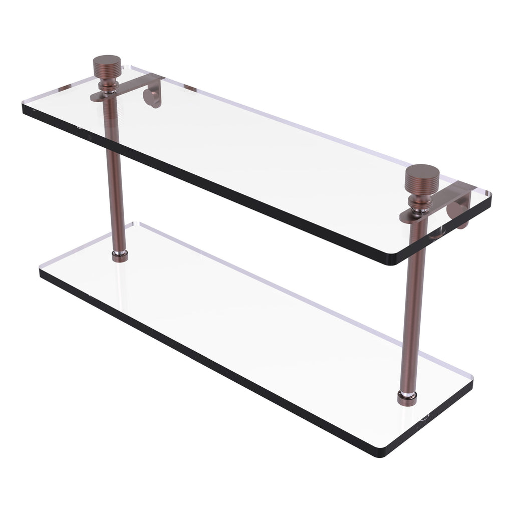 Add space and organization to your bathroom with this simple, contemporary design 2-tier glass vanity shelf. Featuring tempered, beveled-edged glass and solid brass hardware this shelving unit is crafted for durability, strength and style. One of the many coordinating accessories in the Allied Brass collection of products, this subtle glass shelf unit is the perfect complement to your bathroom decor.