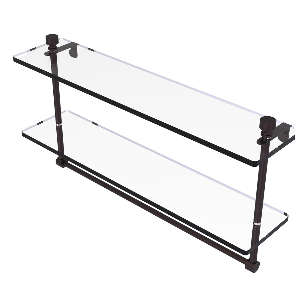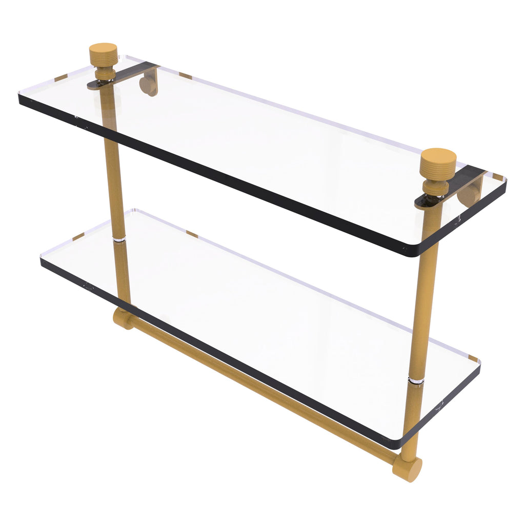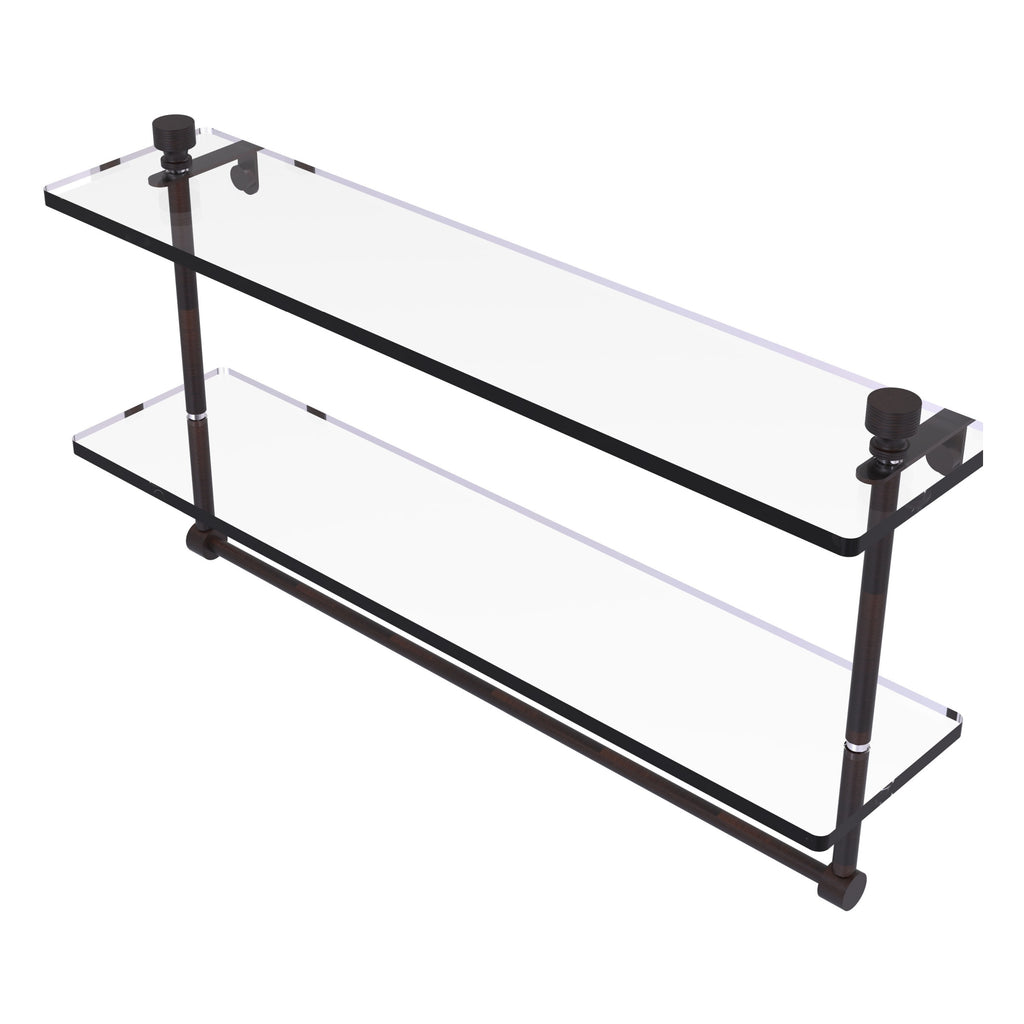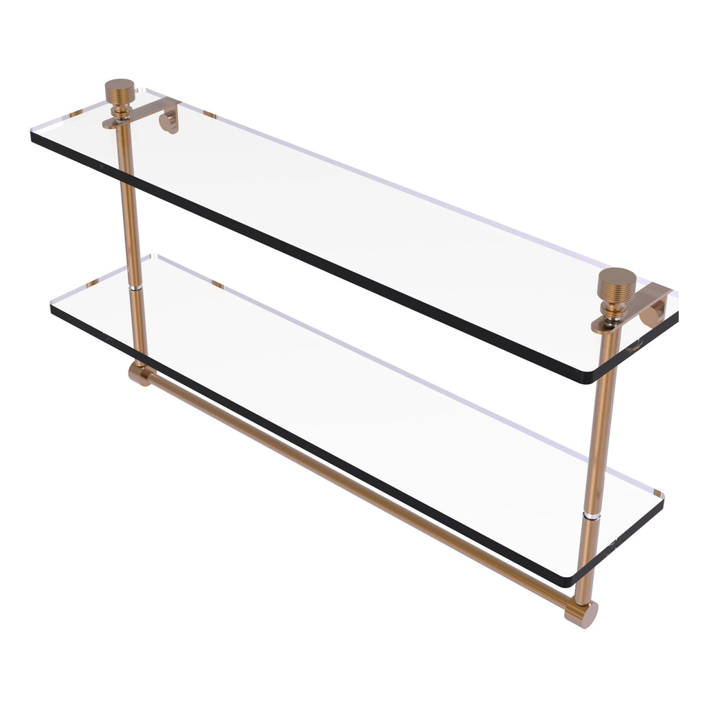 Add space and organization to your bathroom with this simple, contemporary style glass shelf. Featuring tempered, beveled-edged glass and solid brass hardware this shelf is crafted for durability, strength and style. Integrated towel bar provides space for your favorite decorative towels or for your everyday use. One of the many coordinating accessories in the Allied Brass Collection of products, this subtle glass shelf is the perfect complement to your bathroom decor.