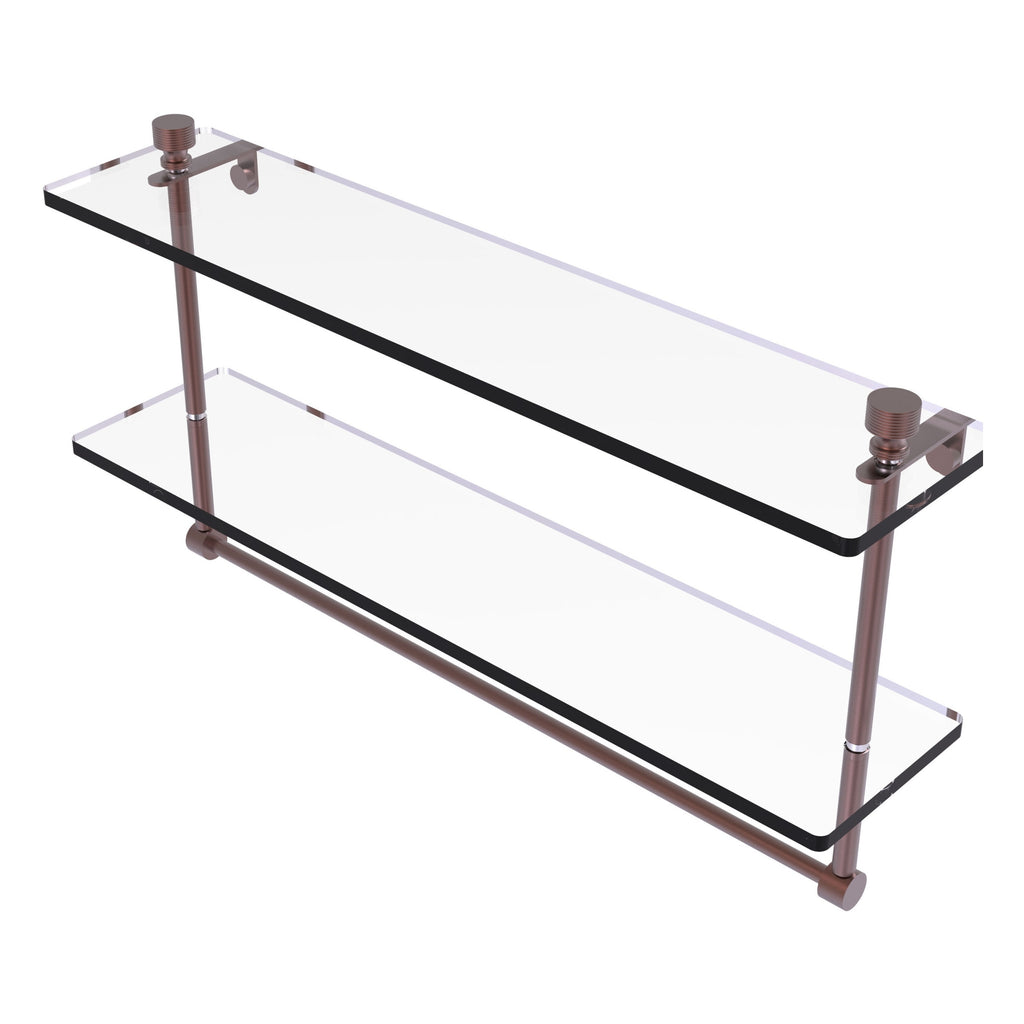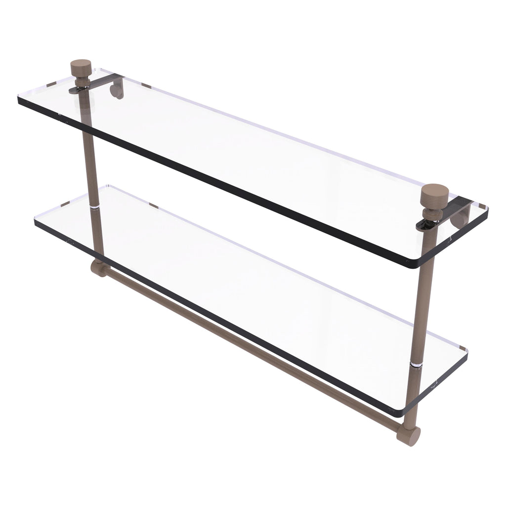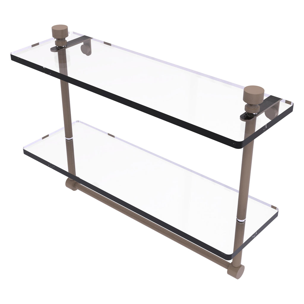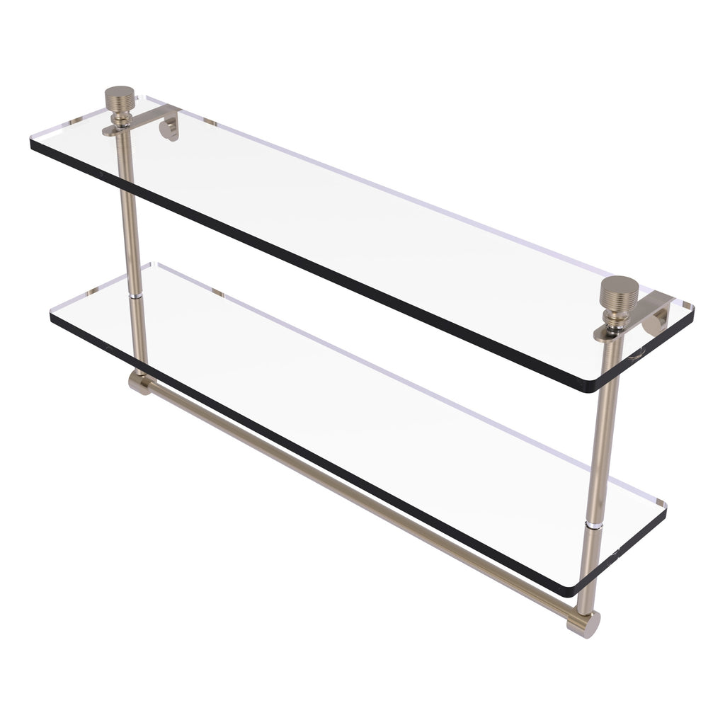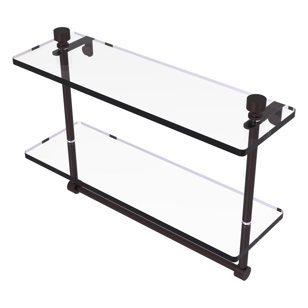 Add space and organization to your bathroom with this simple, contemporary style glass shelf. Featuring tempered, beveled-edged glass and solid brass hardware this shelf is crafted for durability, strength and style. Integrated towel bar provides space for your favorite decorative towels or for your everyday use. One of the many coordinating accessories in the Allied Brass Collection of products, this subtle glass shelf is the perfect complement to your bathroom decor.