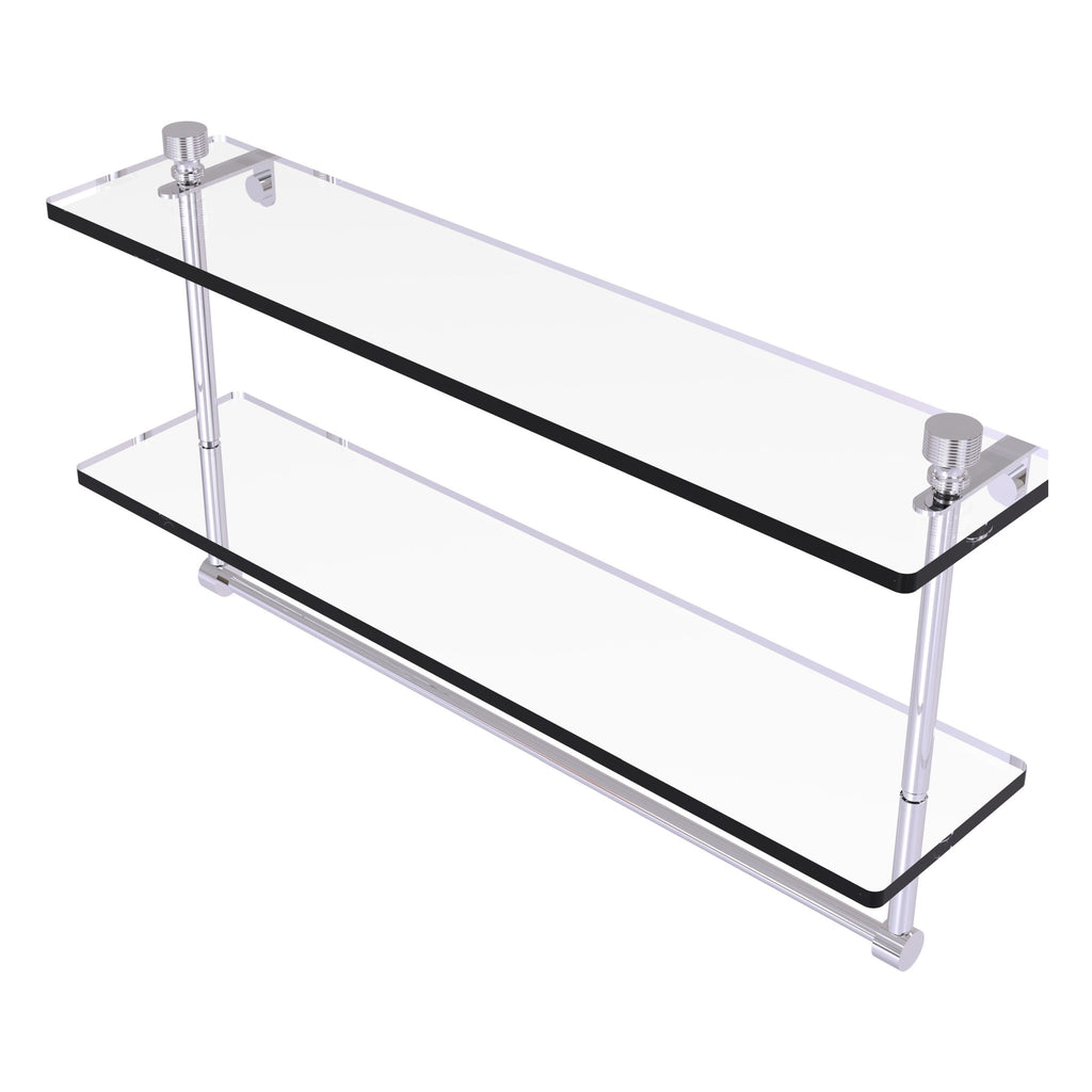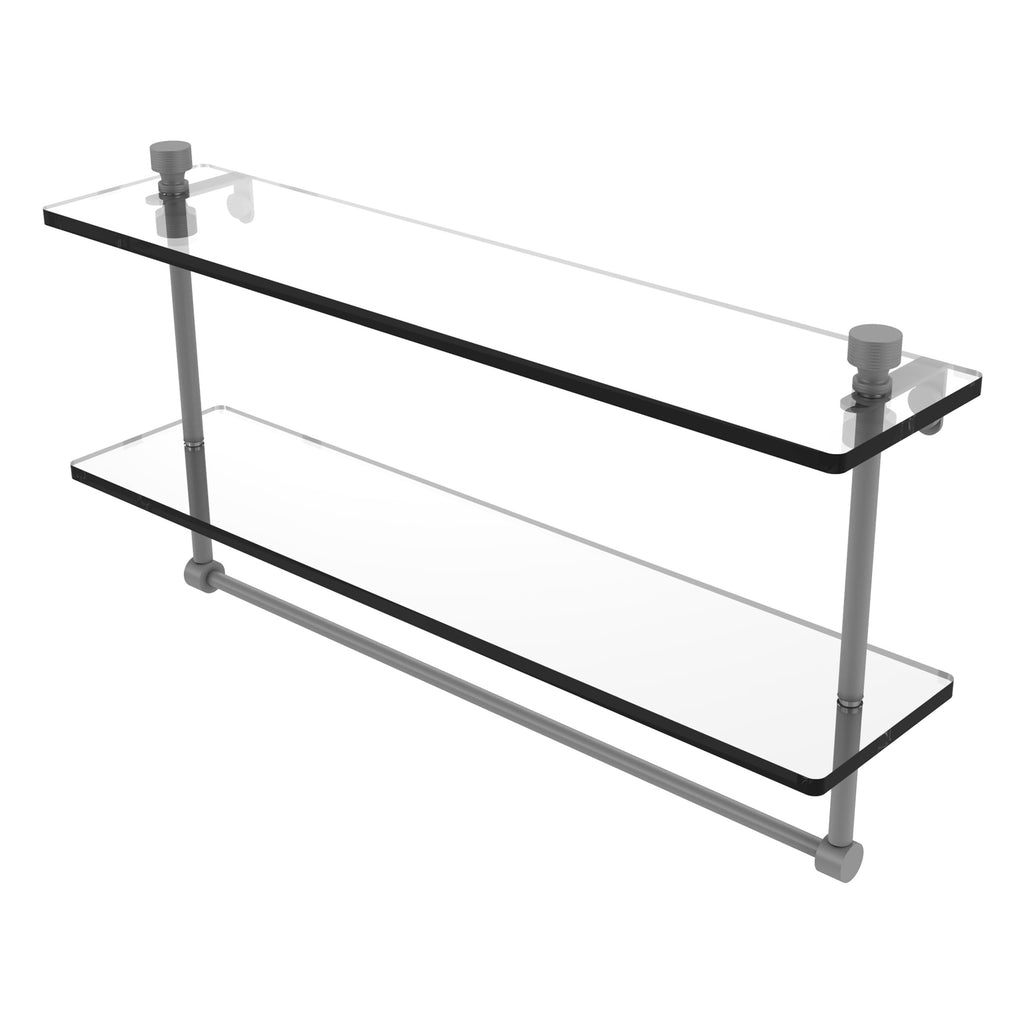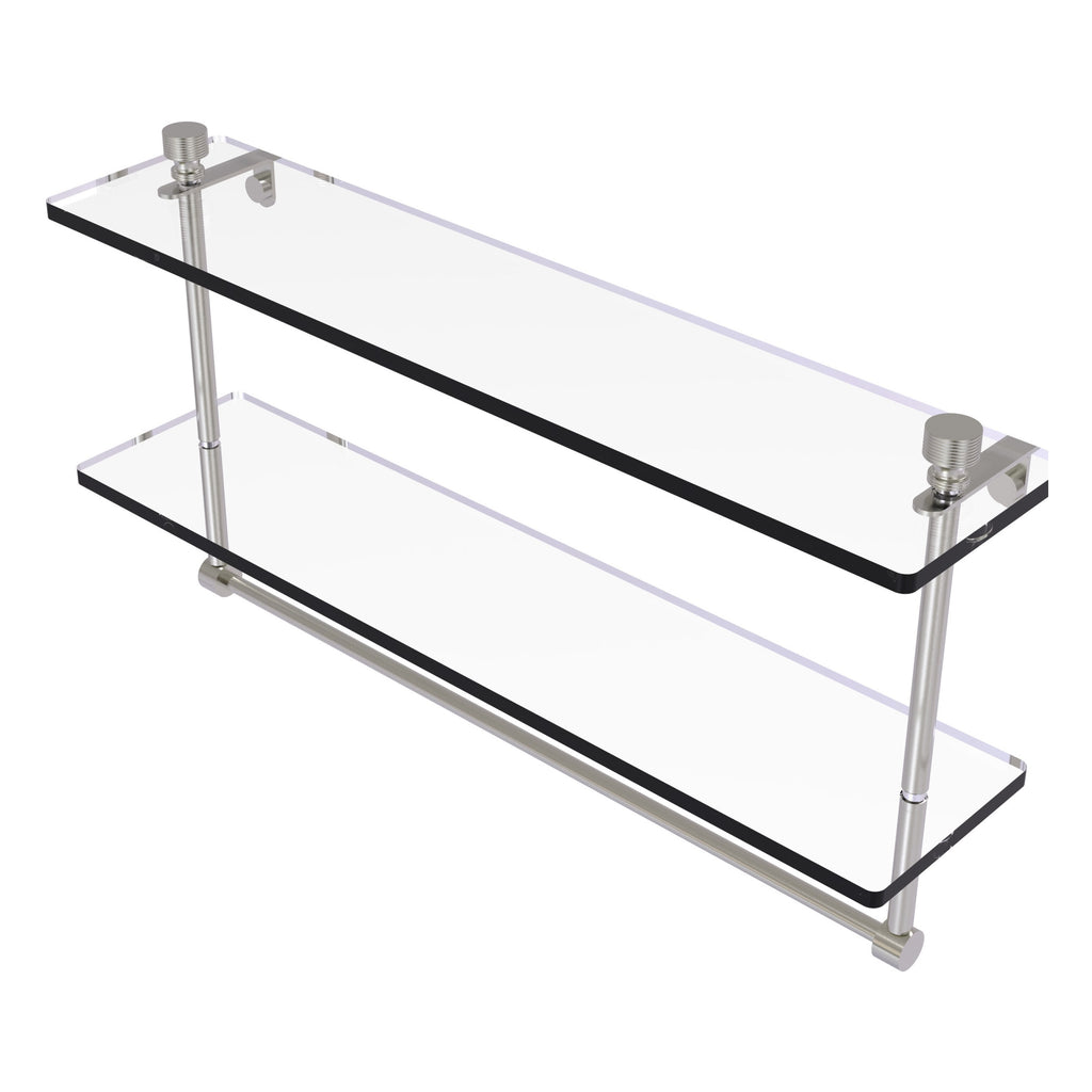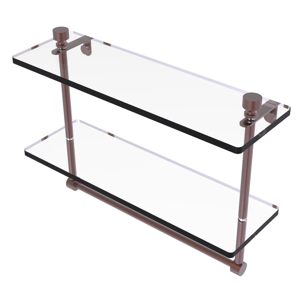 Add space and organization to your bathroom with this simple, contemporary style glass shelf. Featuring tempered, beveled-edged glass and solid brass hardware this shelf is crafted for durability, strength and style. Integrated towel bar provides space for your favorite decorative towels or for your everyday use. One of the many coordinating accessories in the Allied Brass Collection of products, this subtle glass shelf is the perfect complement to your bathroom decor.
