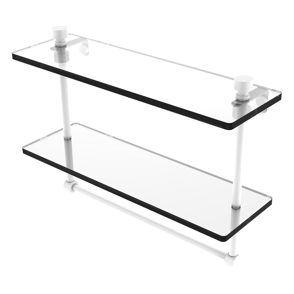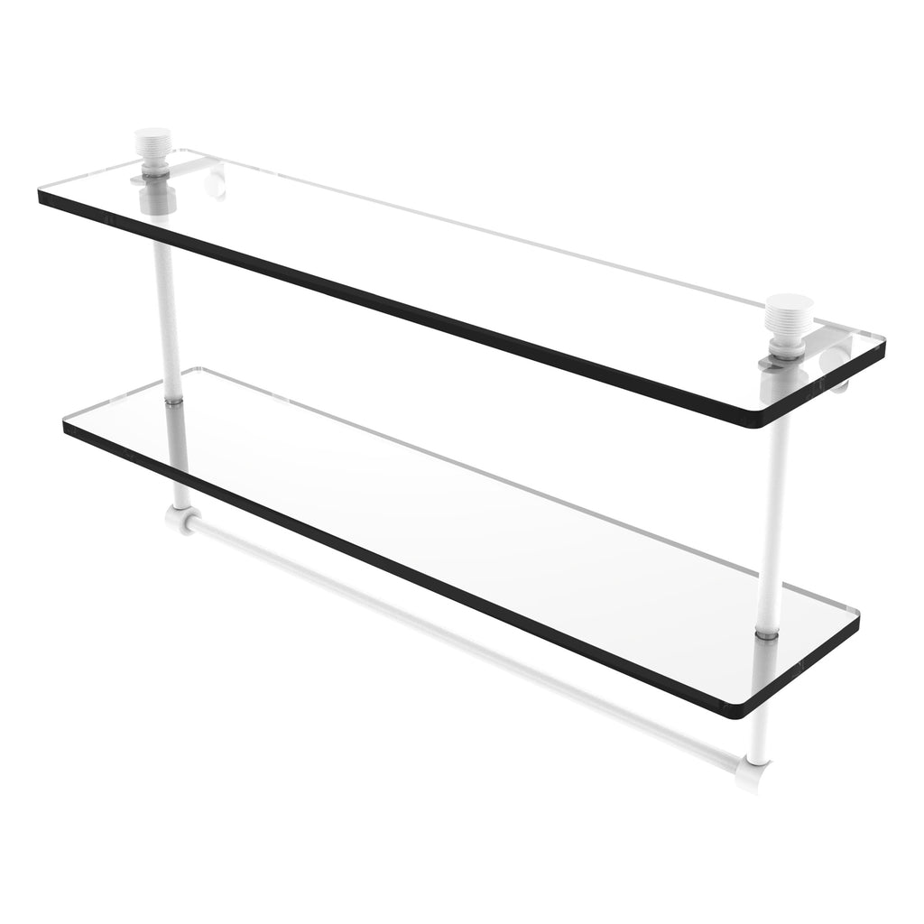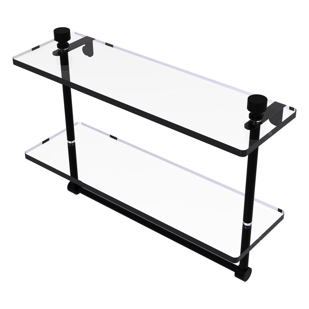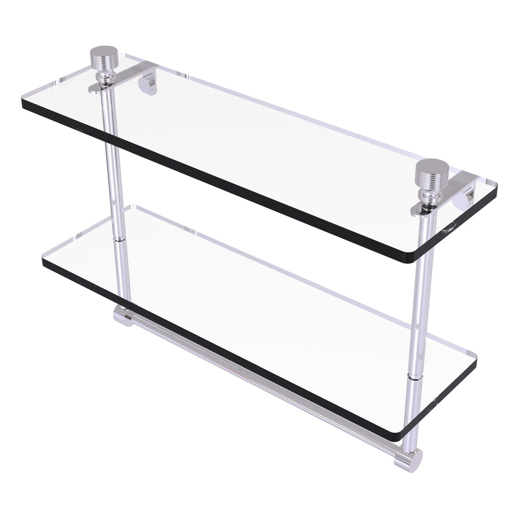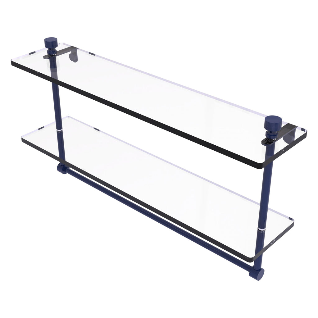 Add space and organization to your bathroom with this simple, contemporary style glass shelf. Featuring tempered, beveled-edged glass and solid brass hardware this shelf is crafted for durability, strength and style. Integrated towel bar provides space for your favorite decorative towels or for your everyday use. One of the many coordinating accessories in the Allied Brass Collection of products, this subtle glass shelf is the perfect complement to your bathroom decor.