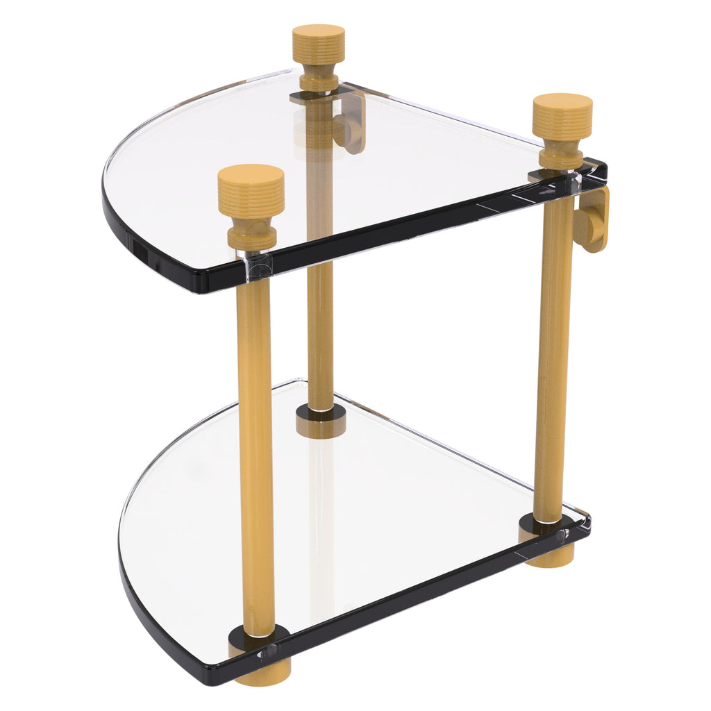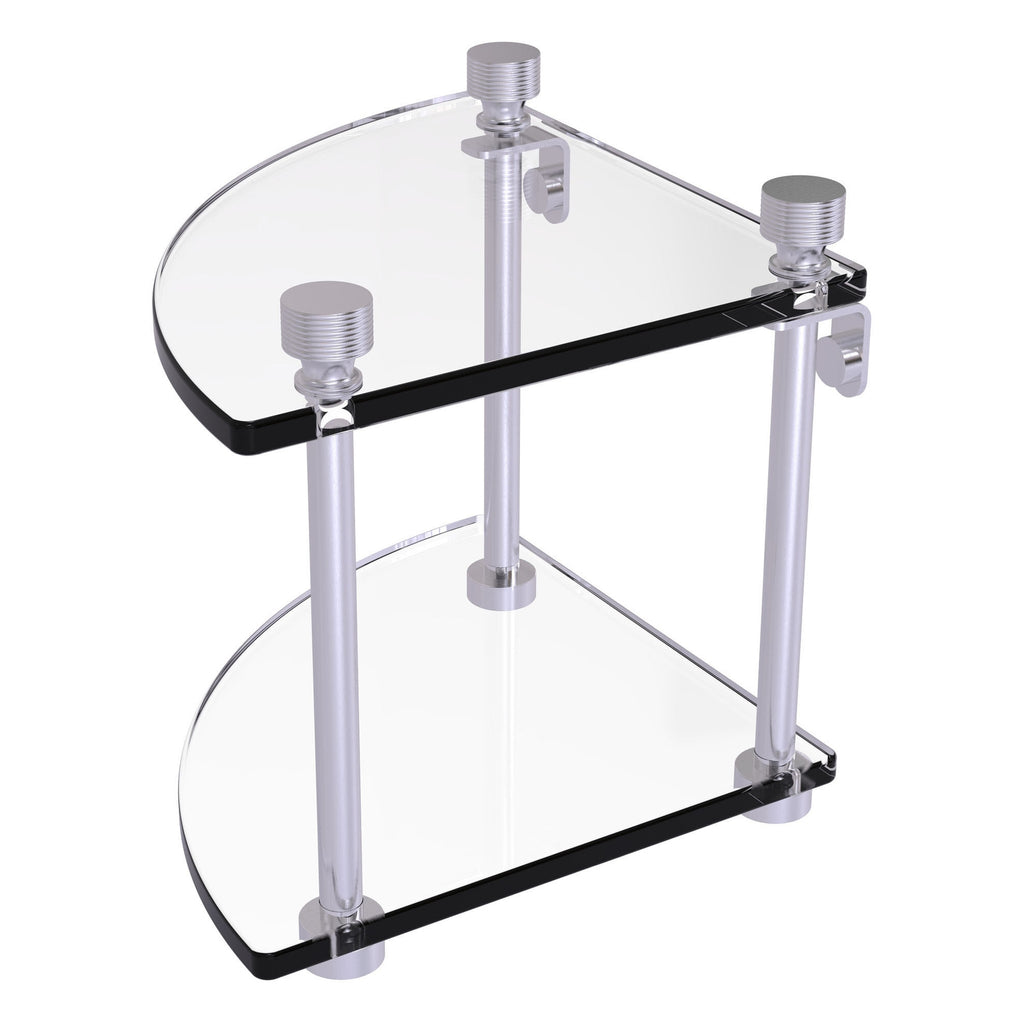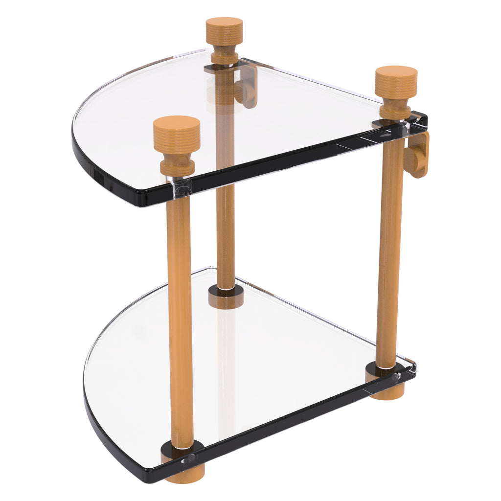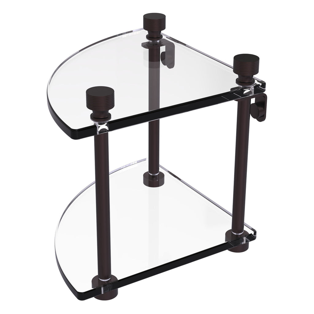 Add space and organization to your bathroom with this simple, contemporary design 2-tier glass vanity corner shelf. Featuring tempered, beveled-edged glass and solid brass hardware this shelving unit is crafted for durability, strength and style. One of the many coordinating accessories in the Allied Brass collection of products, this subtle glass shelf unit is the perfect complement to your bathroom decor.