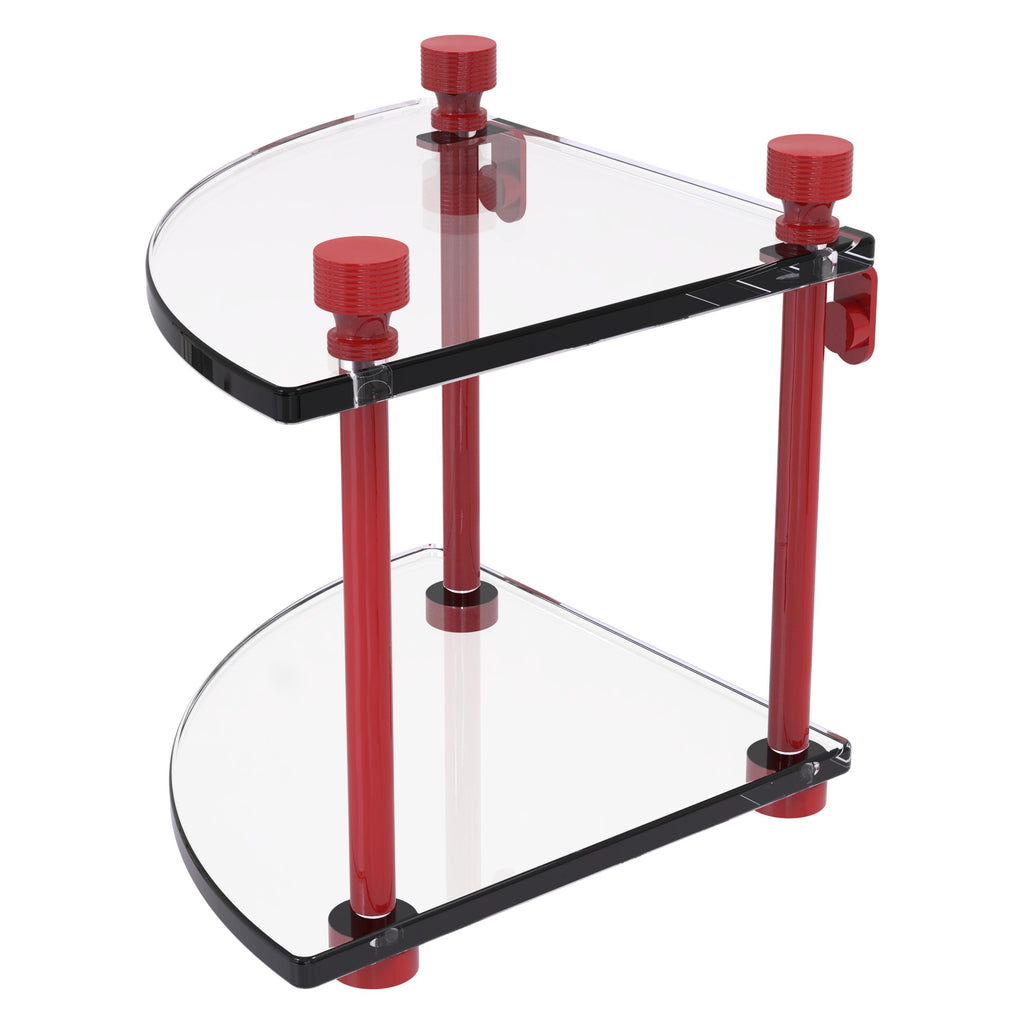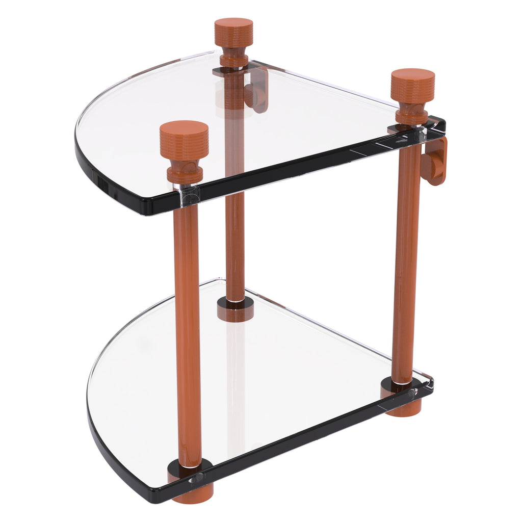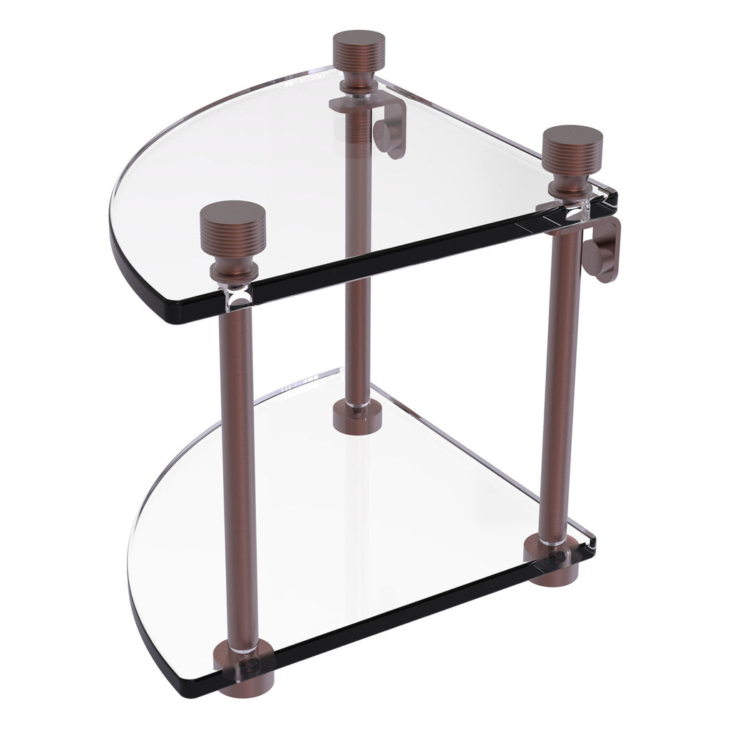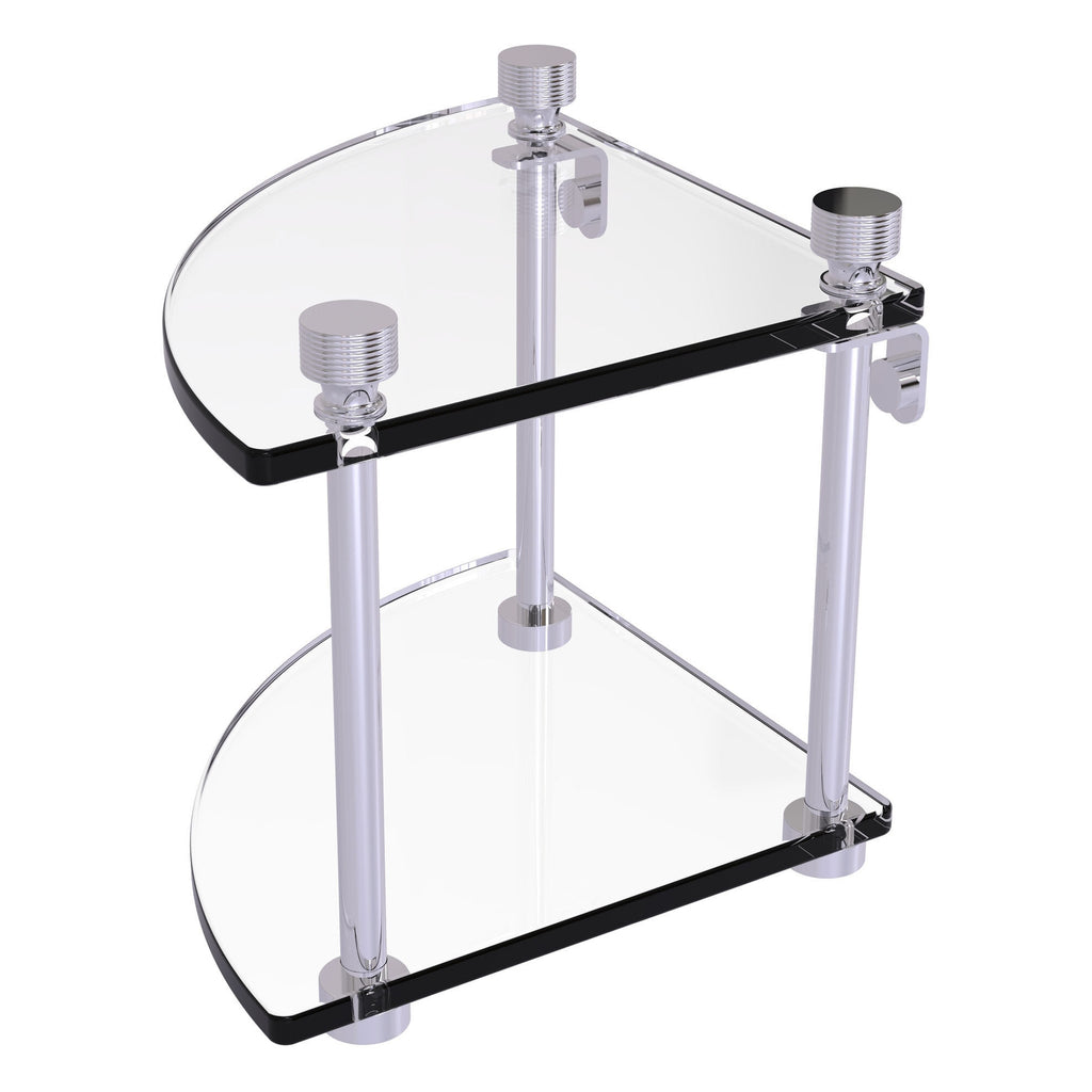 Add space and organization to your bathroom with this simple, contemporary design 2-tier glass vanity corner shelf. Featuring tempered, beveled-edged glass and solid brass hardware this shelving unit is crafted for durability, strength and style. One of the many coordinating accessories in the Allied Brass collection of products, this subtle glass shelf unit is the perfect complement to your bathroom decor.