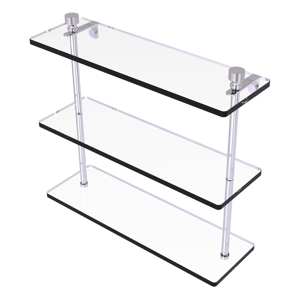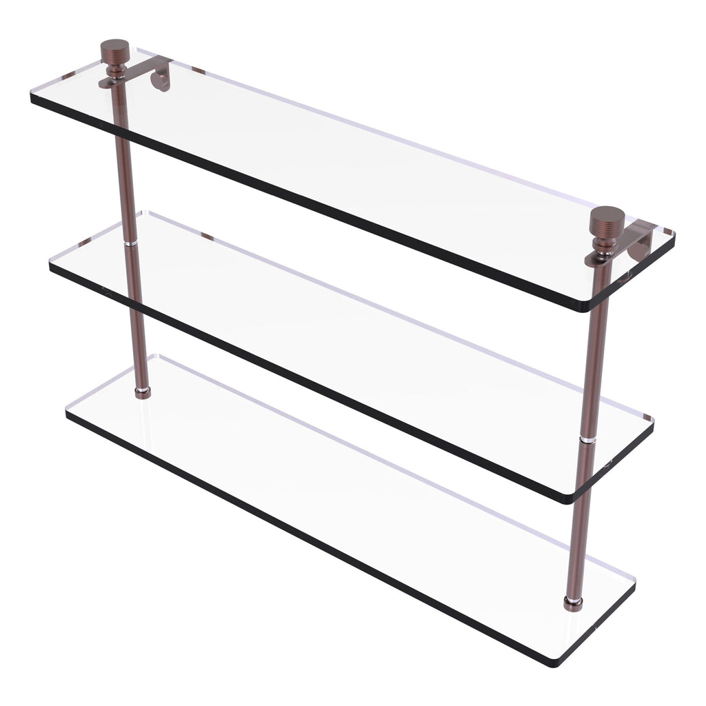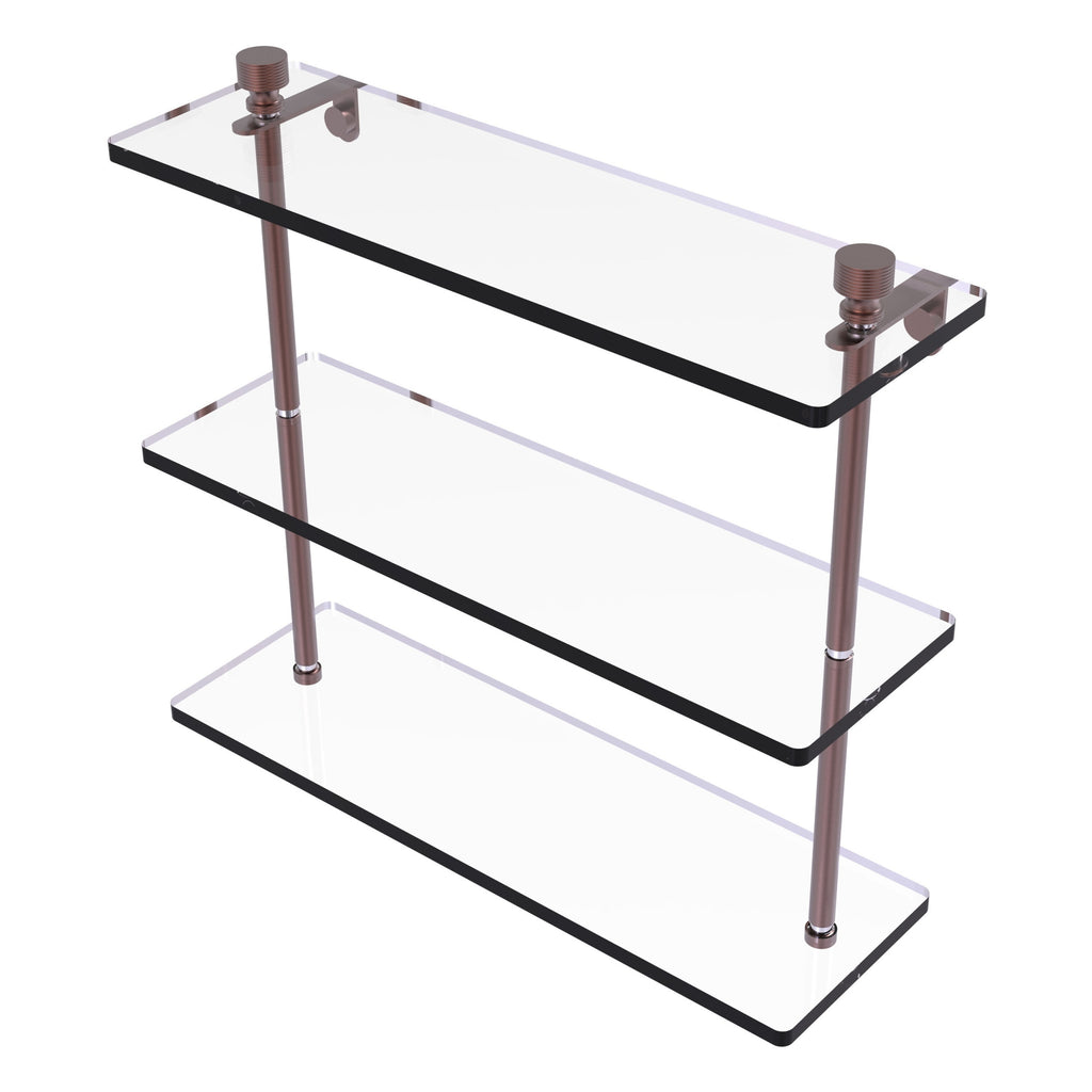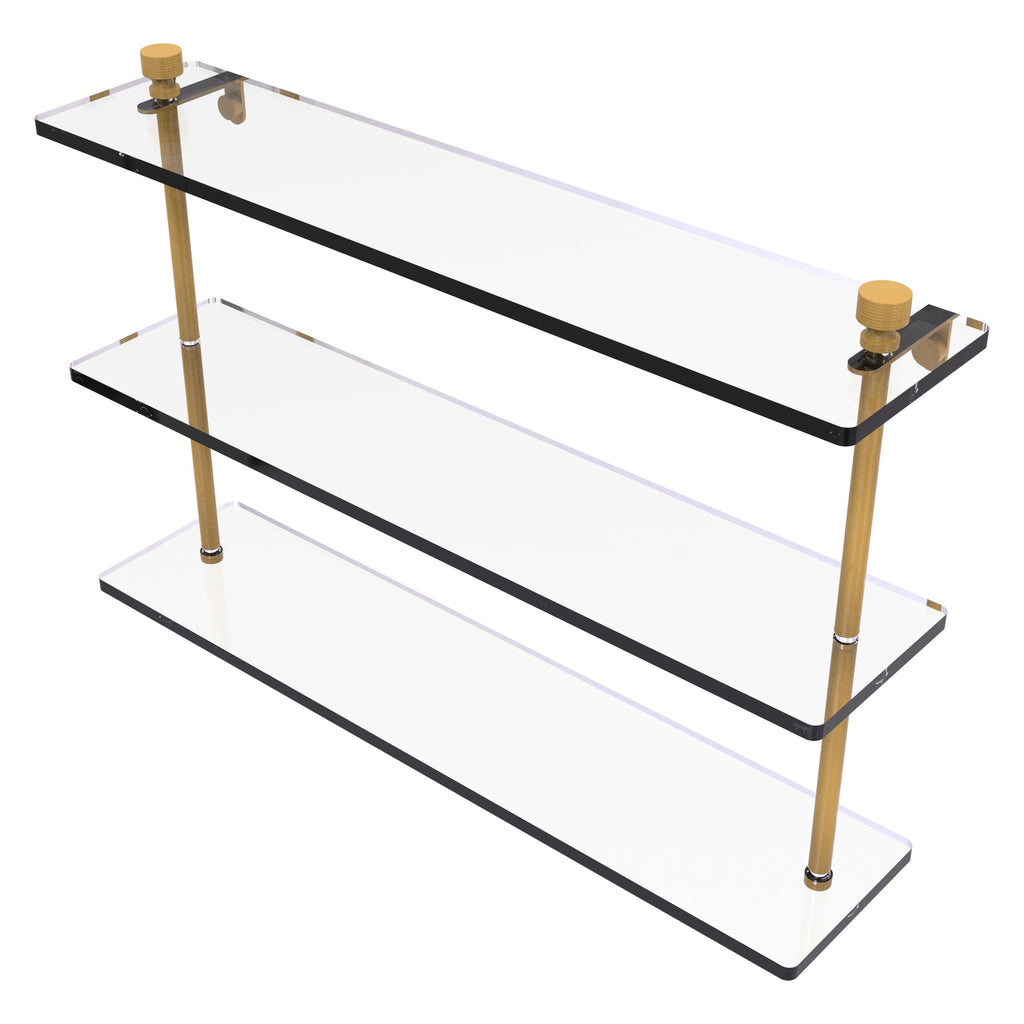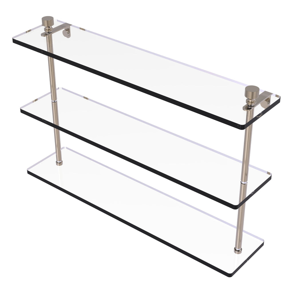 Add space and organization to your bathroom with this simple, contemporary design 3-tier glass vanity shelf. Featuring tempered, beveled-edged glass and solid brass hardware this shelving unit is crafted for durability, strength and style. One of the many coordinating accessories in the Allied Brass collection of products, this subtle glass shelf unit is the perfect complement to your bathroom decor.