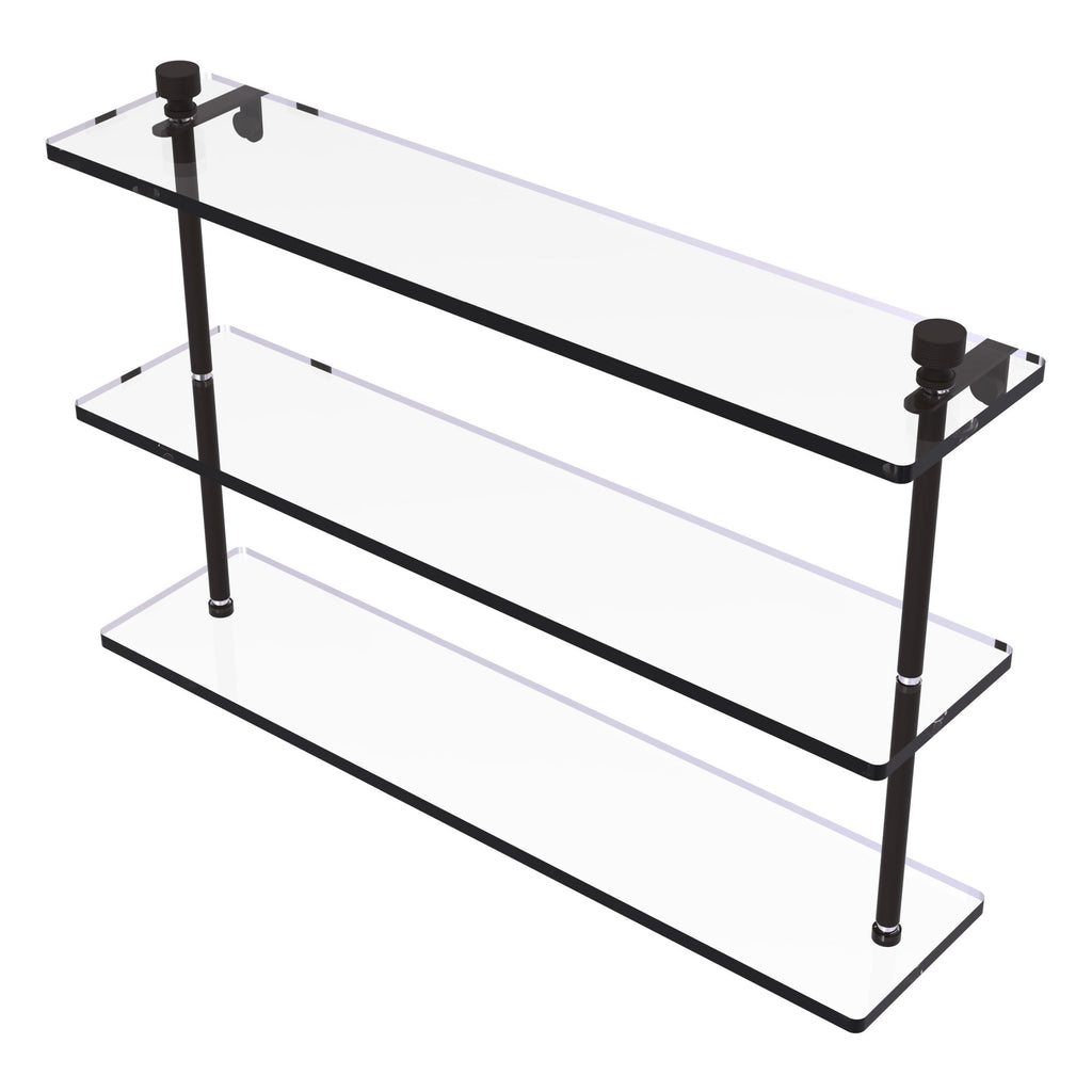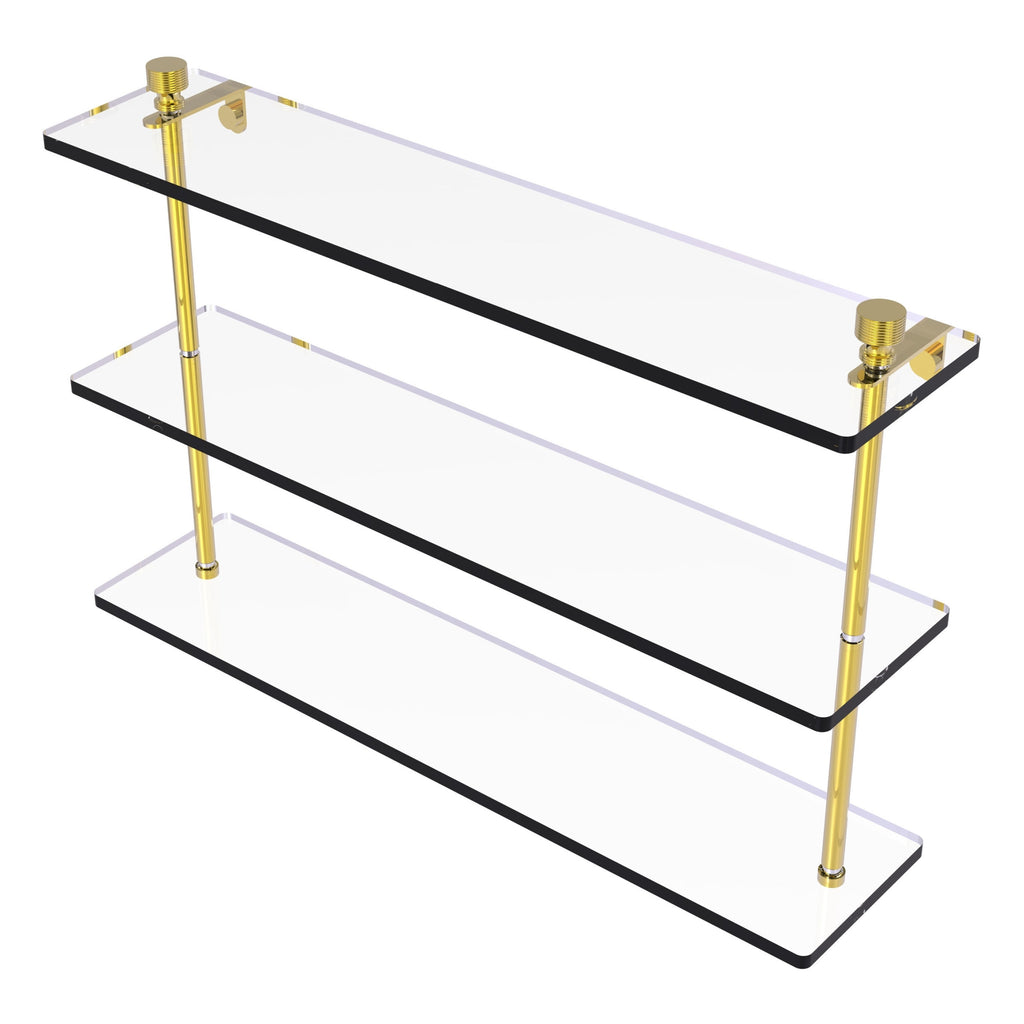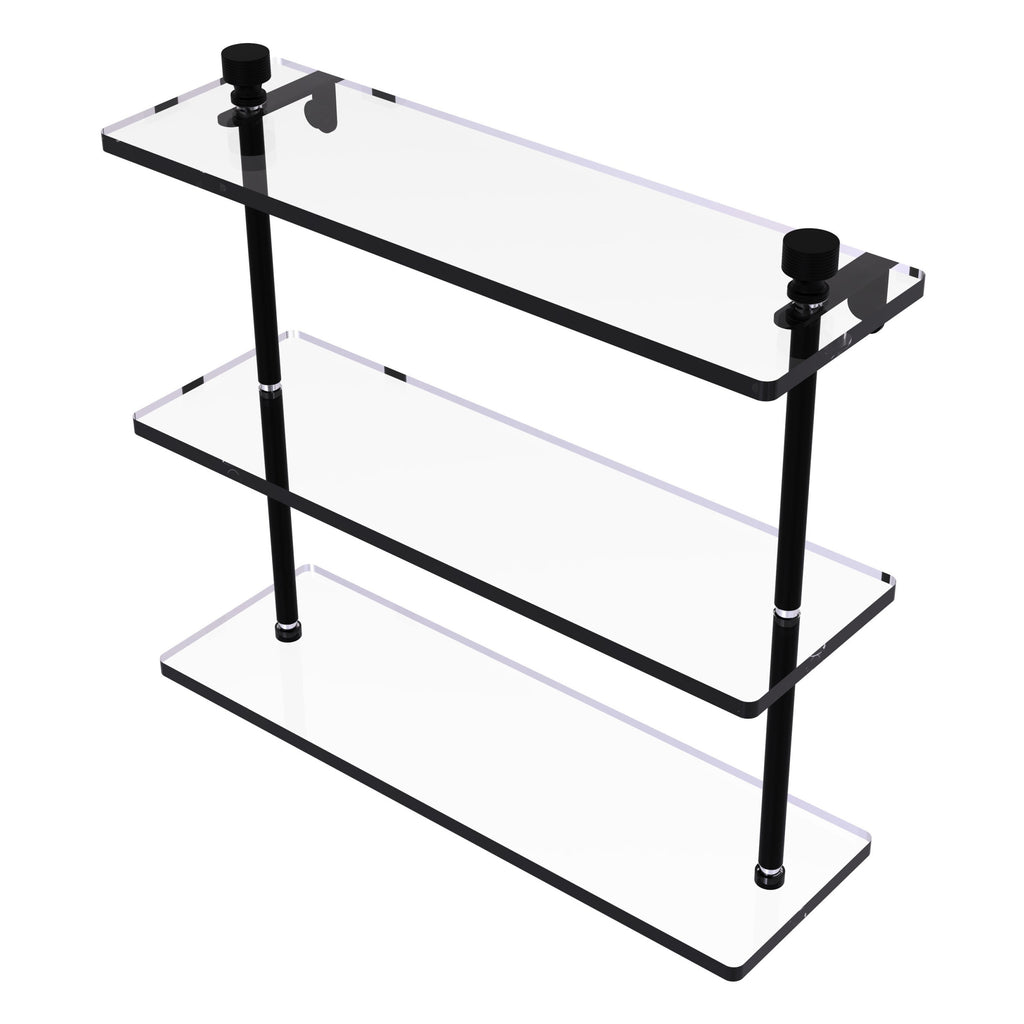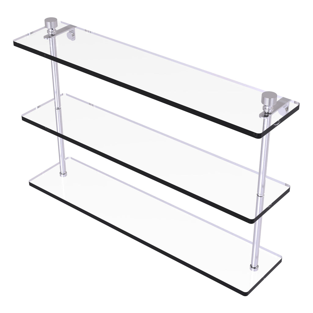 Add space and organization to your bathroom with this simple, contemporary design 3-tier glass vanity shelf. Featuring tempered, beveled-edged glass and solid brass hardware this shelving unit is crafted for durability, strength and style. One of the many coordinating accessories in the Allied Brass collection of products, this subtle glass shelf unit is the perfect complement to your bathroom decor.