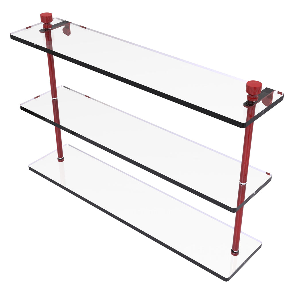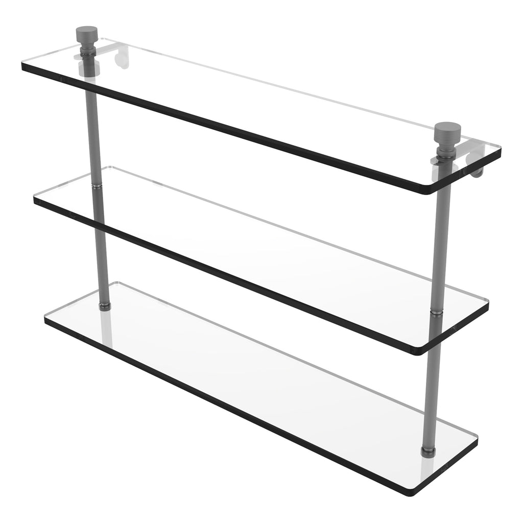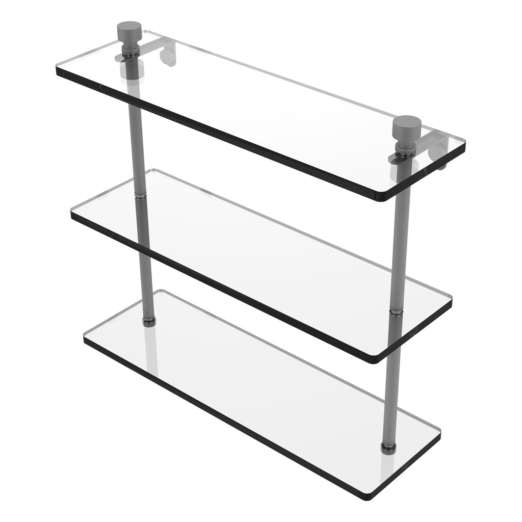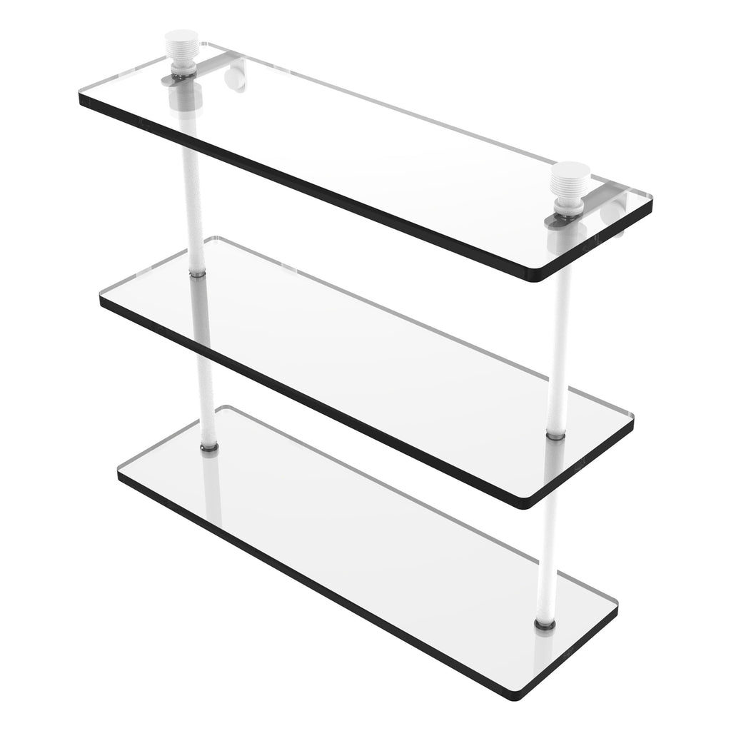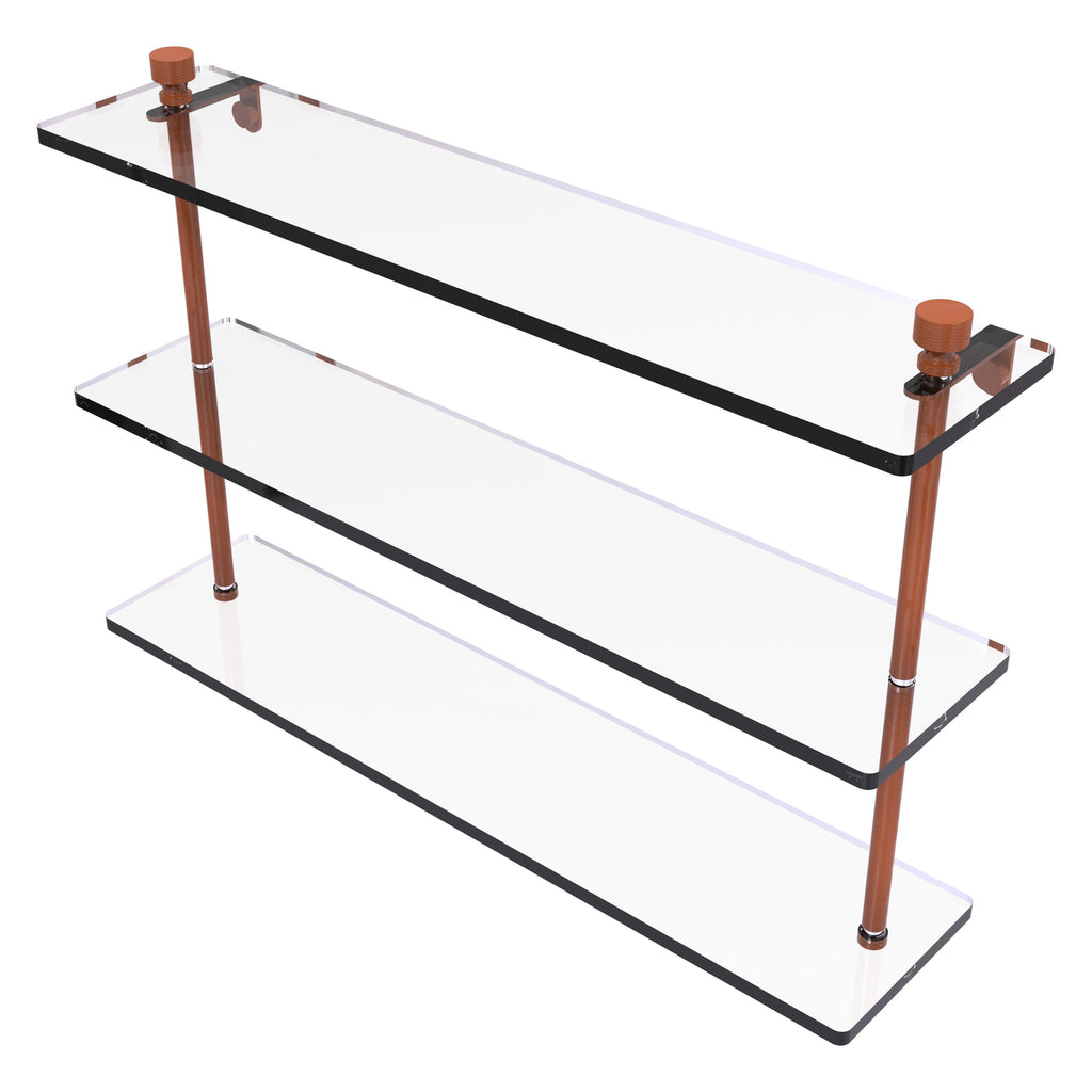 Add space and organization to your bathroom with this simple, contemporary design 3-tier glass vanity shelf. Featuring tempered, beveled-edged glass and solid brass hardware this shelving unit is crafted for durability, strength and style. One of the many coordinating accessories in the Allied Brass collection of products, this subtle glass shelf unit is the perfect complement to your bathroom decor.