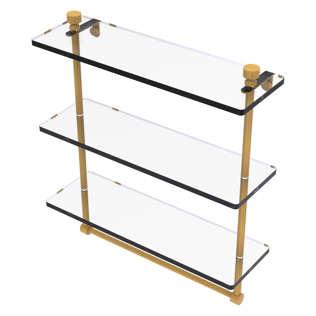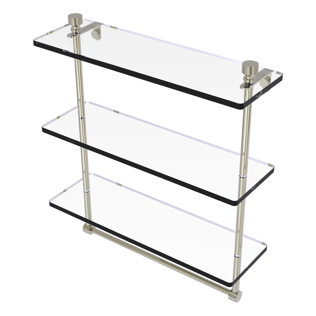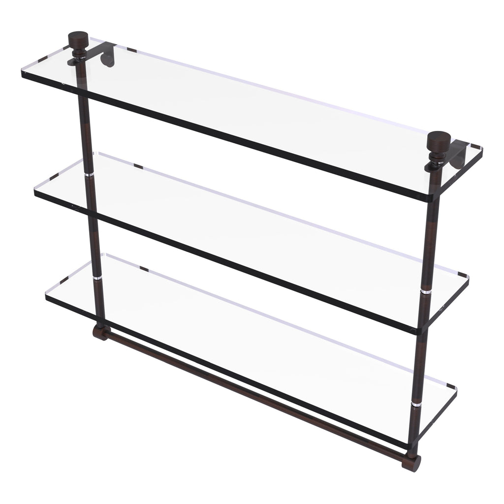 Add space and organization to your bathroom with this simple, contemporary style glass shelf. Featuring tempered, beveled-edged glass and solid brass hardware this shelf is crafted for durability, strength and style. Integrated towel bar provides space for your favorite decorative towels or for your everyday use. One of the many coordinating accessories in the Allied Brass Collection of products, this subtle glass shelf is the perfect complement to your bathroom decor.