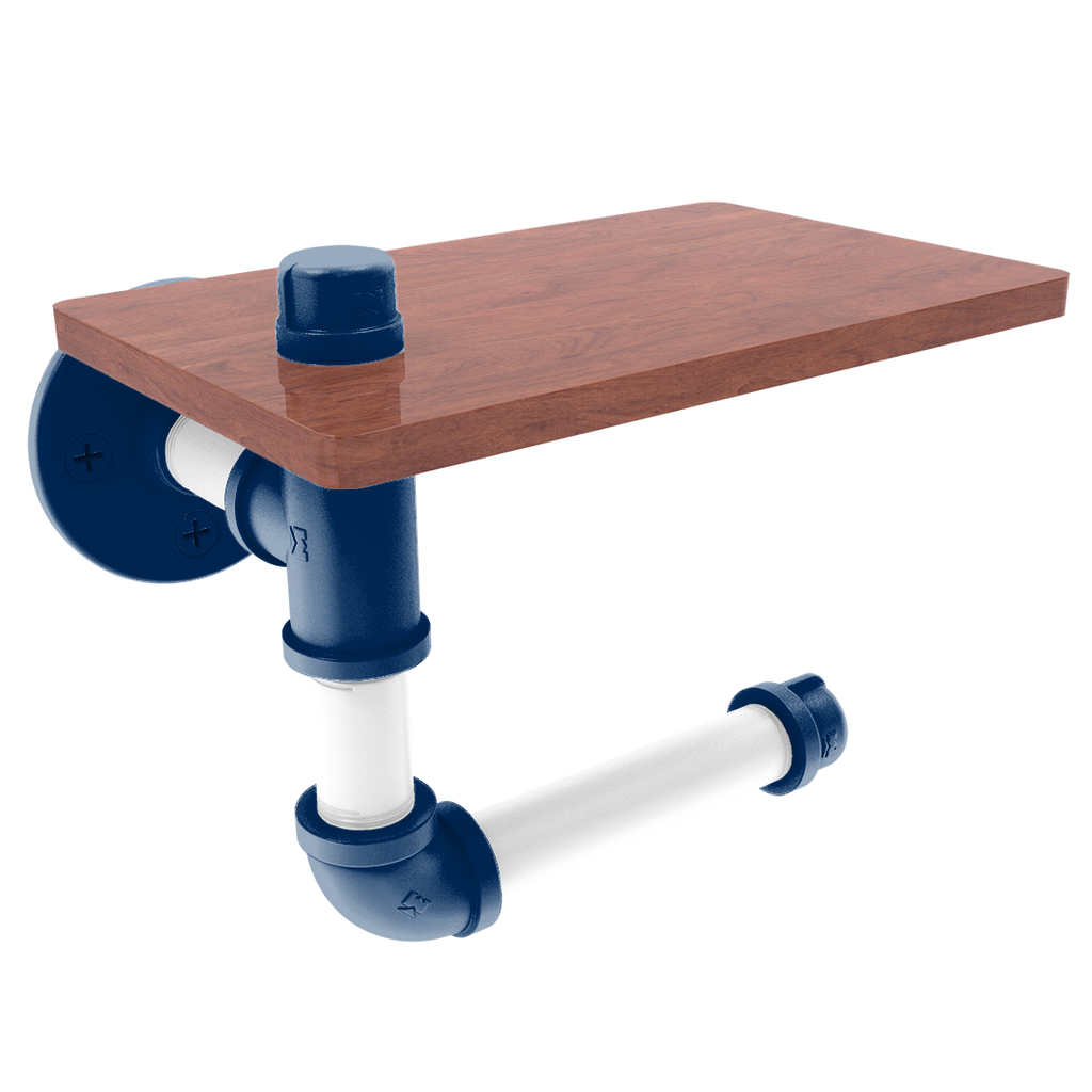 The innovative design includes a wooden shelf situated above the roll, providing a convenient space for personal items or extra toilet paper storage. This added functionality makes it an indispensable fixture for fans who value efficiency and flair. The wood's rich texture compliments the industrial aesthetic of the powder-coated pipe, blending modern and traditional elements seamlessly.