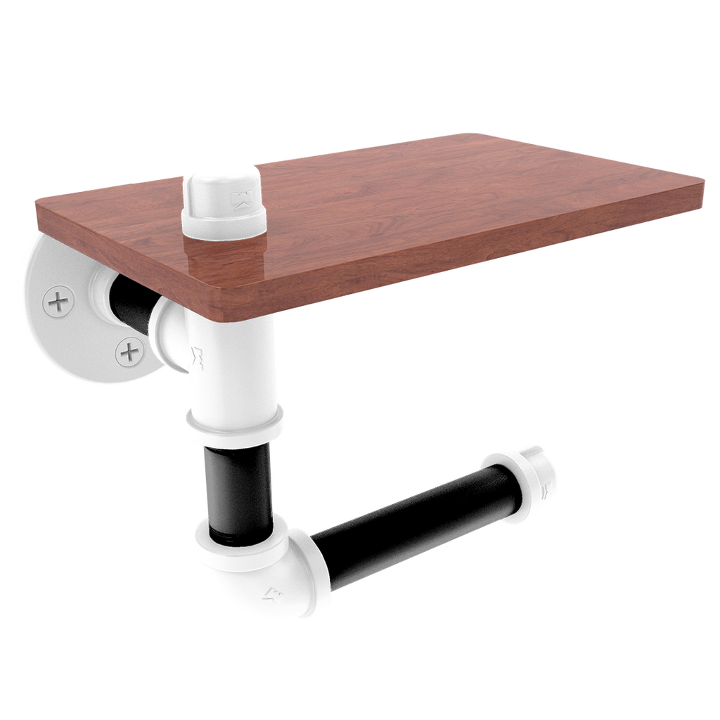 The innovative design includes a wooden shelf situated above the roll, providing a convenient space for personal items or extra toilet paper storage. This added functionality makes it an indispensable fixture for fans who value efficiency and flair. The wood's rich texture compliments the industrial aesthetic of the powder-coated pipe, blending modern and traditional elements seamlessly.