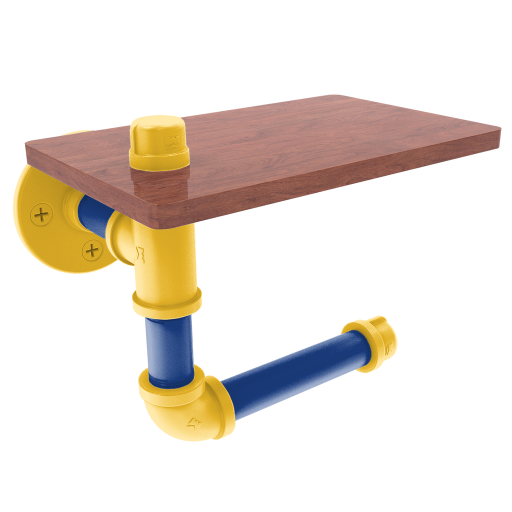 The innovative design includes a wooden shelf situated above the roll, providing a convenient space for personal items or extra toilet paper storage. This added functionality makes it an indispensable fixture for fans who value efficiency and flair. The wood's rich texture compliments the industrial aesthetic of the powder-coated pipe, blending modern and traditional elements seamlessly.