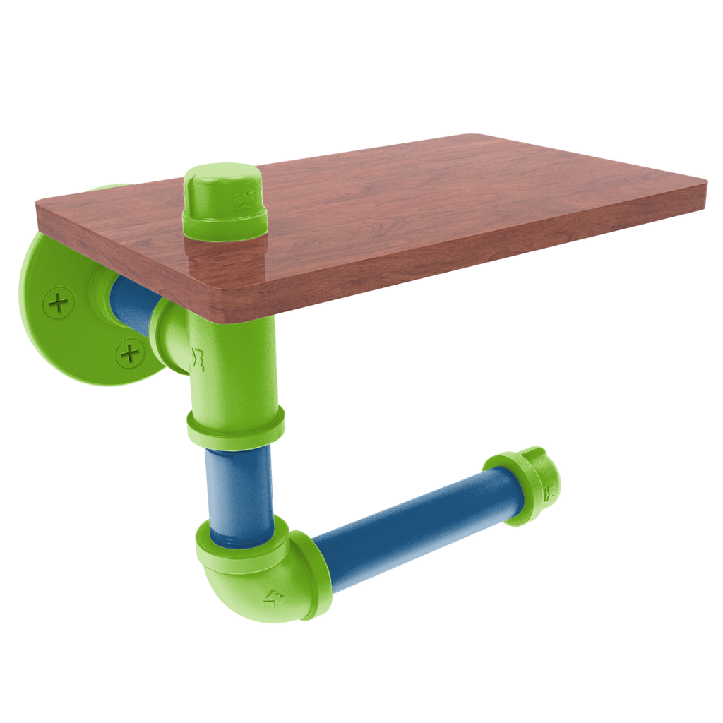 The innovative design includes a wooden shelf situated above the roll, providing a convenient space for personal items or extra toilet paper storage. This added functionality makes it an indispensable fixture for fans who value efficiency and flair. The wood's rich texture compliments the industrial aesthetic of the powder-coated pipe, blending modern and traditional elements seamlessly.