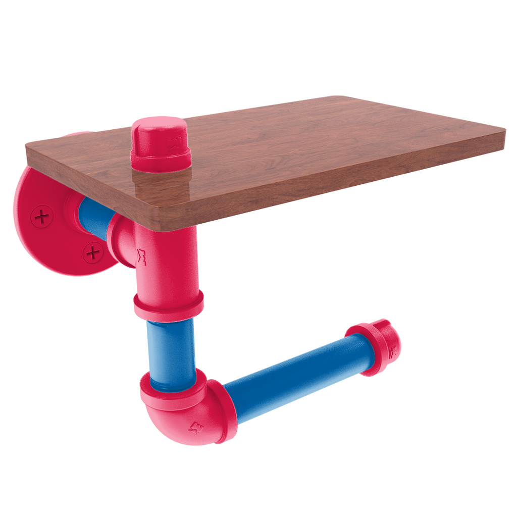 The innovative design includes a wooden shelf situated above the roll, providing a convenient space for personal items or extra toilet paper storage. This added functionality makes it an indispensable fixture for fans who value efficiency and flair. The wood's rich texture compliments the industrial aesthetic of the powder-coated pipe, blending modern and traditional elements seamlessly.