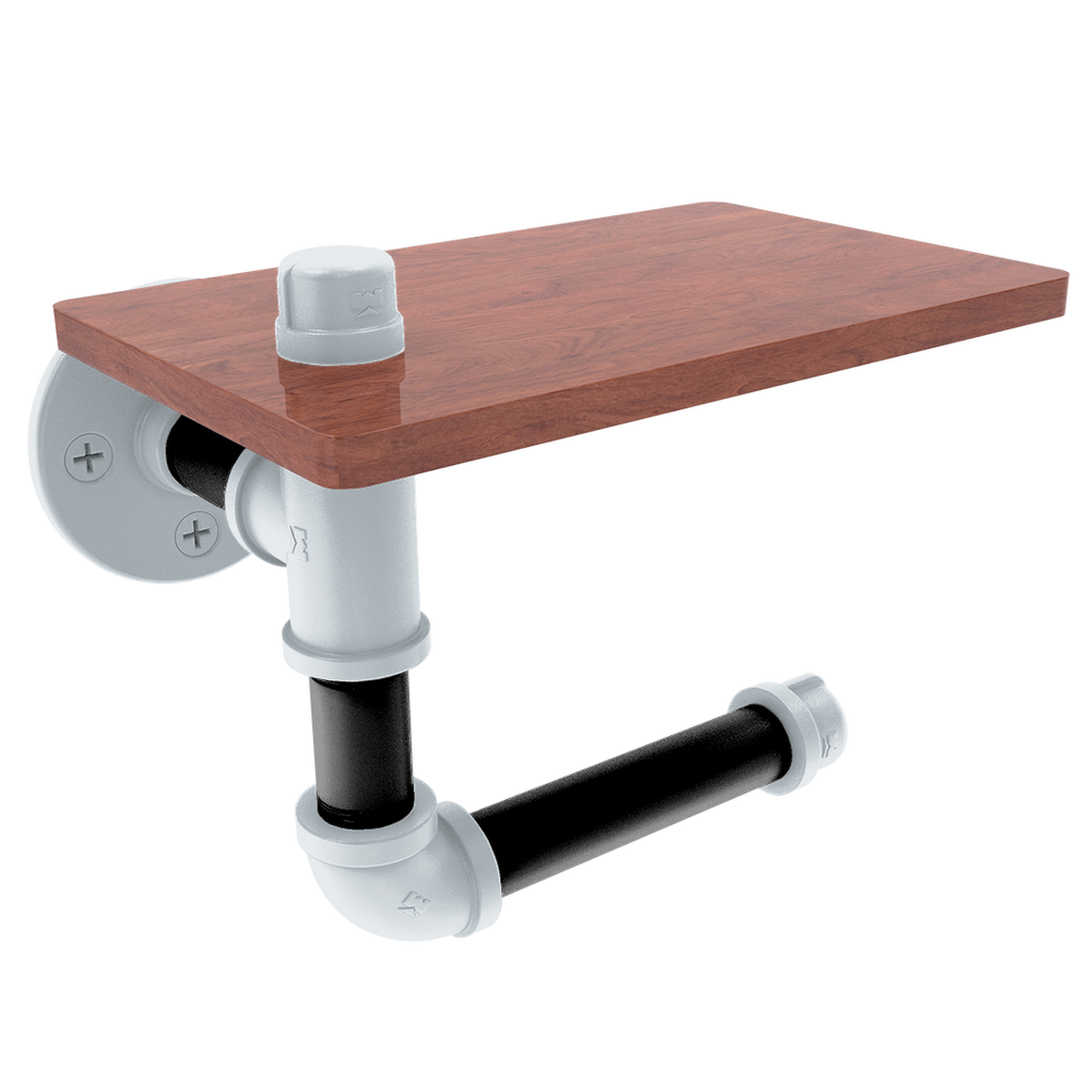 The innovative design includes a wooden shelf situated above the roll, providing a convenient space for personal items or extra toilet paper storage. This added functionality makes it an indispensable fixture for fans who value efficiency and flair. The wood's rich texture compliments the industrial aesthetic of the powder-coated pipe, blending modern and traditional elements seamlessly.