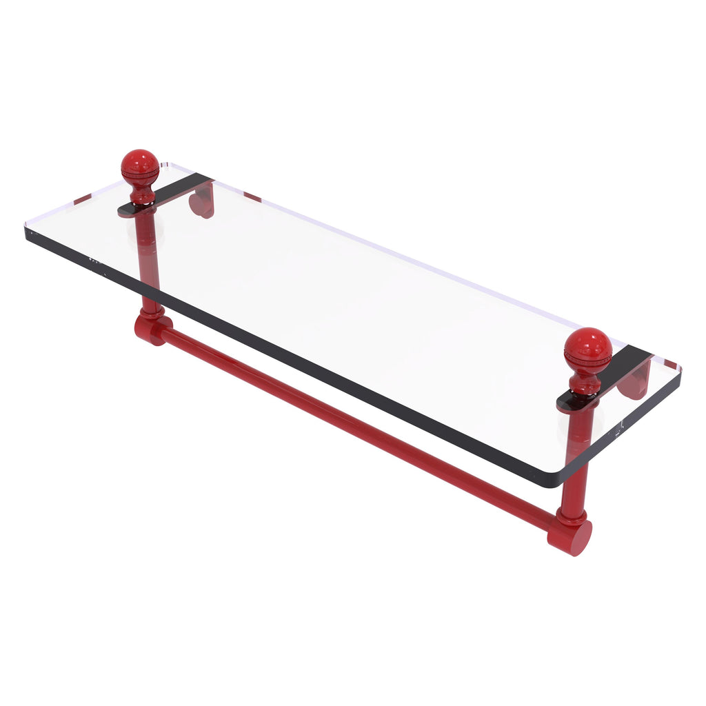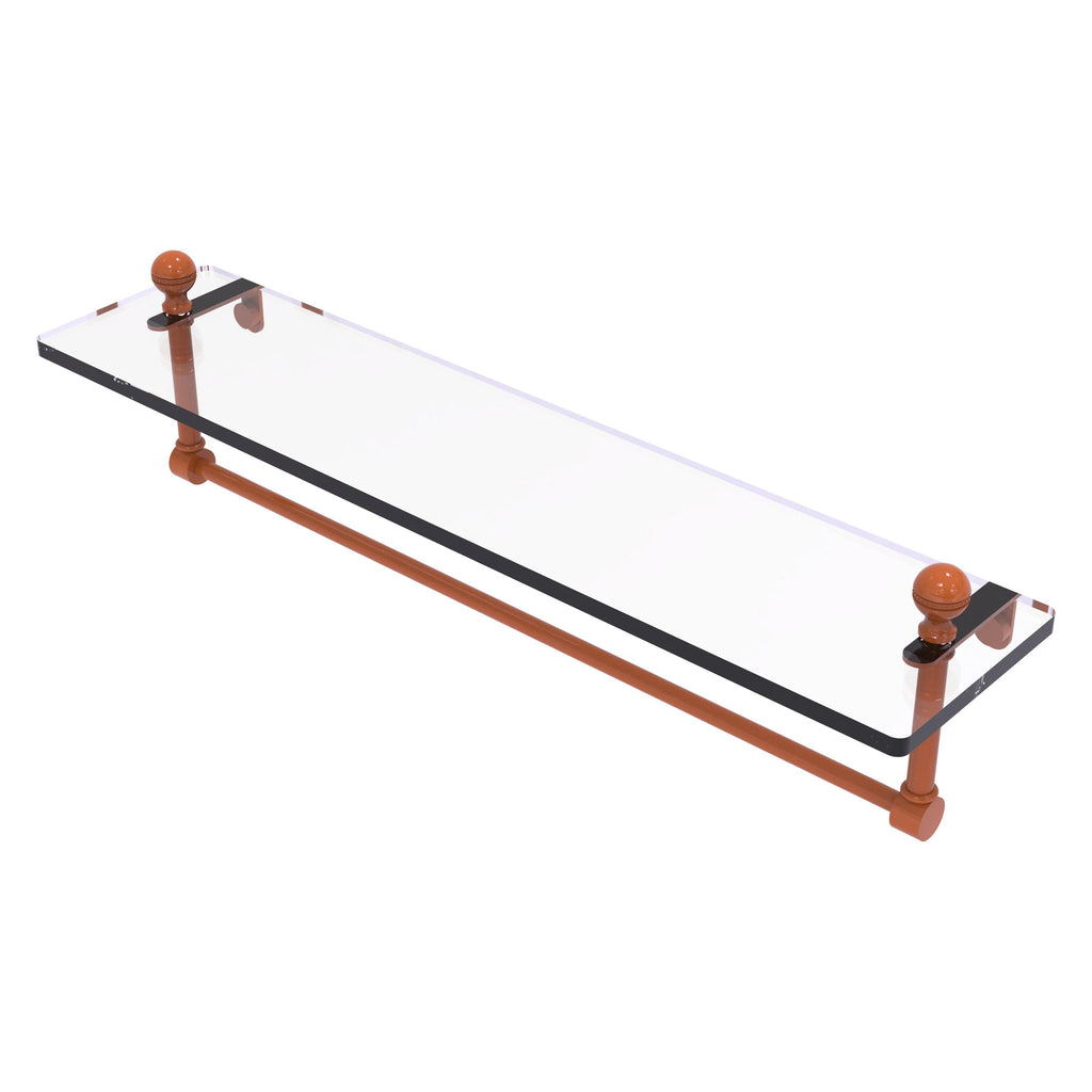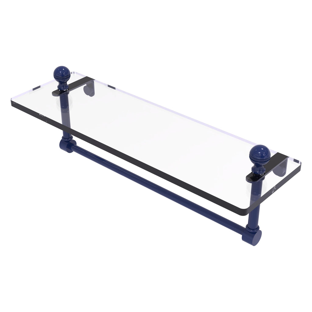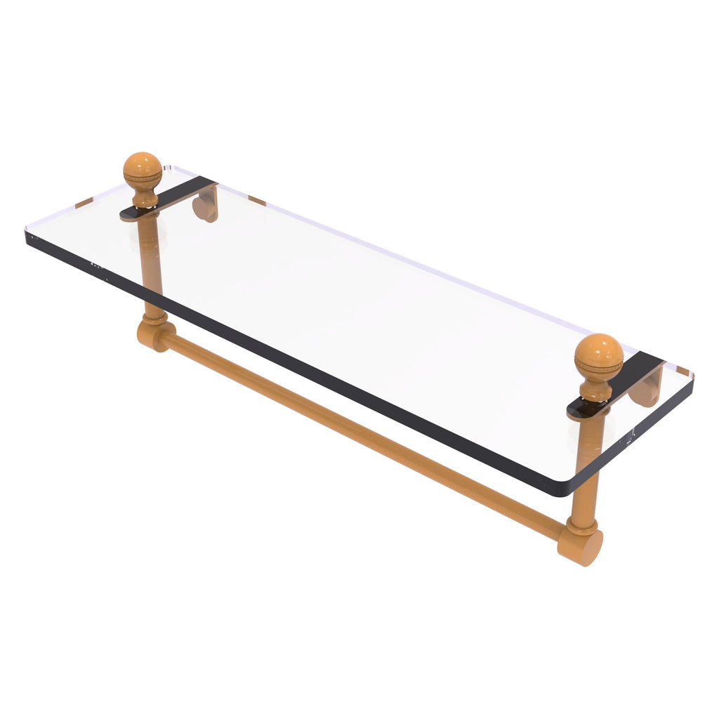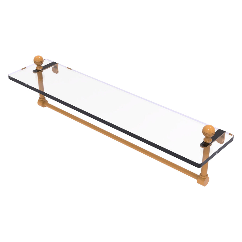 Add space and organization to your bathroom with this simple, contemporary style glass shelf. Featuring tempered, beveled-edged glass and solid brass hardware this shelf is crafted for durability, strength and style. One of the many coordinating accessories in the Allied Brass Mambo Collection, this subtle glass shelf is the perfect complement to your bathroom decor.