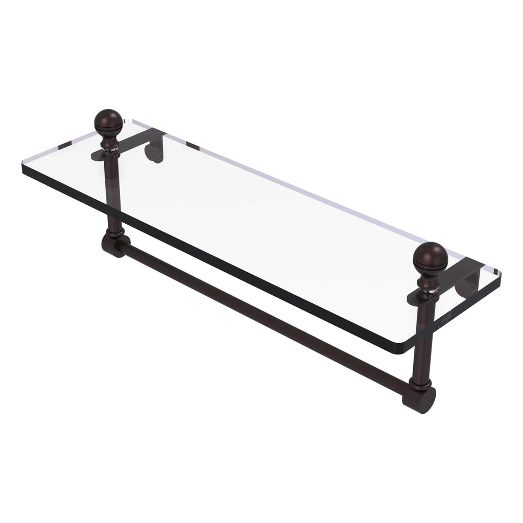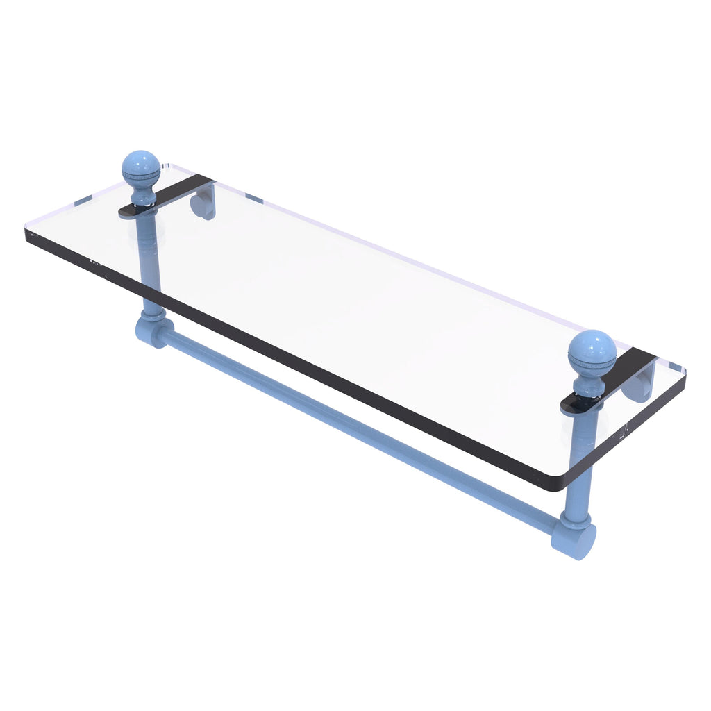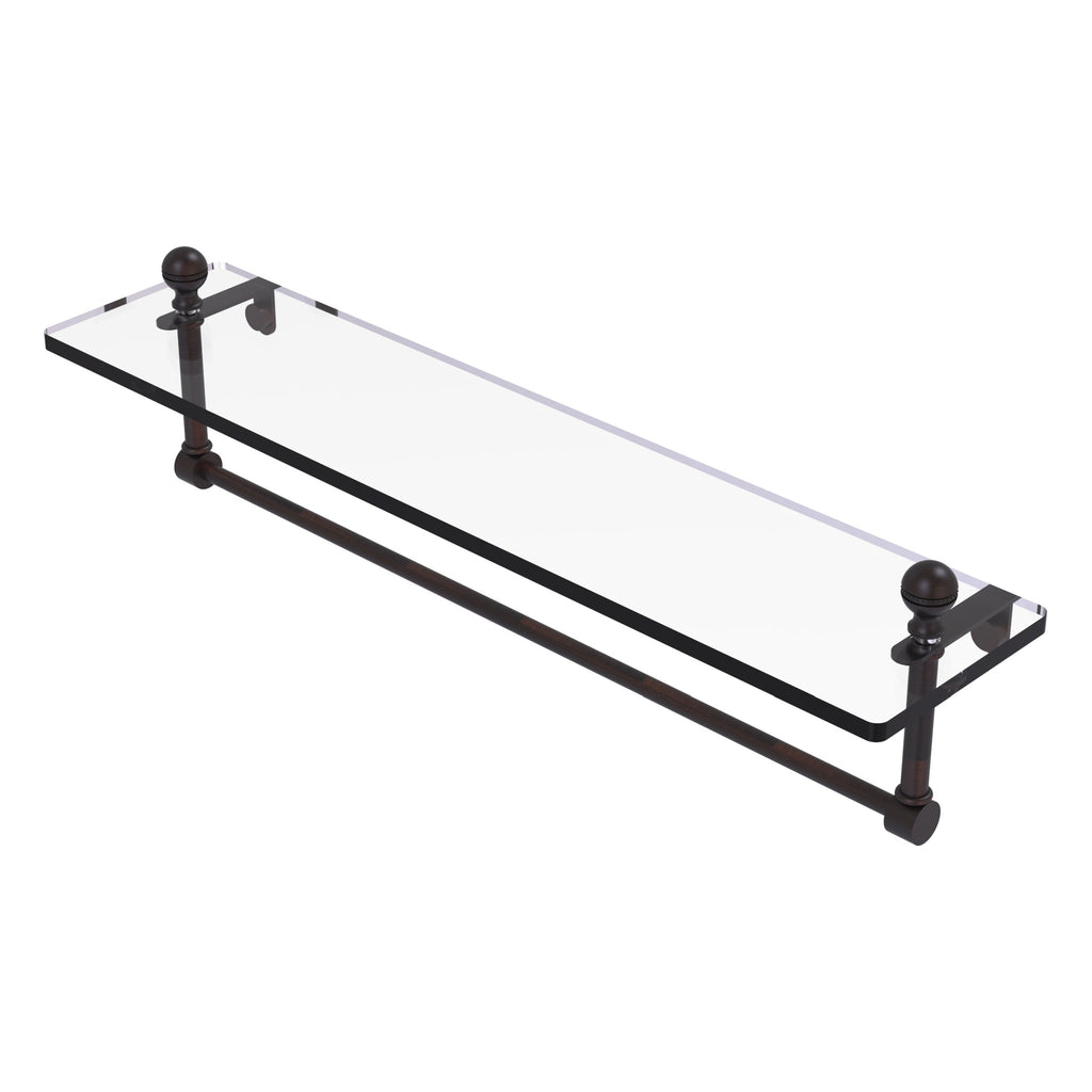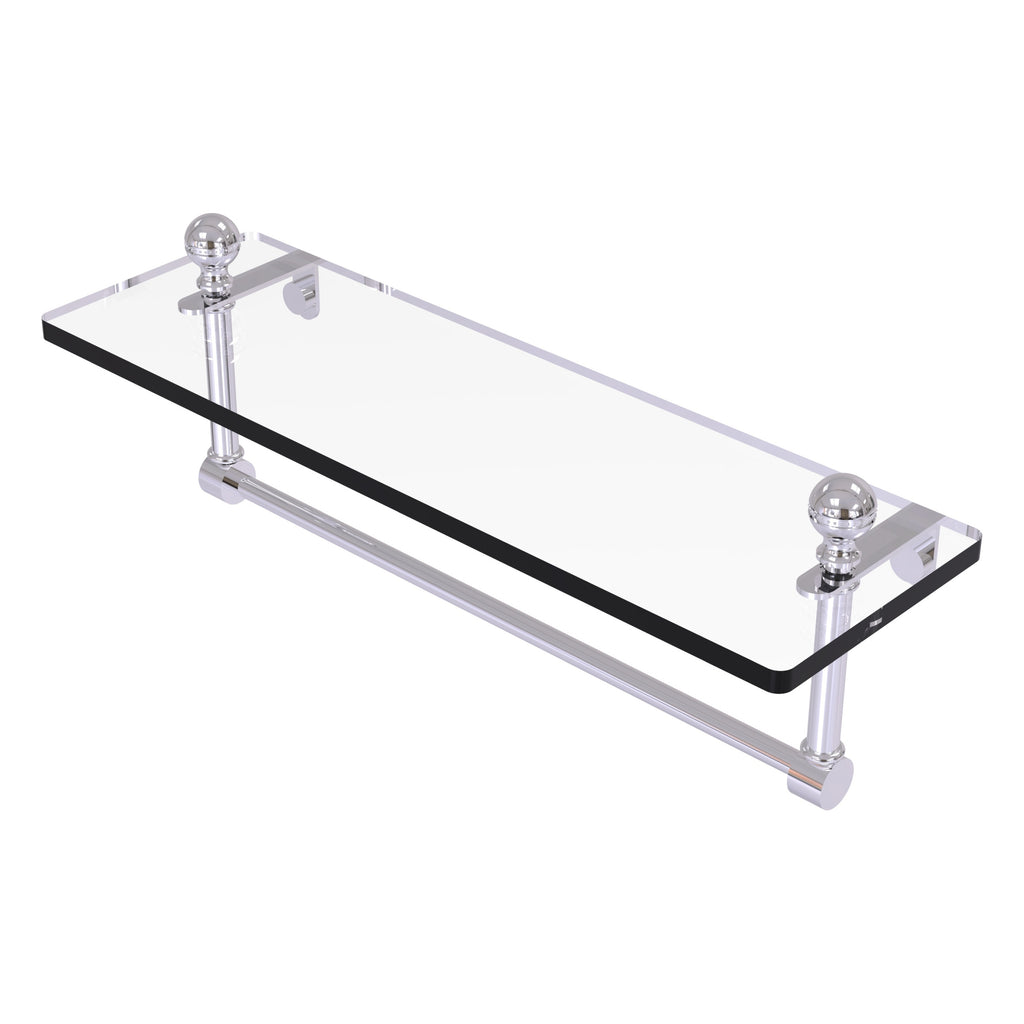 Add space and organization to your bathroom with this simple, contemporary style glass shelf. Featuring tempered, beveled-edged glass and solid brass hardware this shelf is crafted for durability, strength and style. One of the many coordinating accessories in the Allied Brass Mambo Collection, this subtle glass shelf is the perfect complement to your bathroom decor.