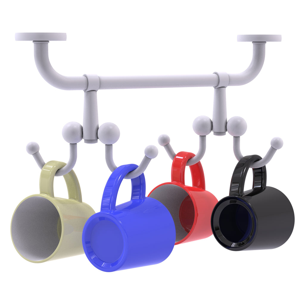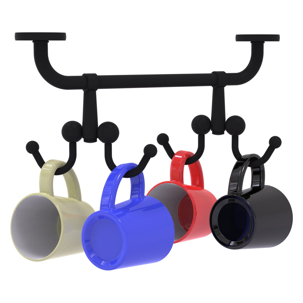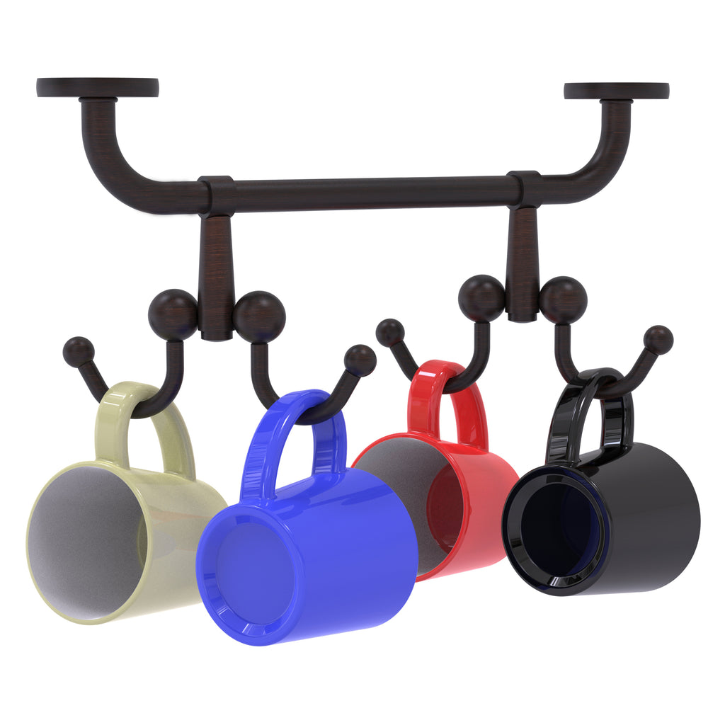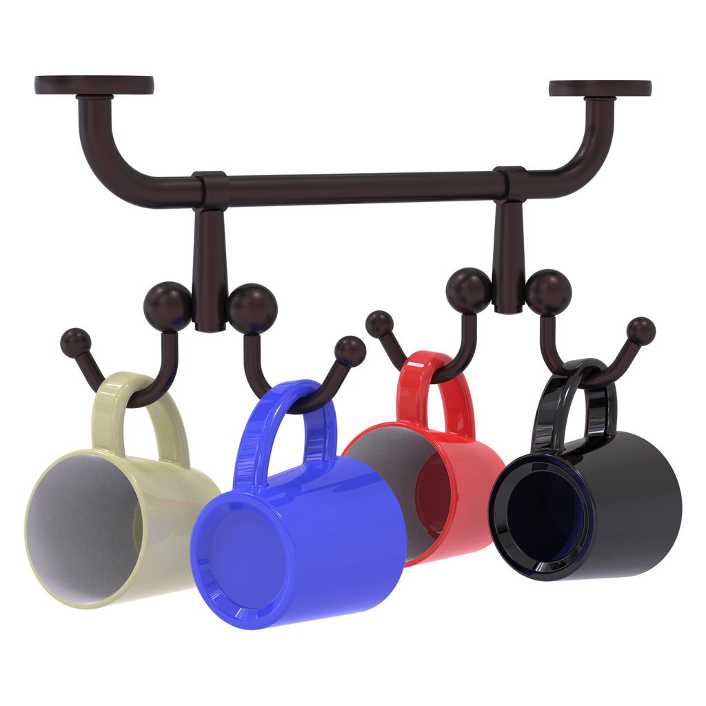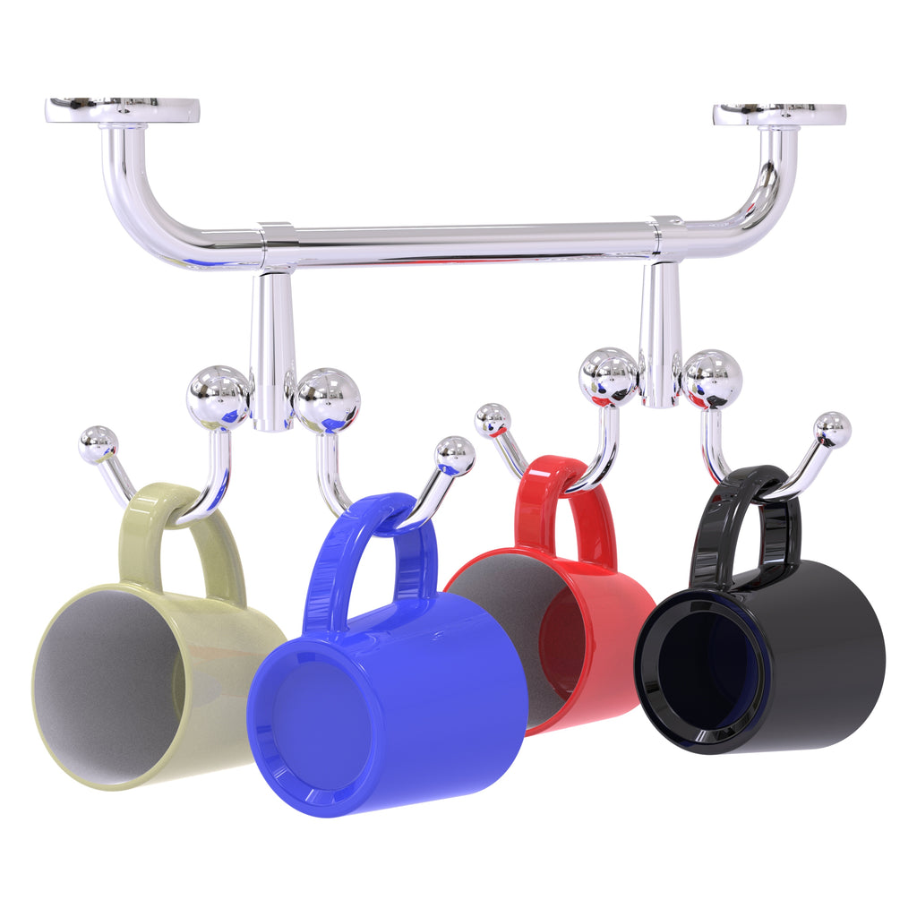 Add an elegant bistro look to your kitchen by proudly displaying your favorite coffee mugs on this decorative under cabinet mount 4 mug rack. The rack can be installed strategically on the underside of your cabinets making it both a focal point and a space saving convenience. Just grab your favorite mug for that first quick cup in the morning and you're off and running. Its sleek design blends with a variety of decors from modern to eclectic. The rack is available in a wide variety of beautiful decorative finishes and coated guaranteeing it to be free from corrosion. Mugs not included with rack.